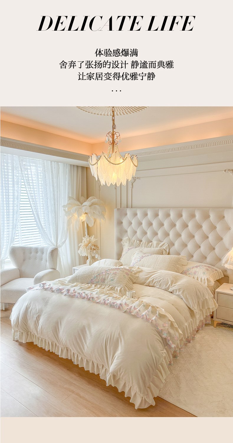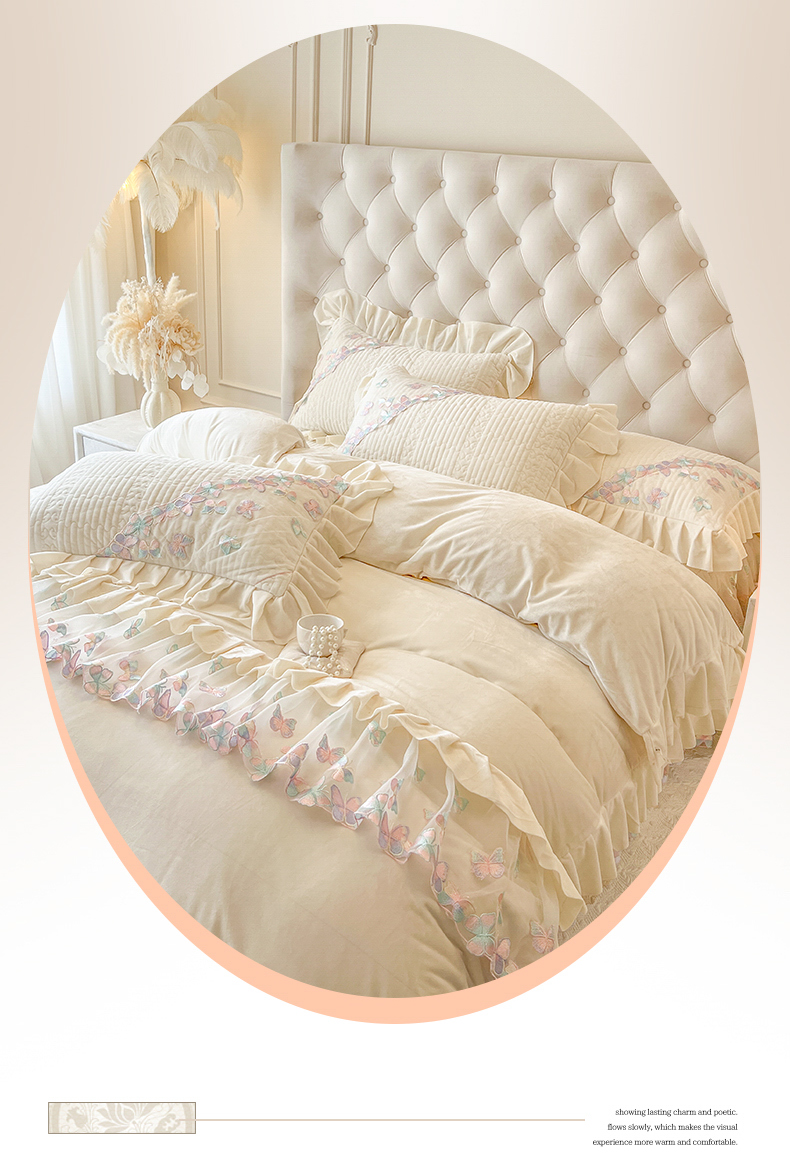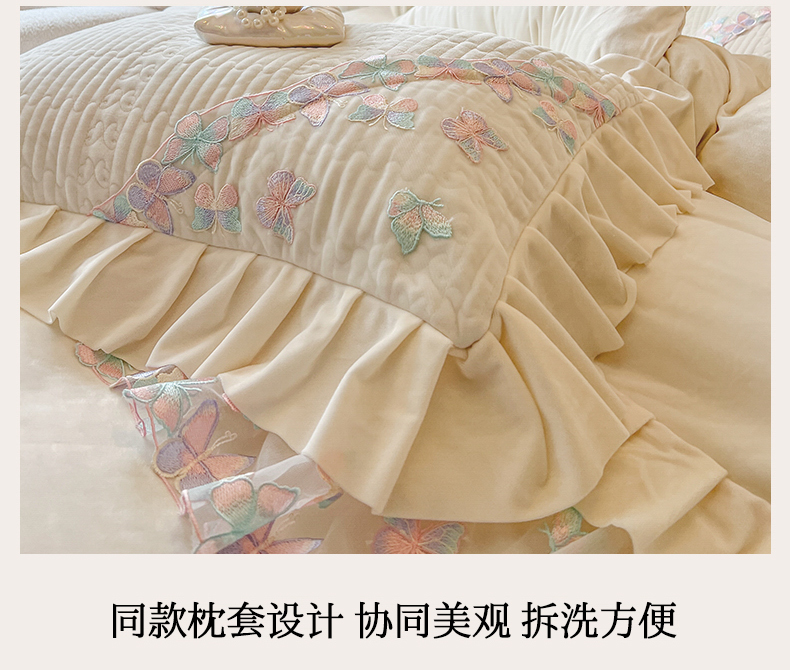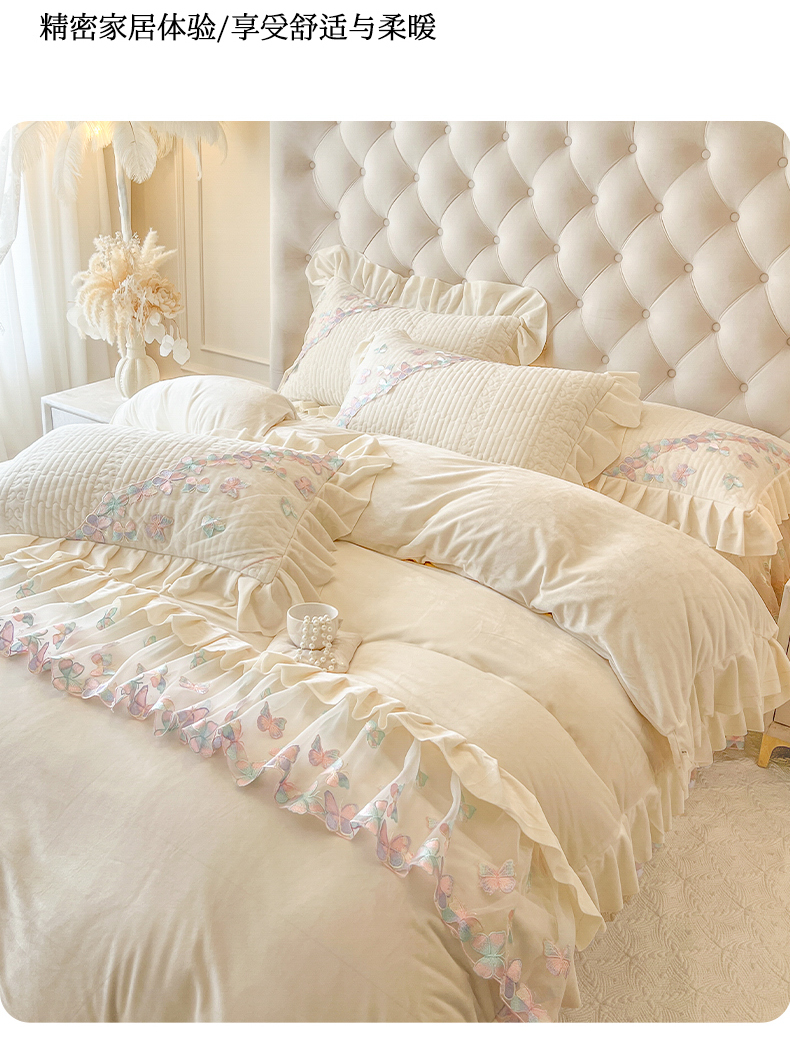 商品名称:瑞宝 2025新款宝宝绒重工刺绣花边床裙四件套-梦蝶 梦蝶-奶油米(控价 318起)