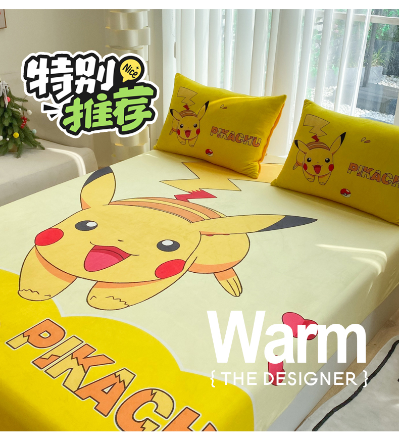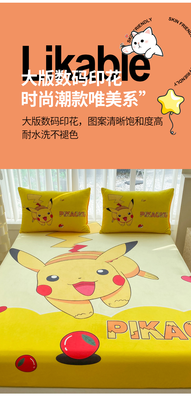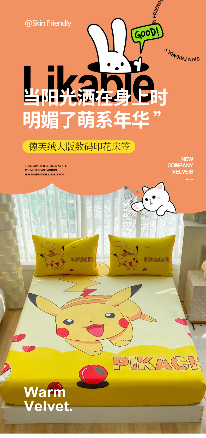• 91家纺网 家纺一手货源 找家纺 一电 2025新款跨境电商床笠冬天德芙绒床笠单件加绒加厚绒床罩儿童学生宿舍床垫套床笠罩 奔跑皮卡丘