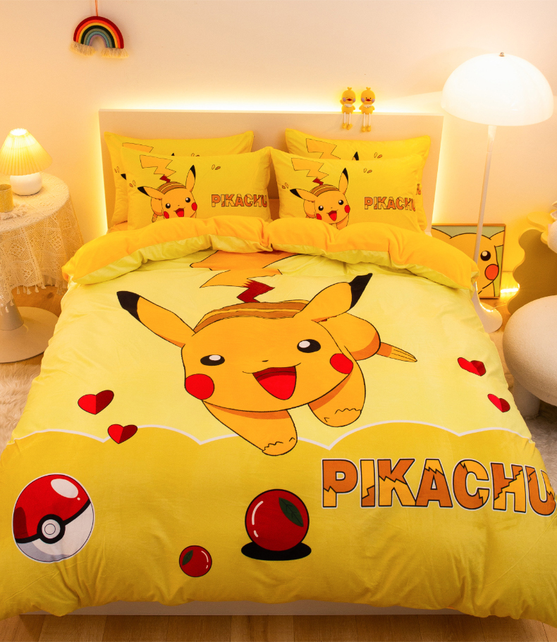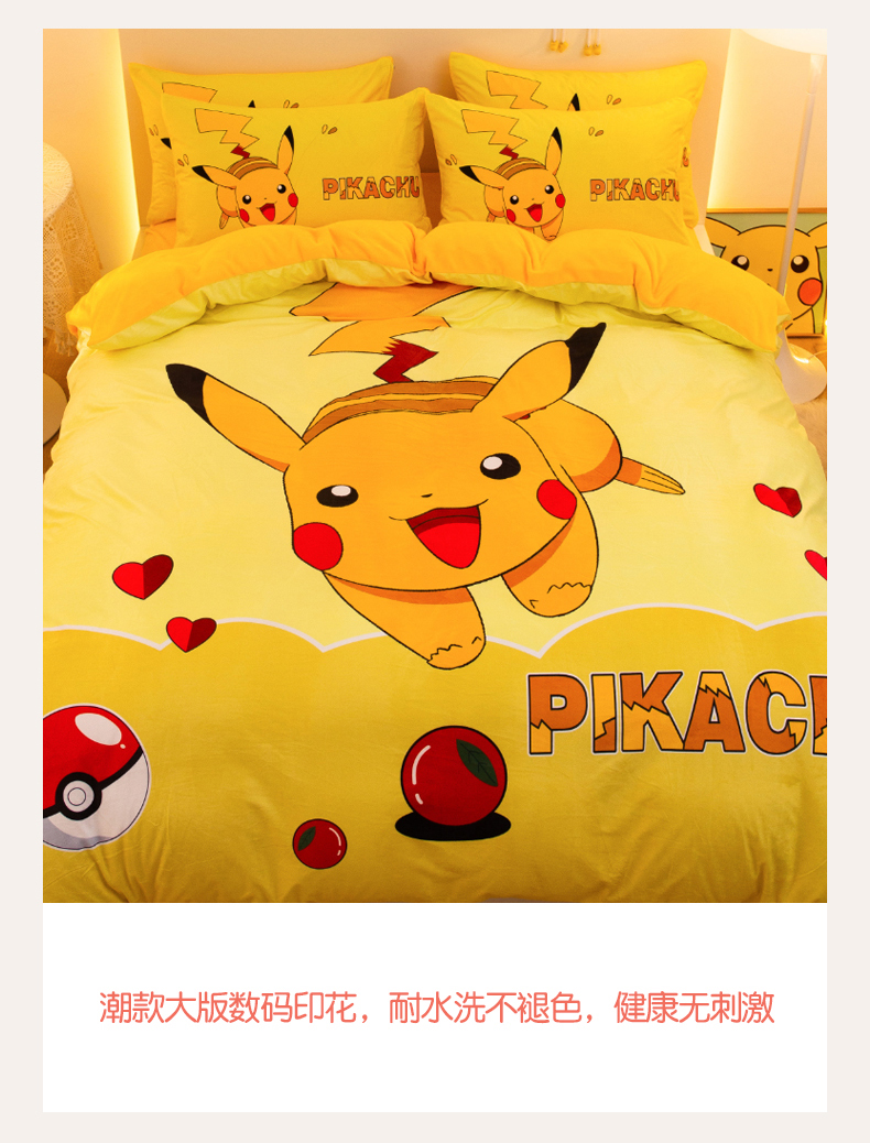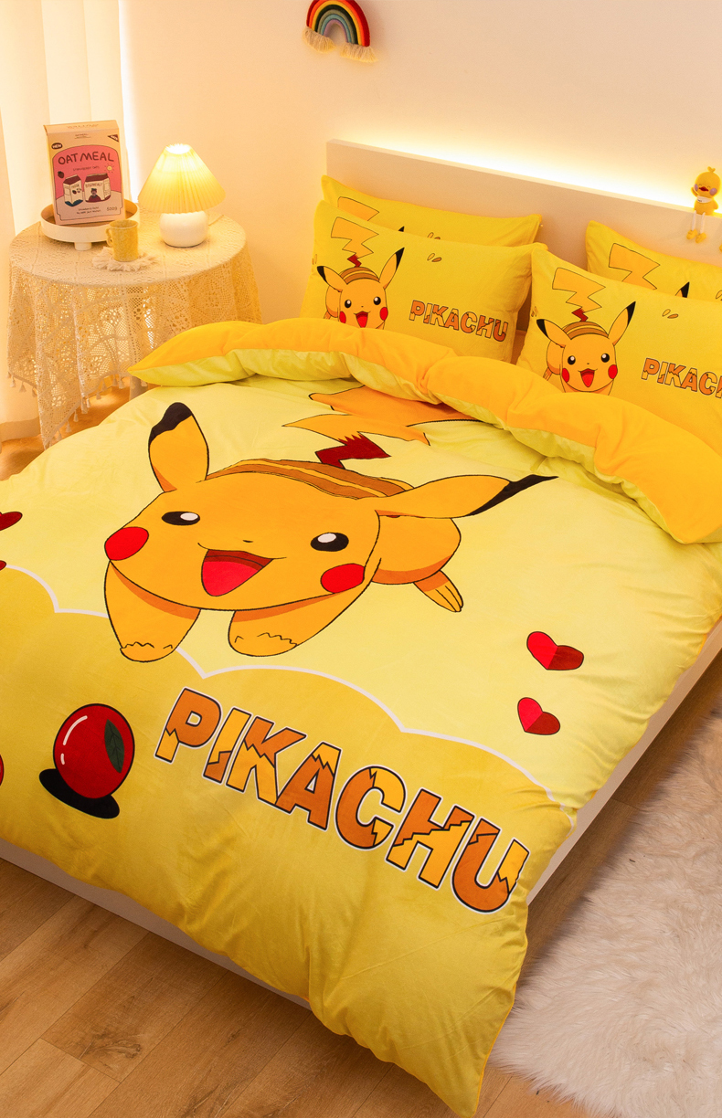 一电 2025外贸跨境电商儿童卡通床上四件套亲肤牛奶绒学生三件床单被套加大珊瑚宝宝卡通单被套 奔跑皮卡丘