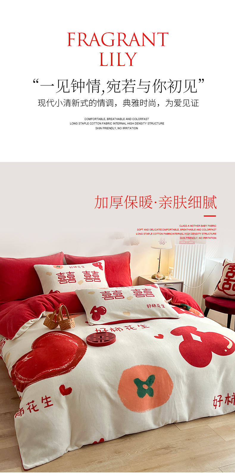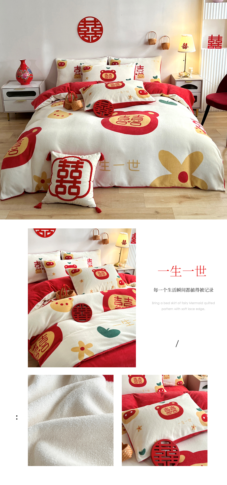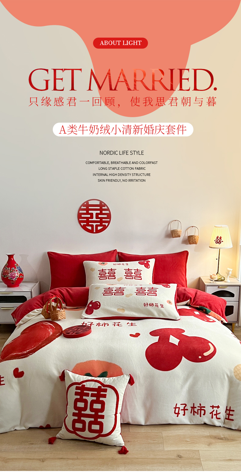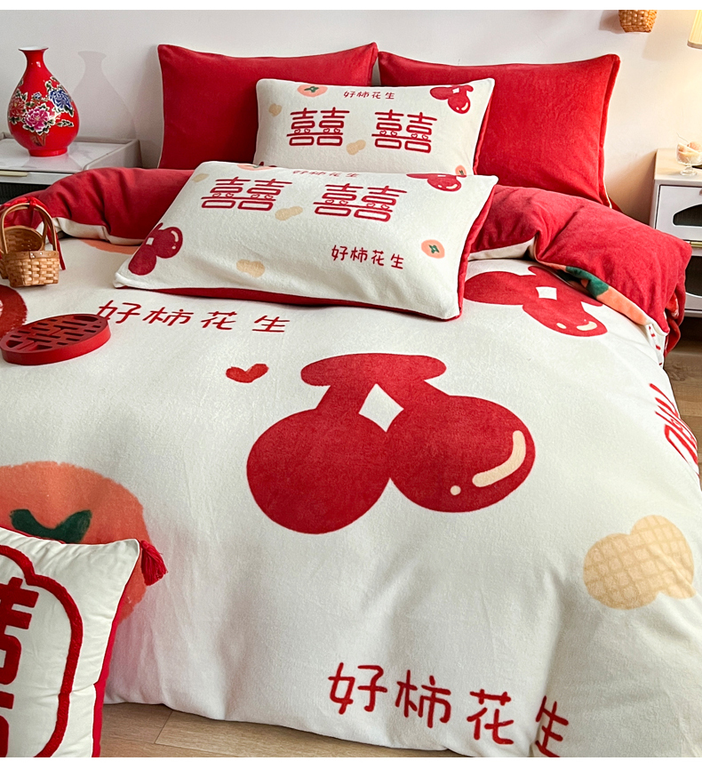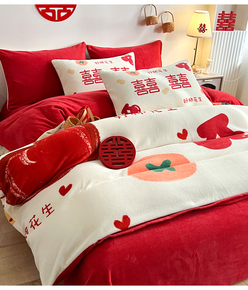 商品名称:一电 2025新款网红花婚庆牛奶绒四件套结婚喜被大红色新婚被罩婚嫁妆被套床单 好柿花生
