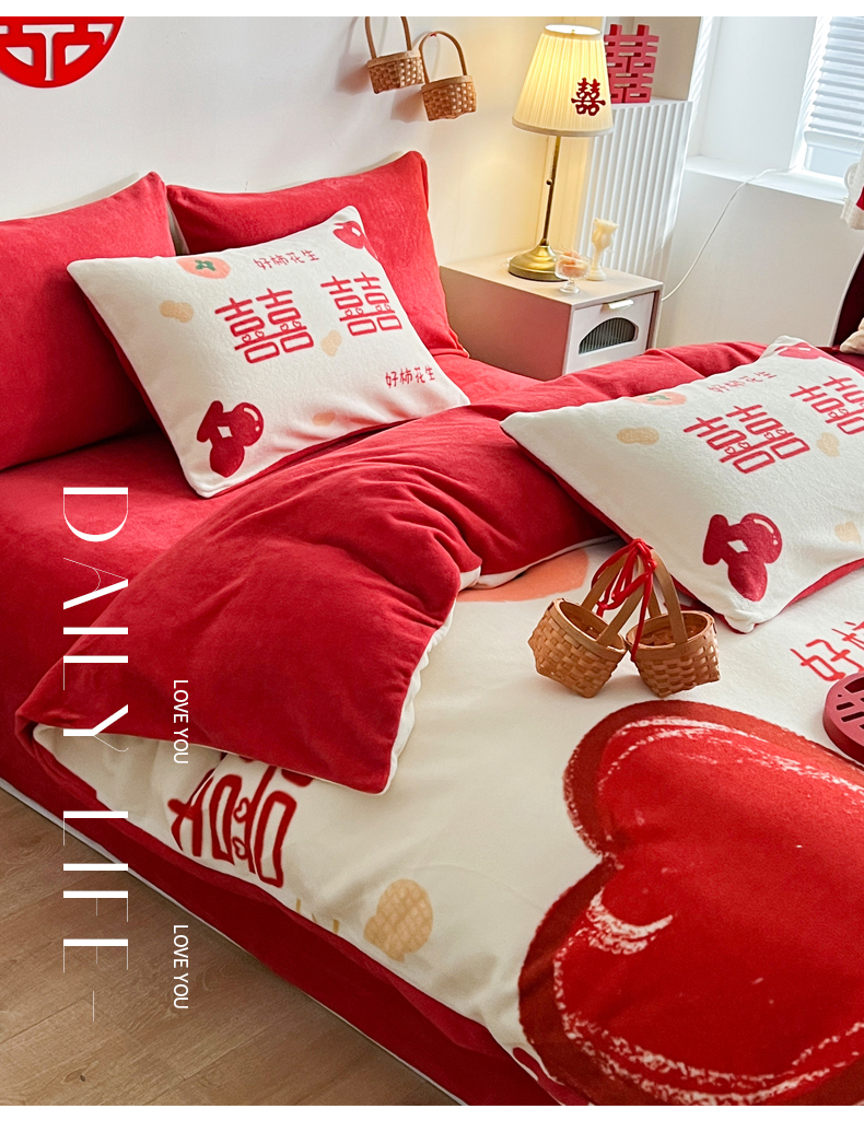 一电 2025新款网红花婚庆牛奶绒四件套结婚喜被大红色新婚被罩婚嫁妆被套床单 好柿花生