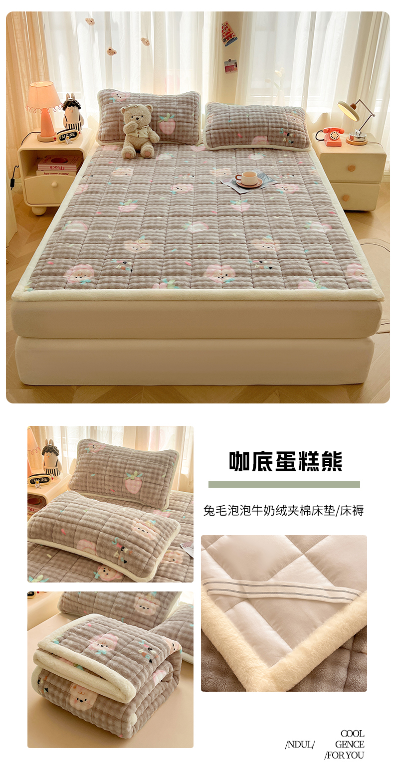 • 91家纺网 家纺一手货源 找家纺 梵朴 2025新款牛奶绒泡泡兔毛绒床垫学生宿舍床褥子床护垫大床款印花系列 咖底蛋糕熊