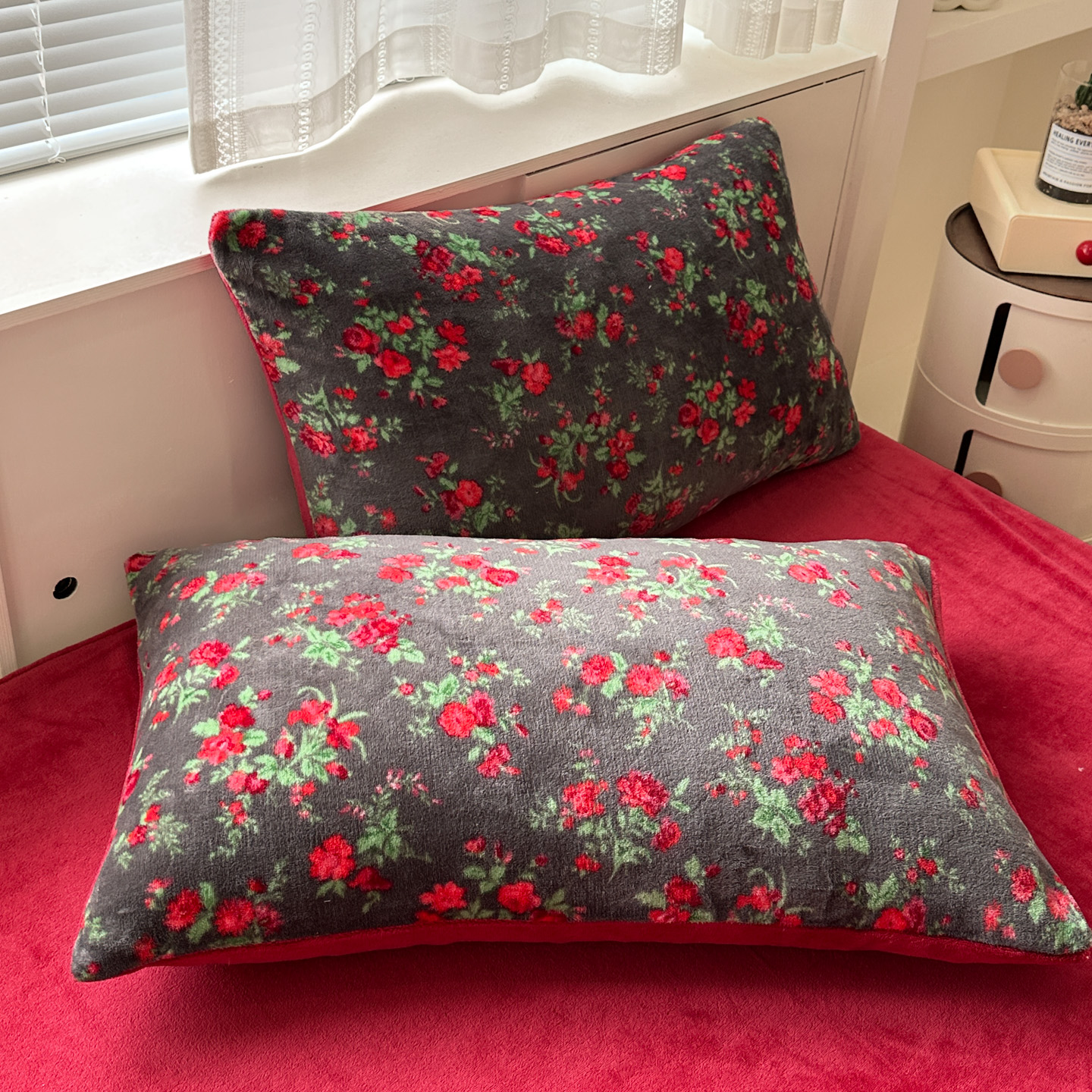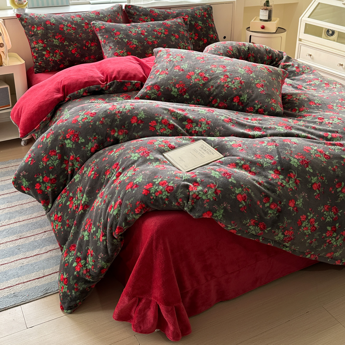 梦莱斯 2025新款加厚保暖双面牛奶绒四件套 玫瑰之约 - 黑