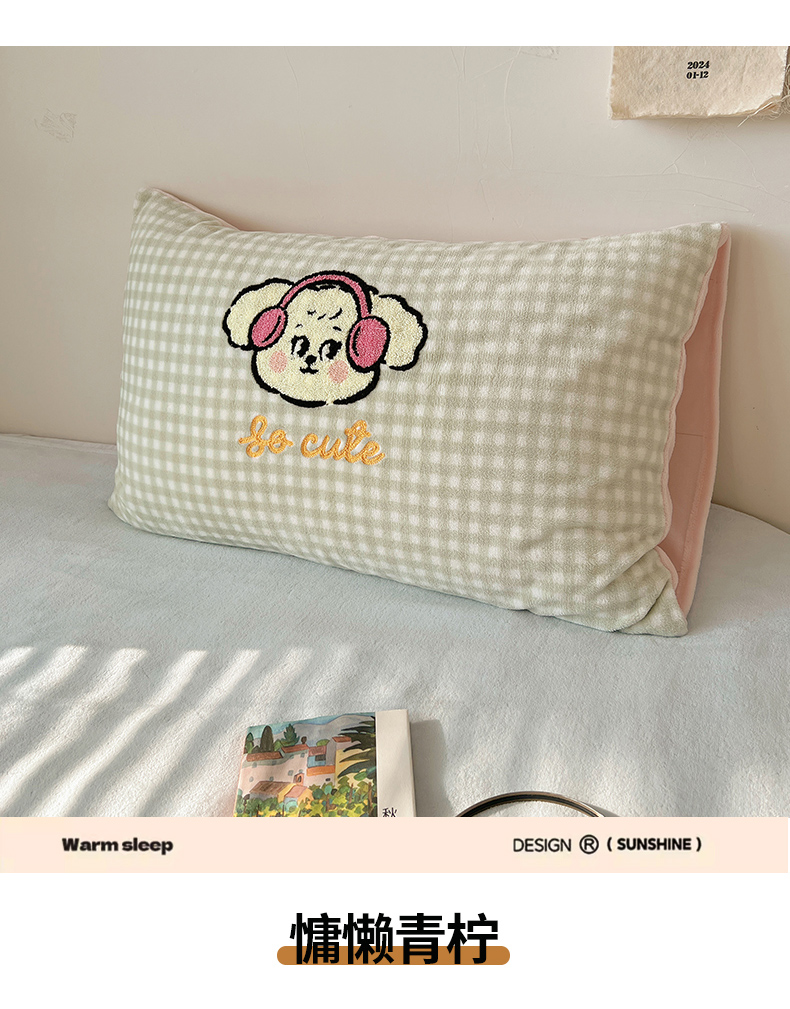 商品名称:轻奢坊 2025新款牛奶绒慵懒格子可爱毛巾绣单品枕套系列 单枕套慵懒青柠