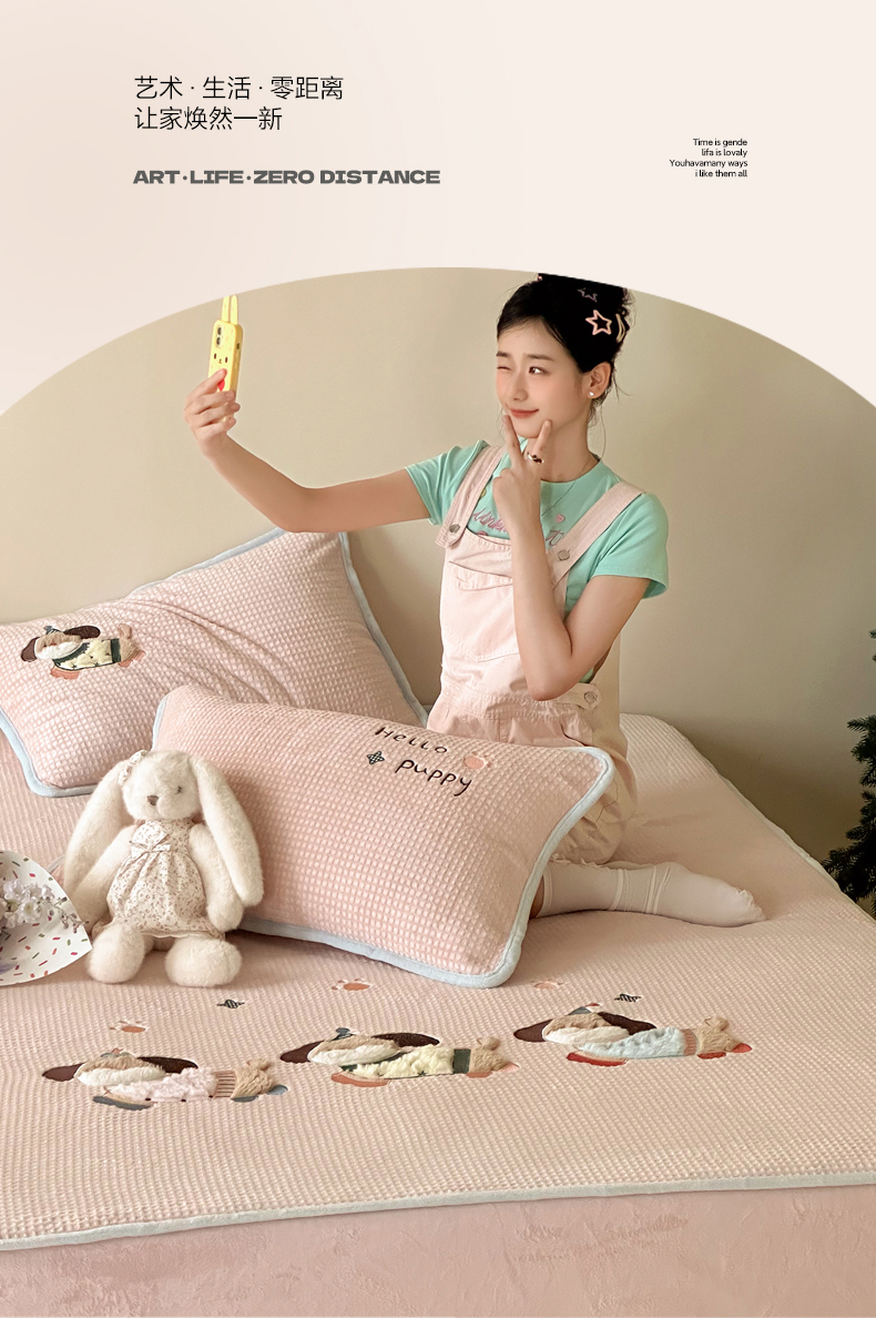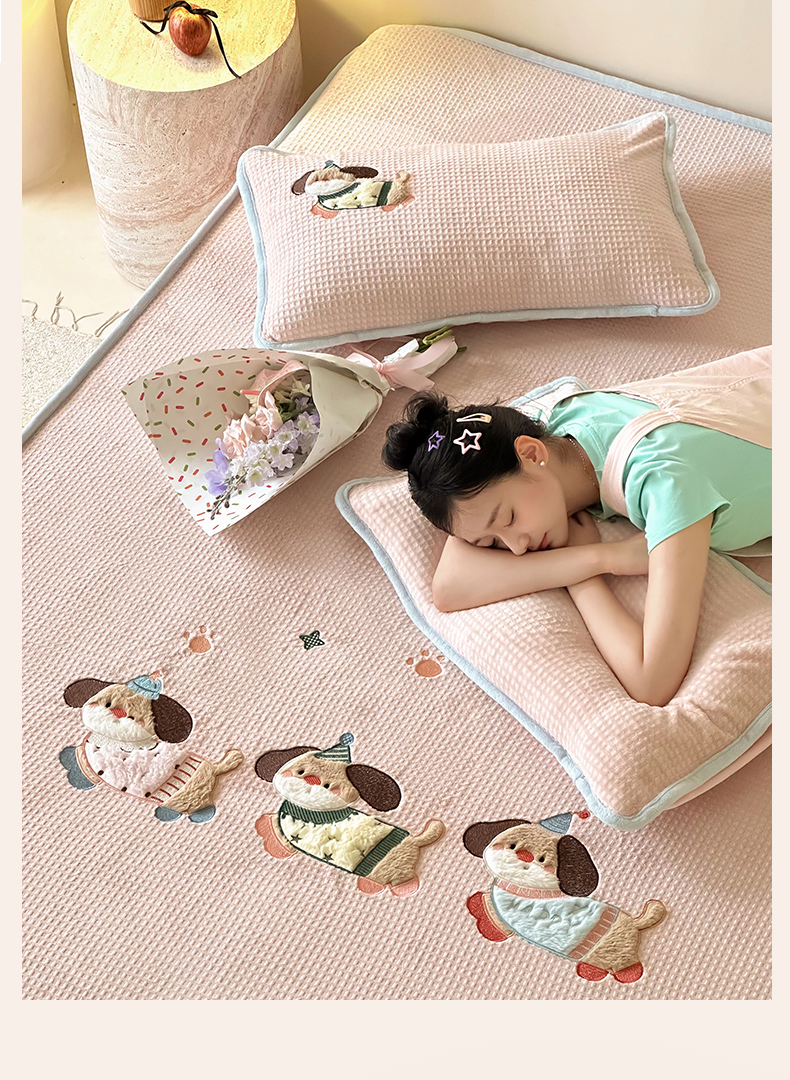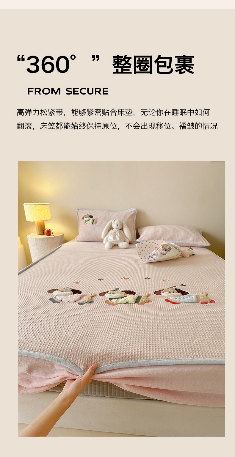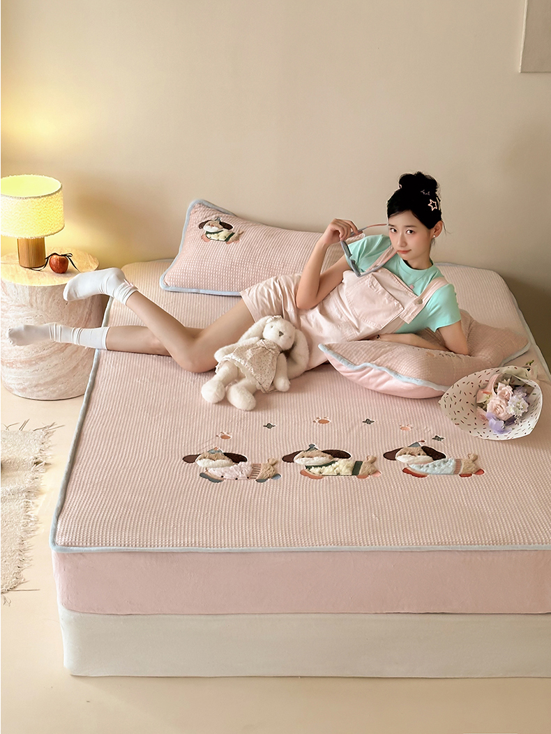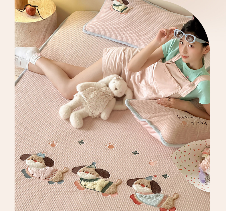 商品名称:Sweet dreams甜梦 2025新款华夫格绒兔毛贴布床笠三件套 三只小狗粉