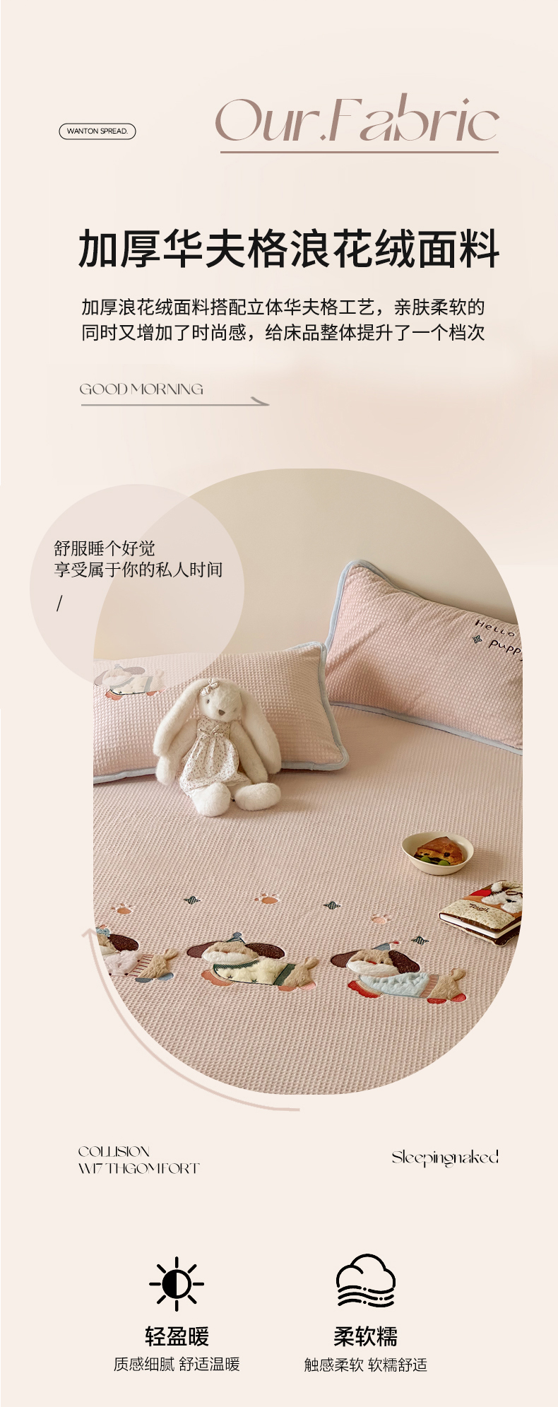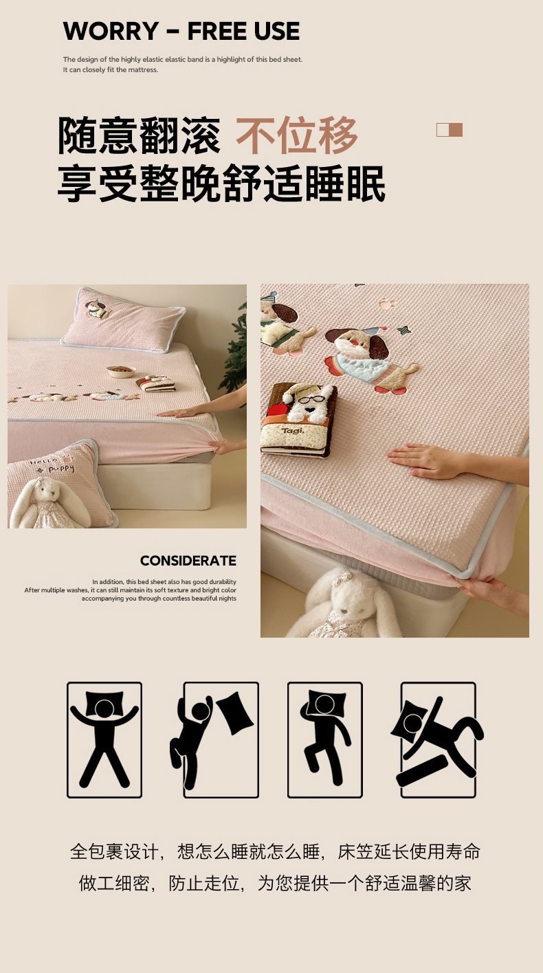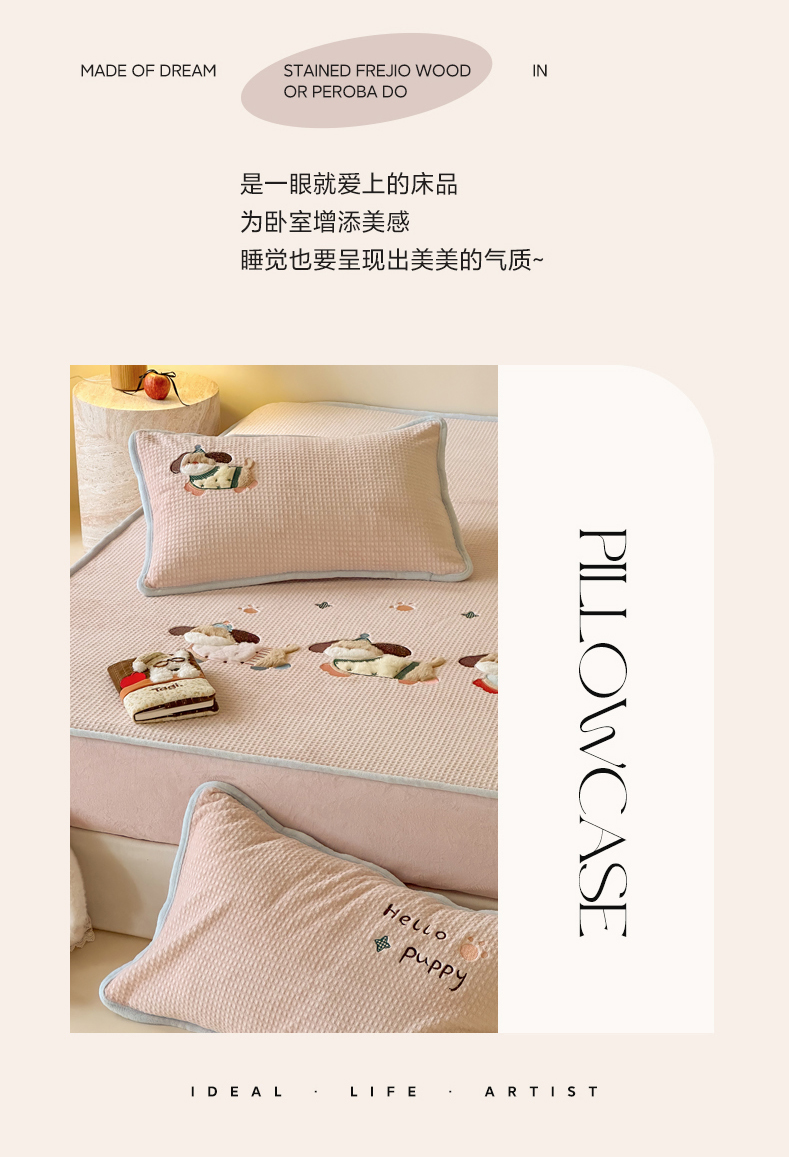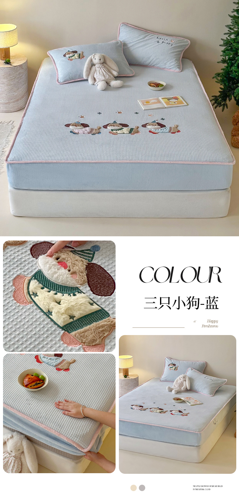 商品名称:Sweet dreams甜梦 2025新款华夫格绒兔毛贴布床笠三件套 三只小狗粉