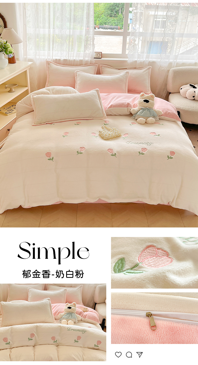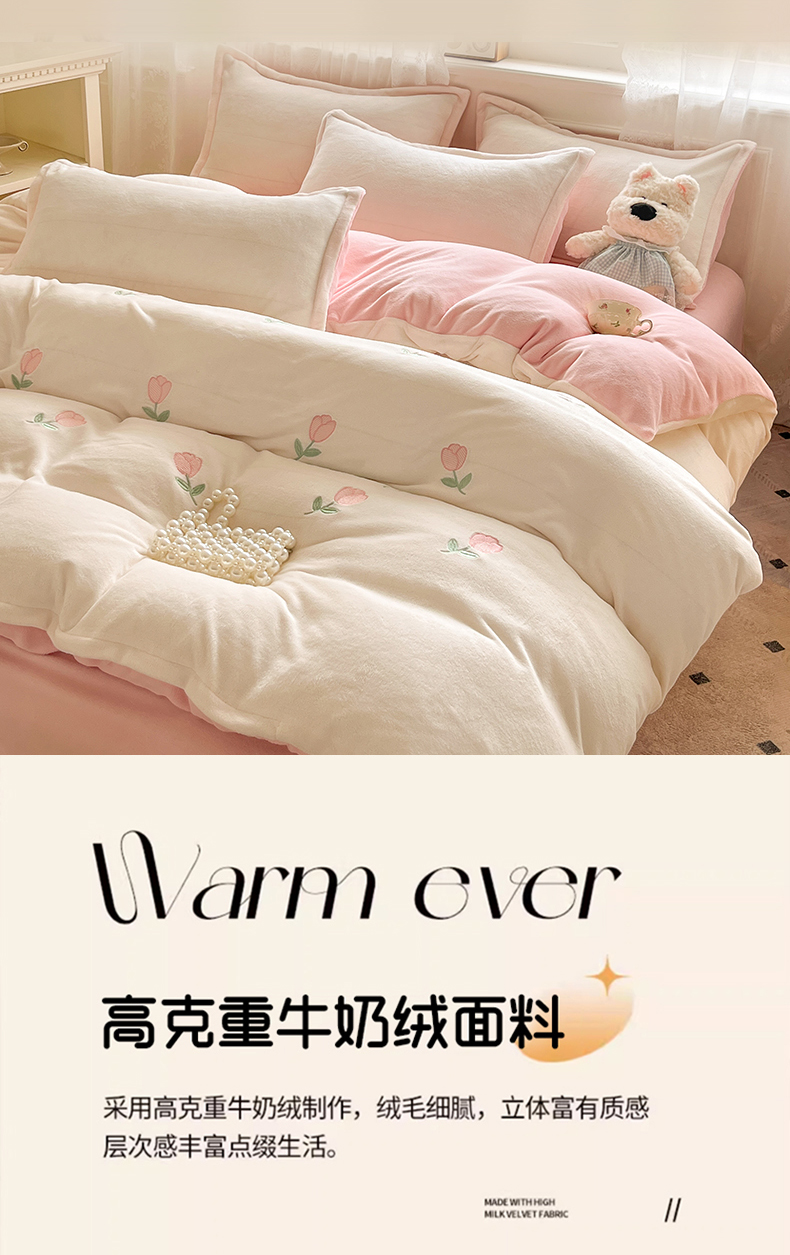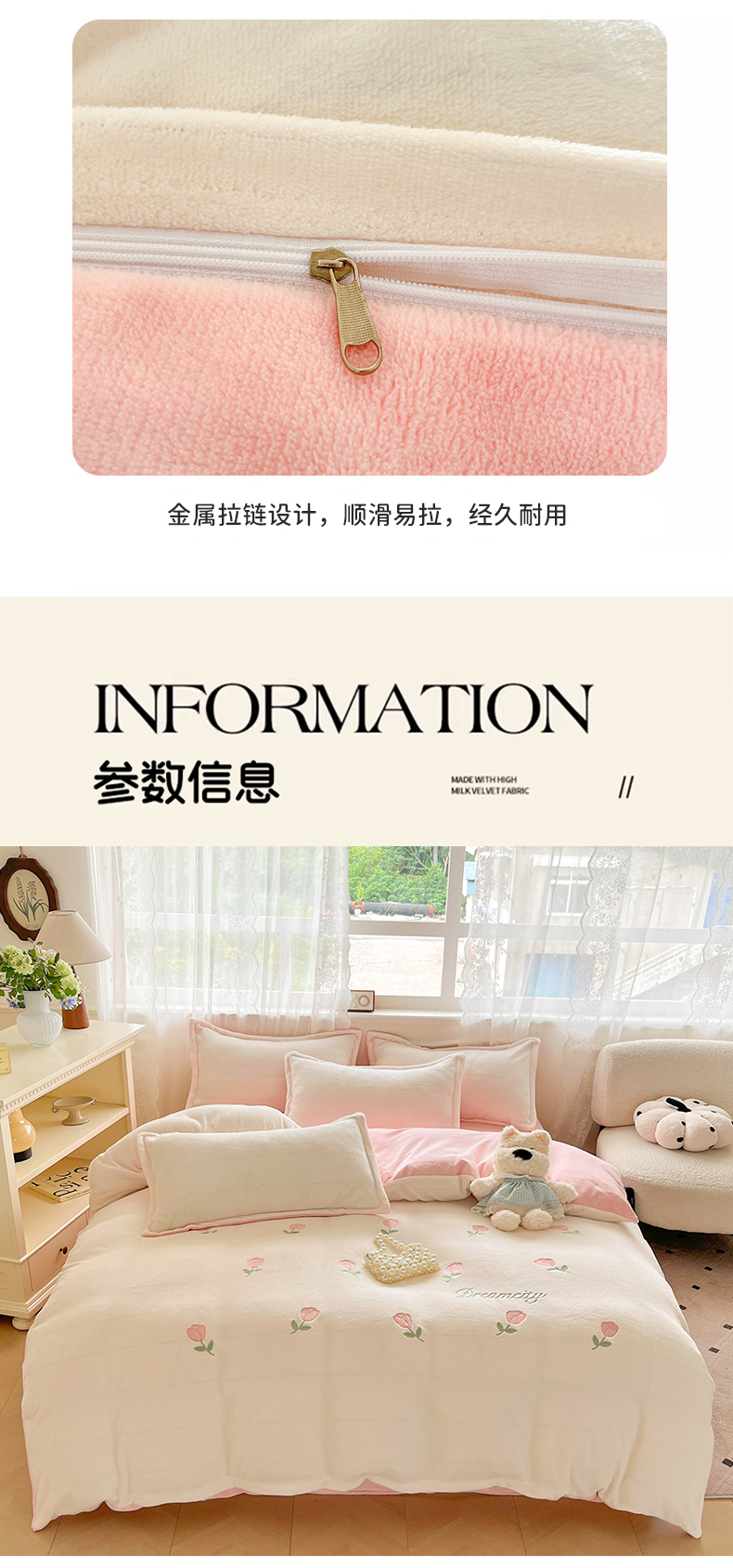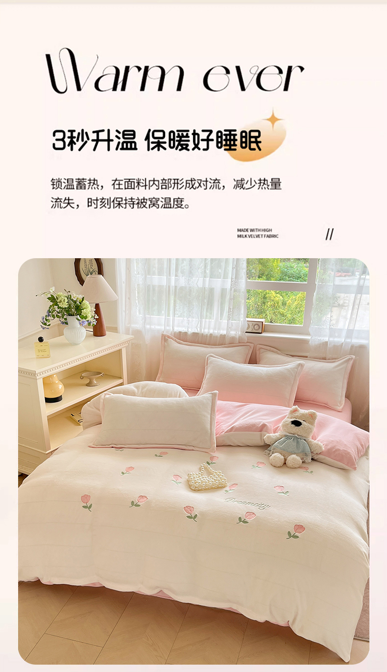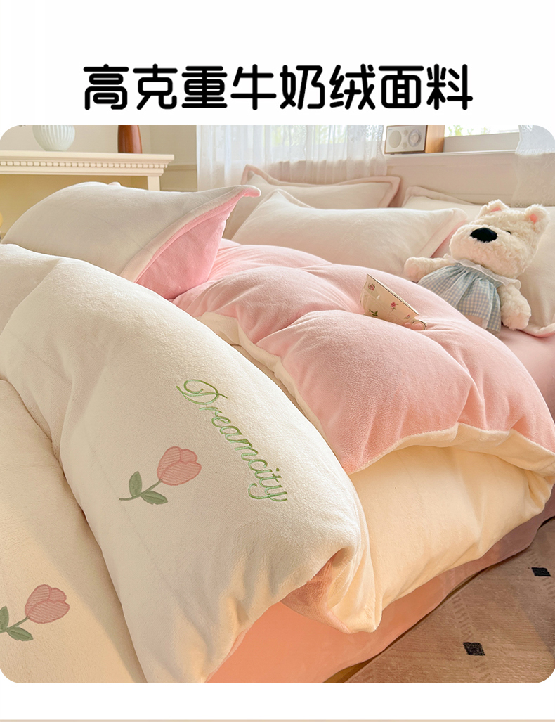 伊梵居2025新款加厚贴布绣牛奶绒四件套 郁金香-奶白粉