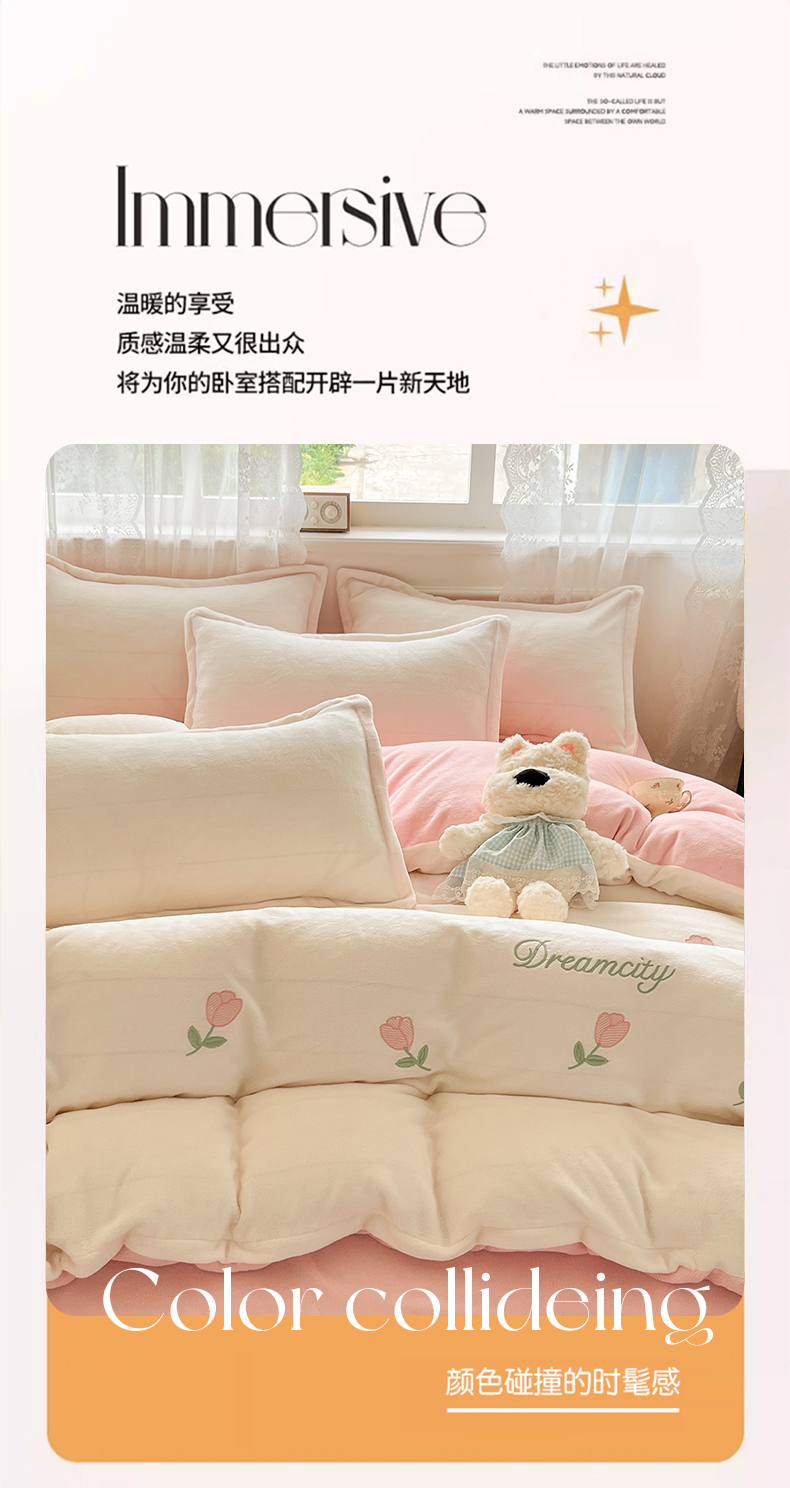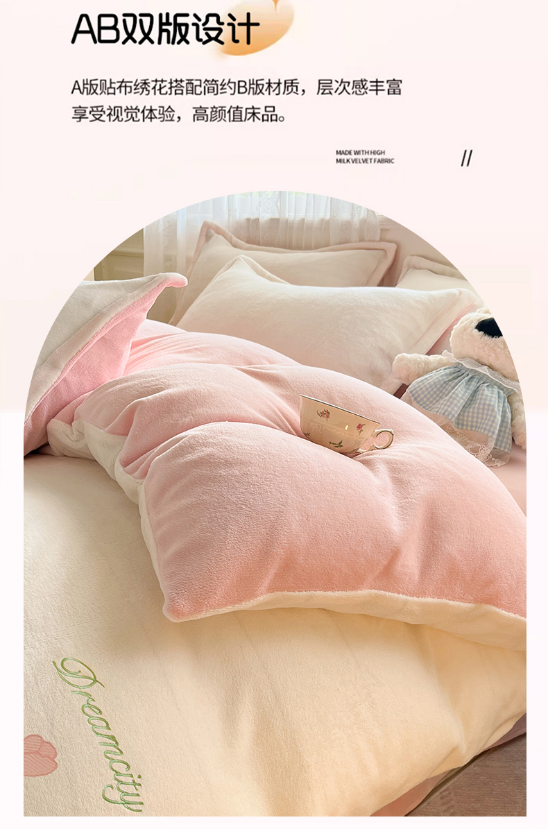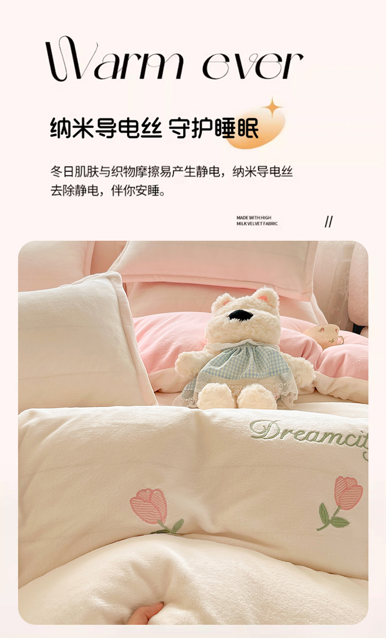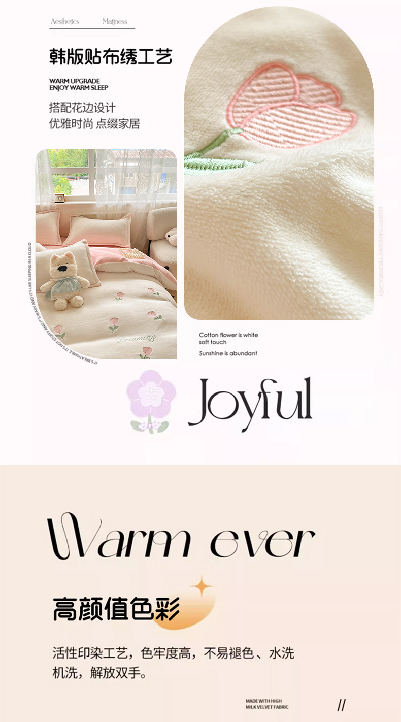 伊梵居2025新款加厚贴布绣牛奶绒四件套 郁金香-奶白粉