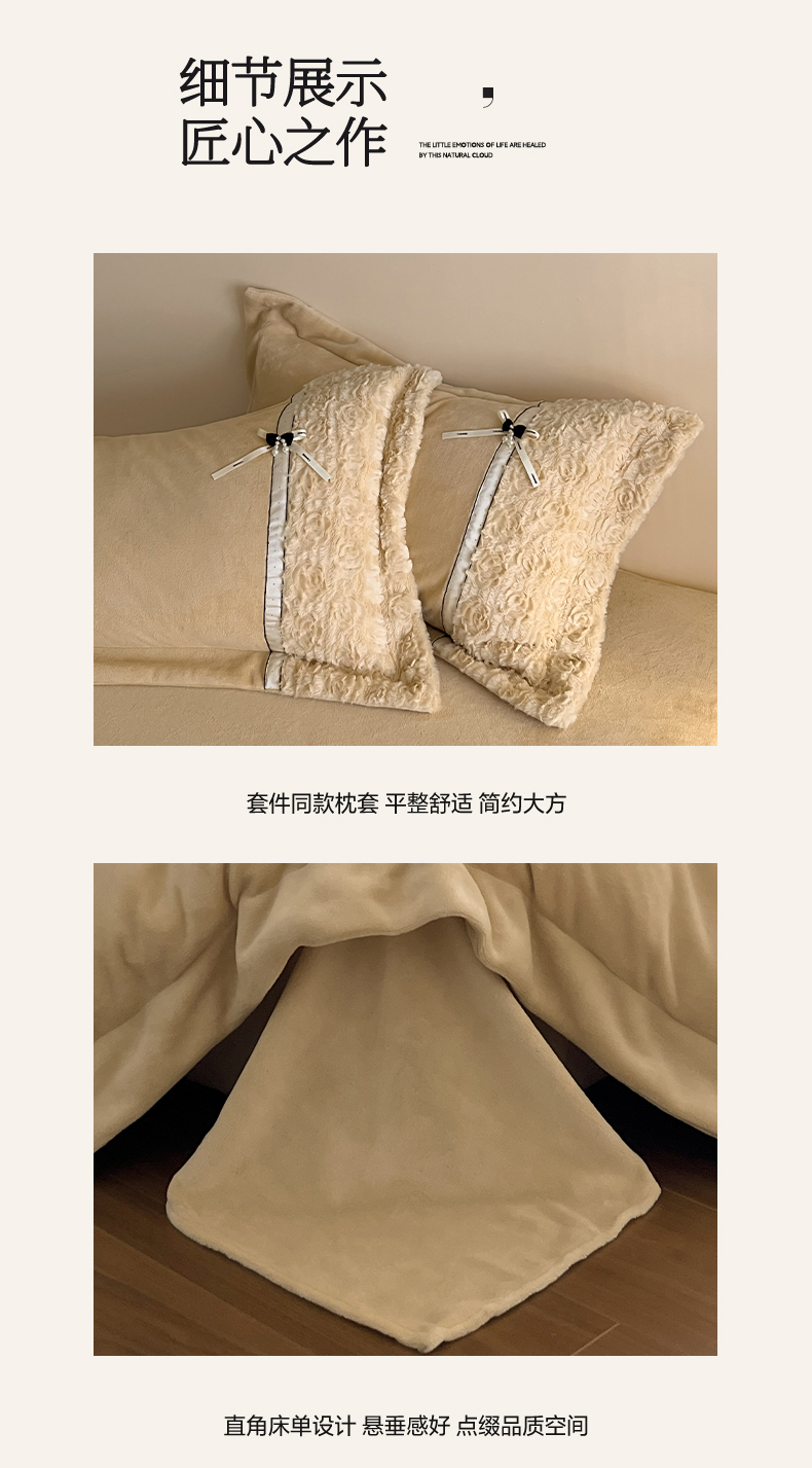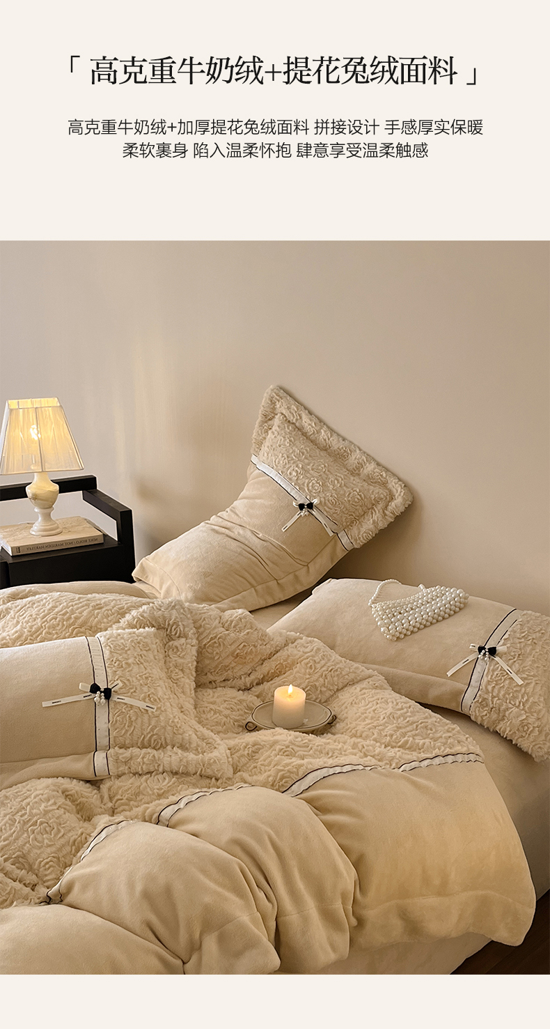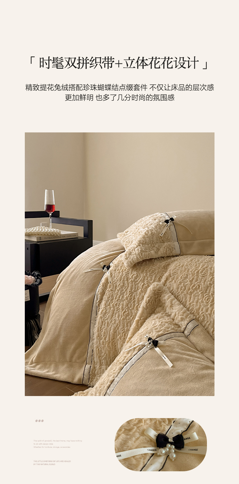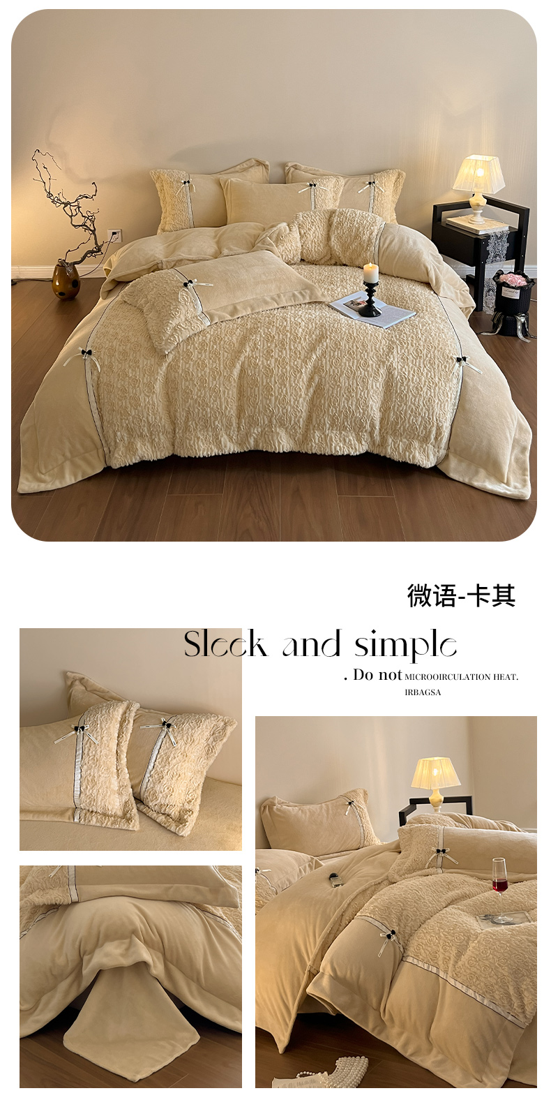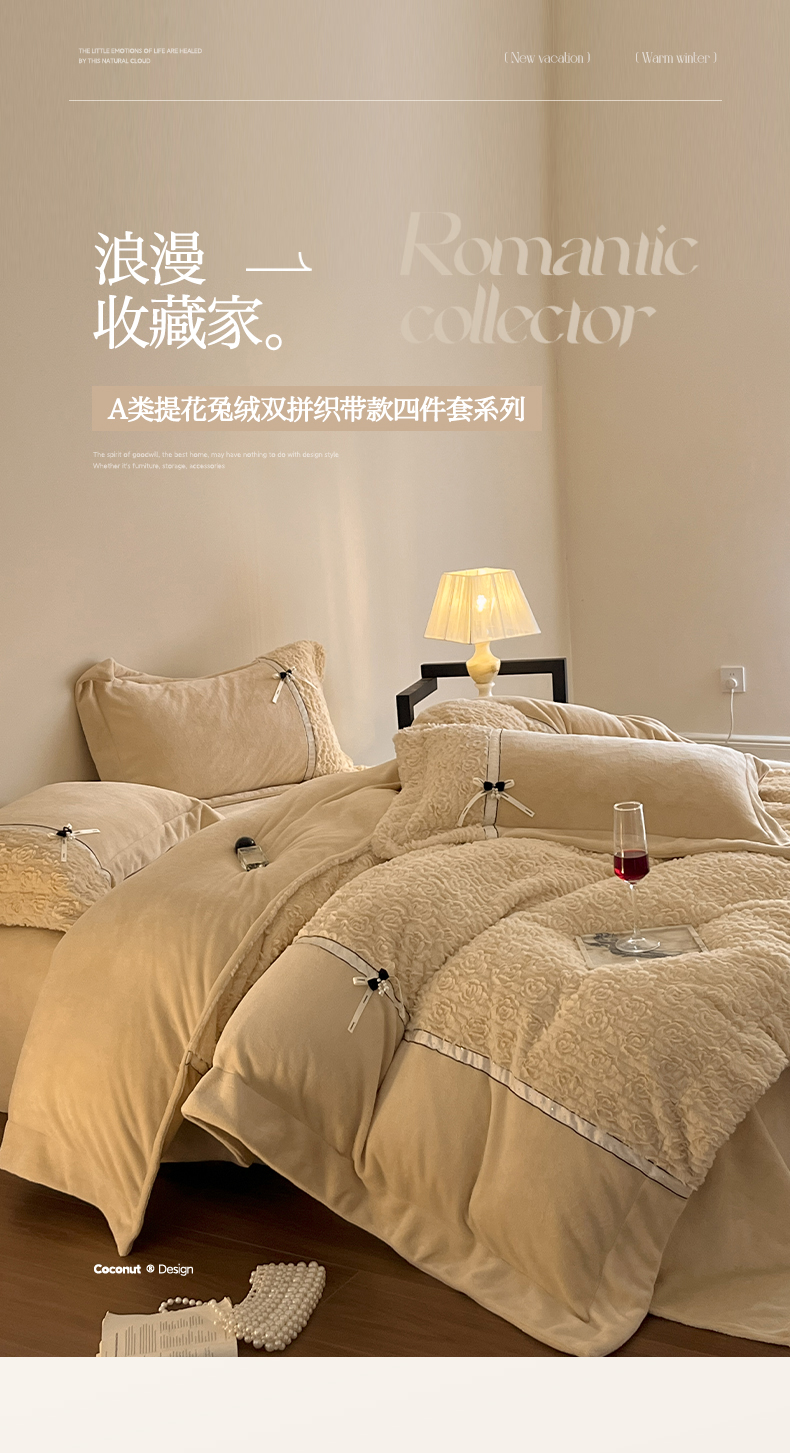 蓝邻家纺 2025新款提花兔绒双拼织带款四件套-微语系列 微语-卡其
