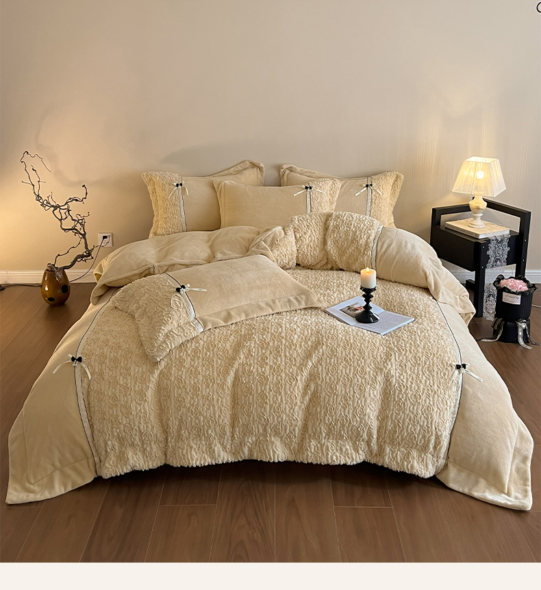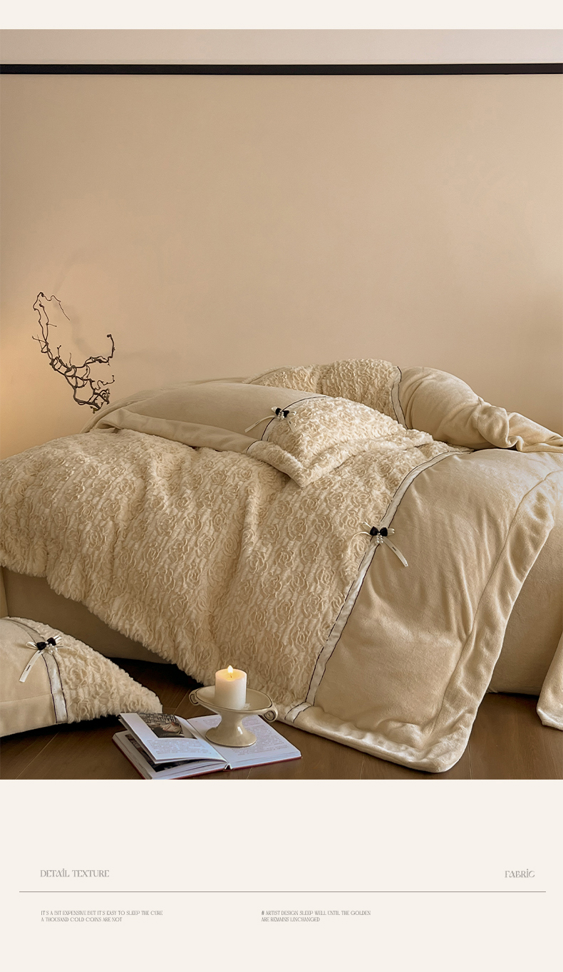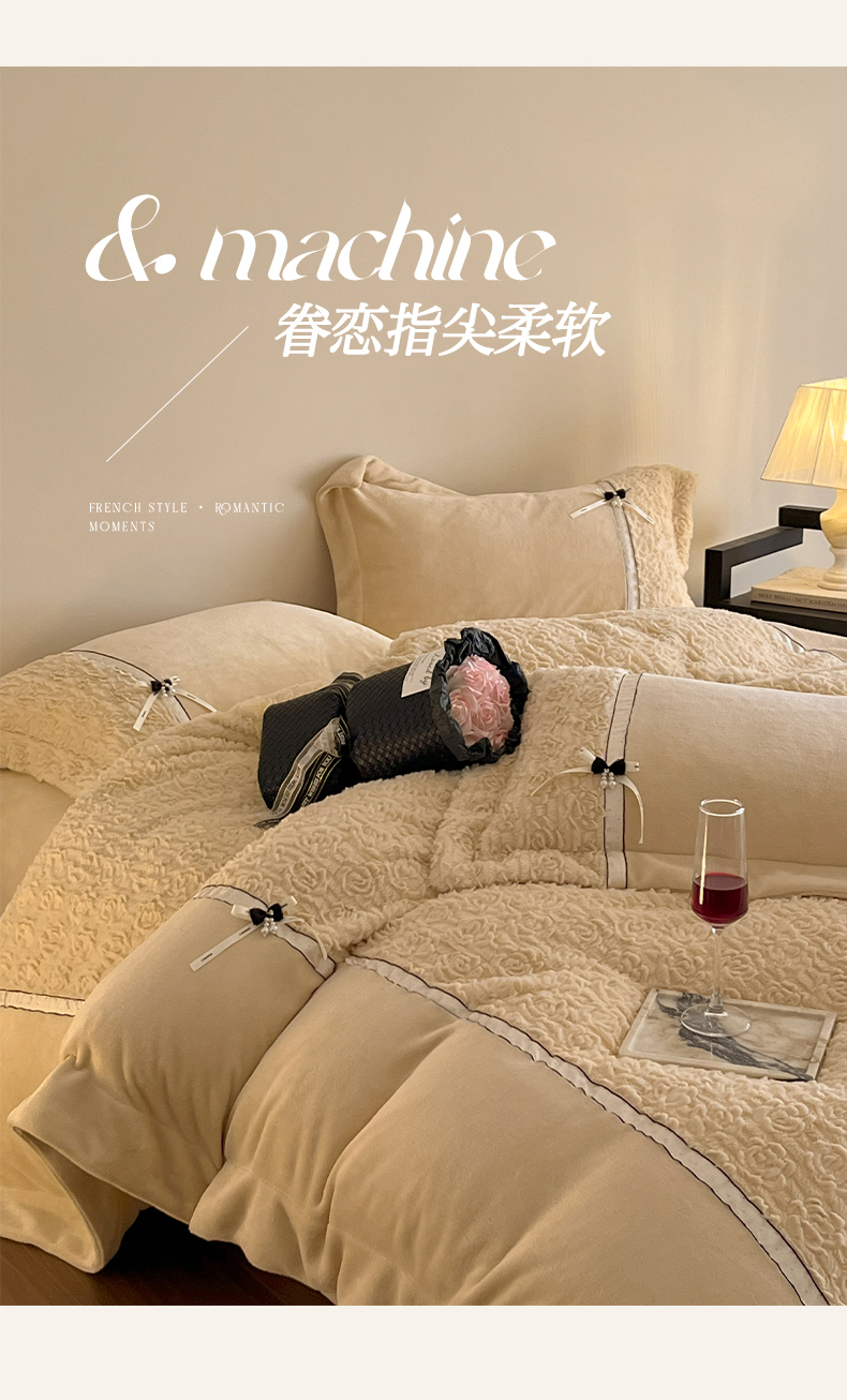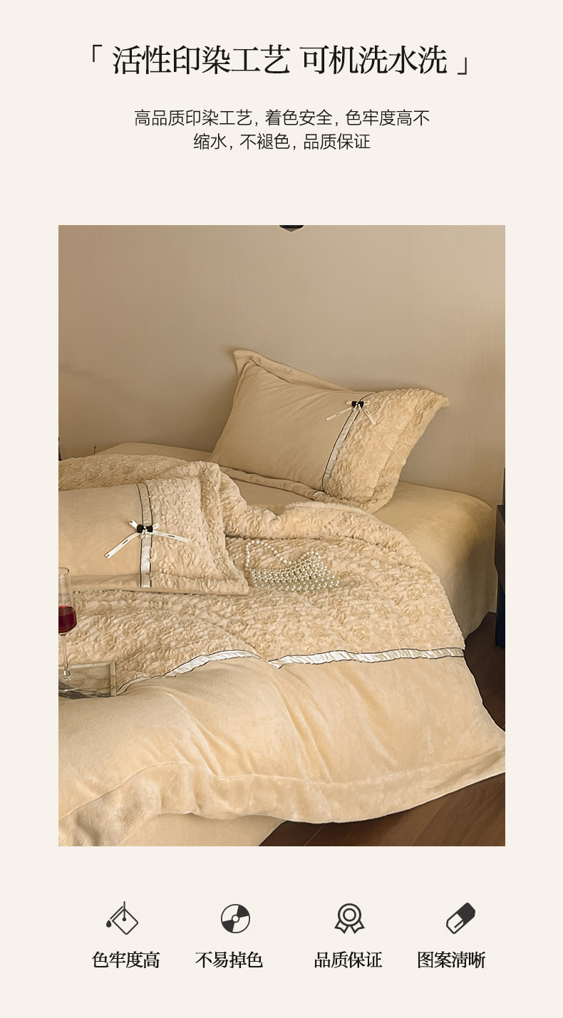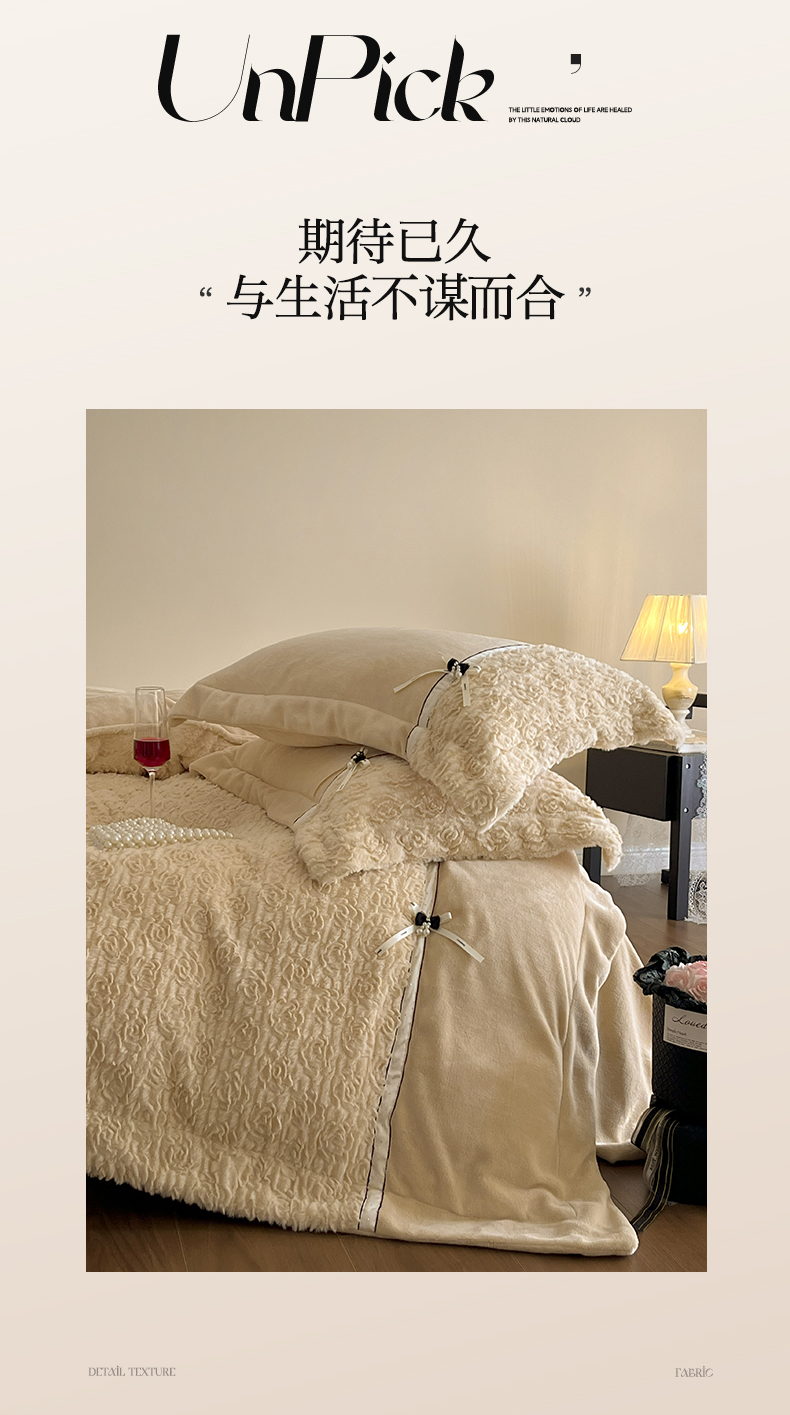 蓝邻家纺 2025新款提花兔绒双拼织带款四件套-微语系列 微语-卡其