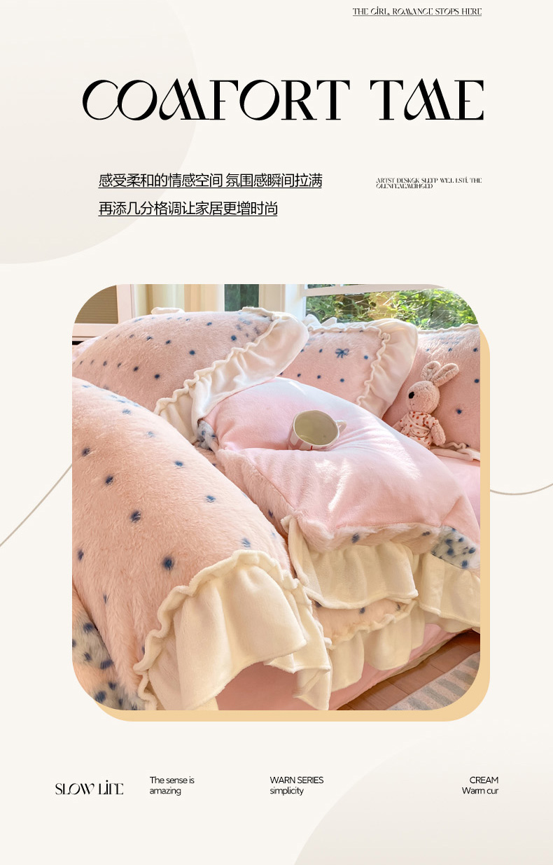 商品名称:米可 2025新款兔毛绒花边牛奶绒四件套 玫瑰庄园