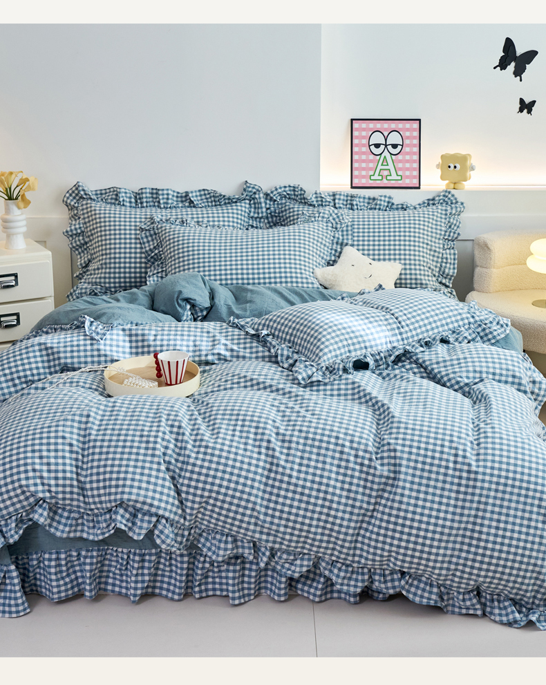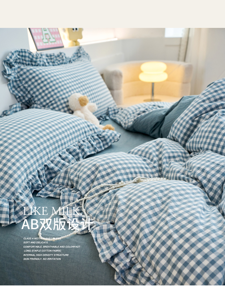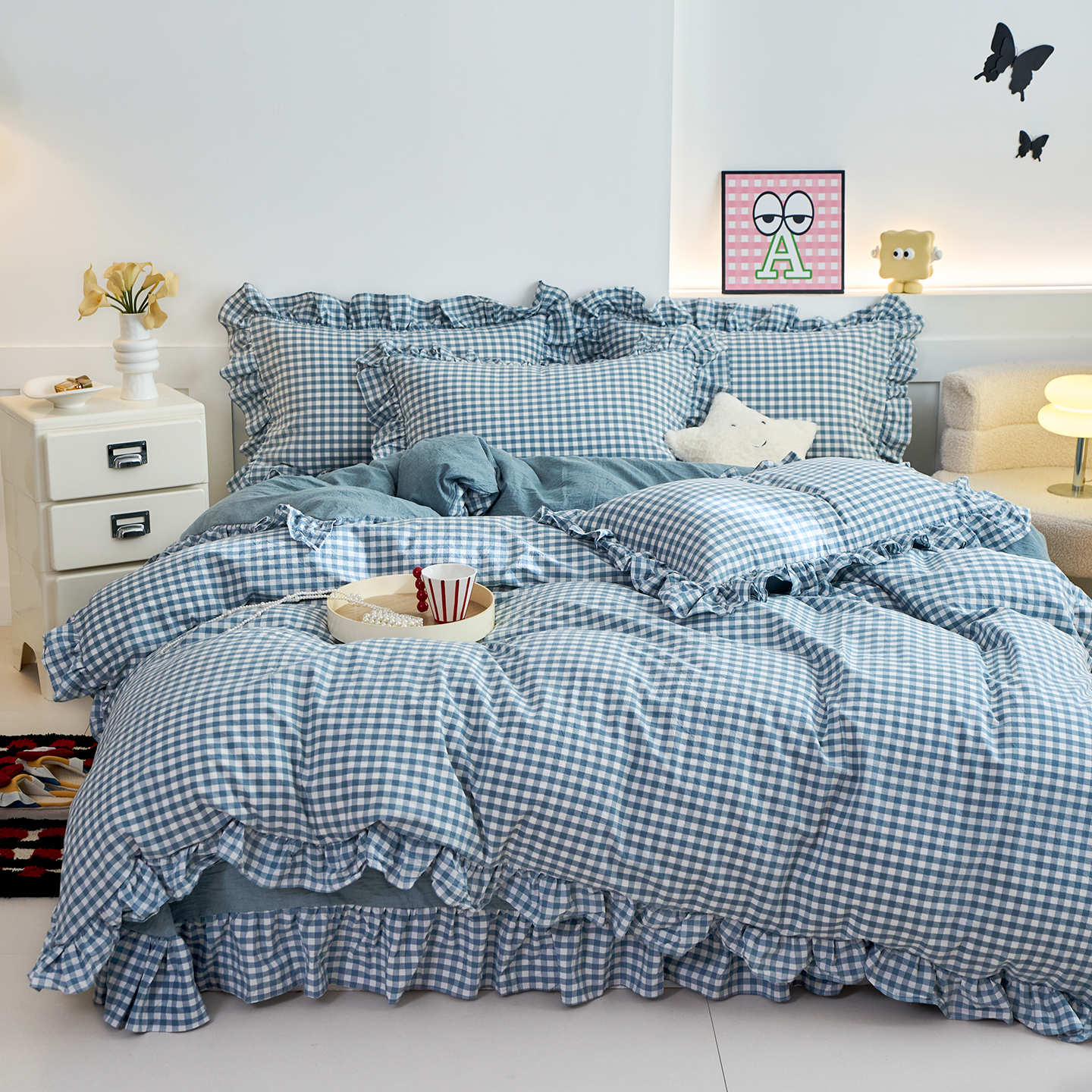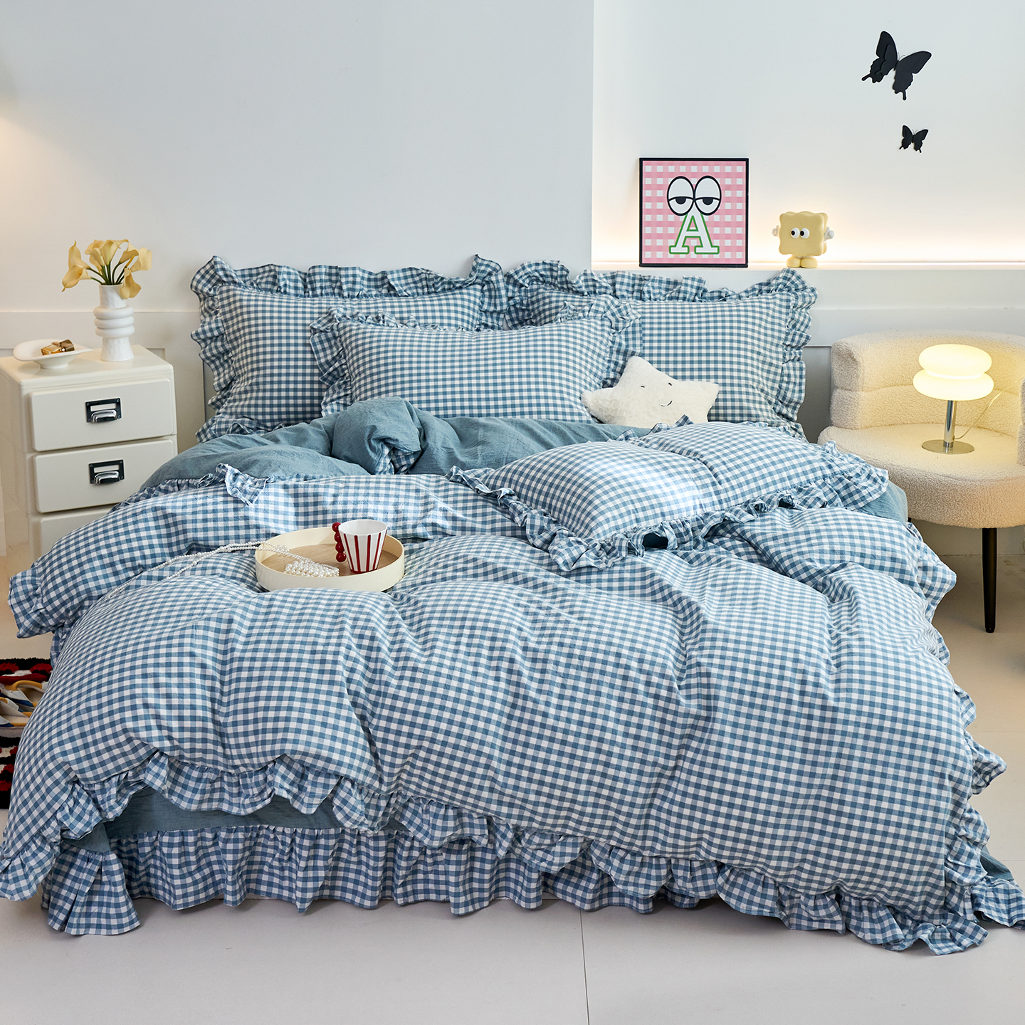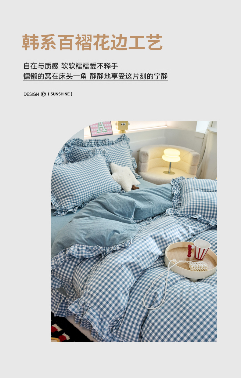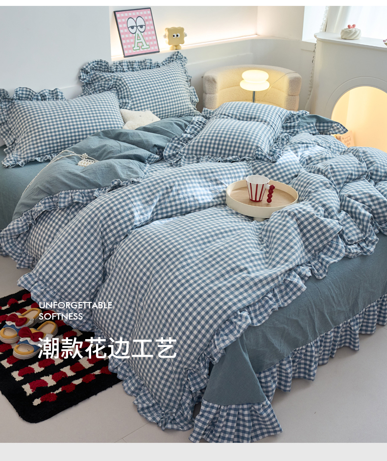 珂博家纺 2025新款韩版花边四件套纯棉全棉水洗棉四件套 蓝小格
