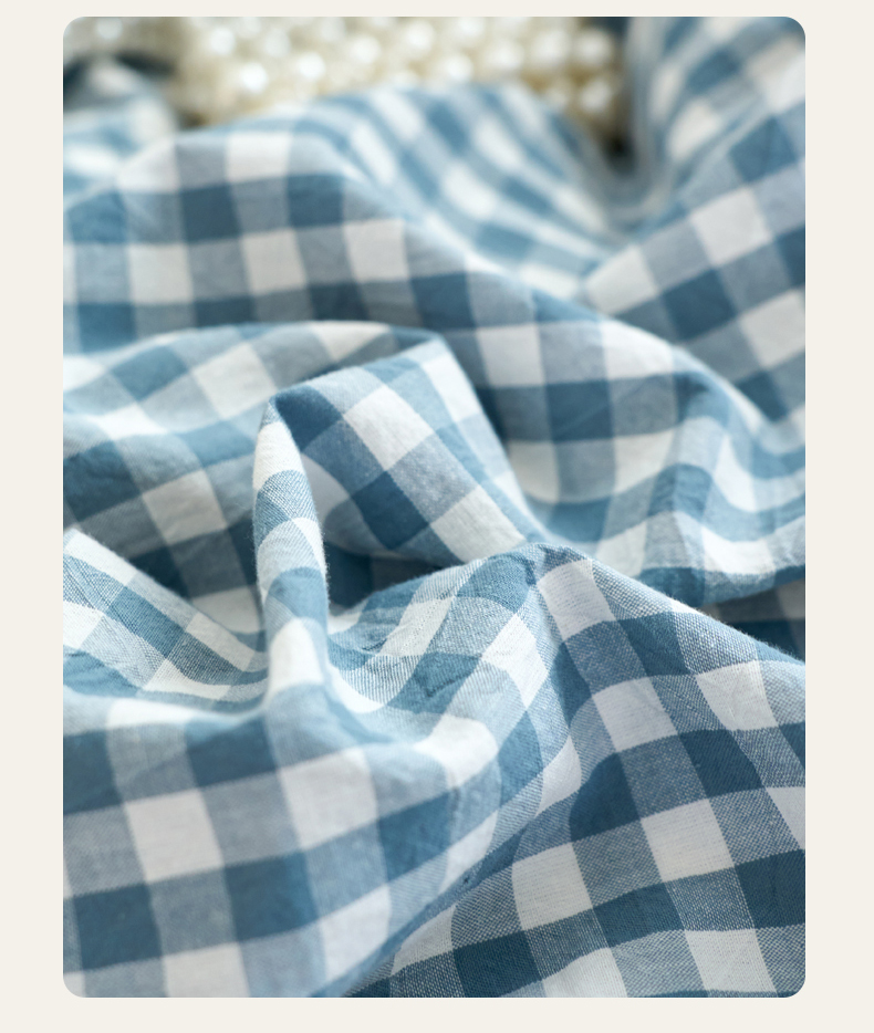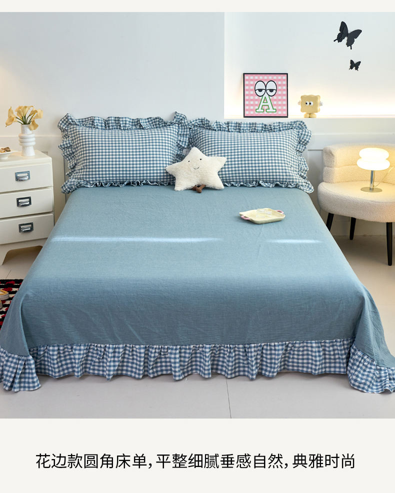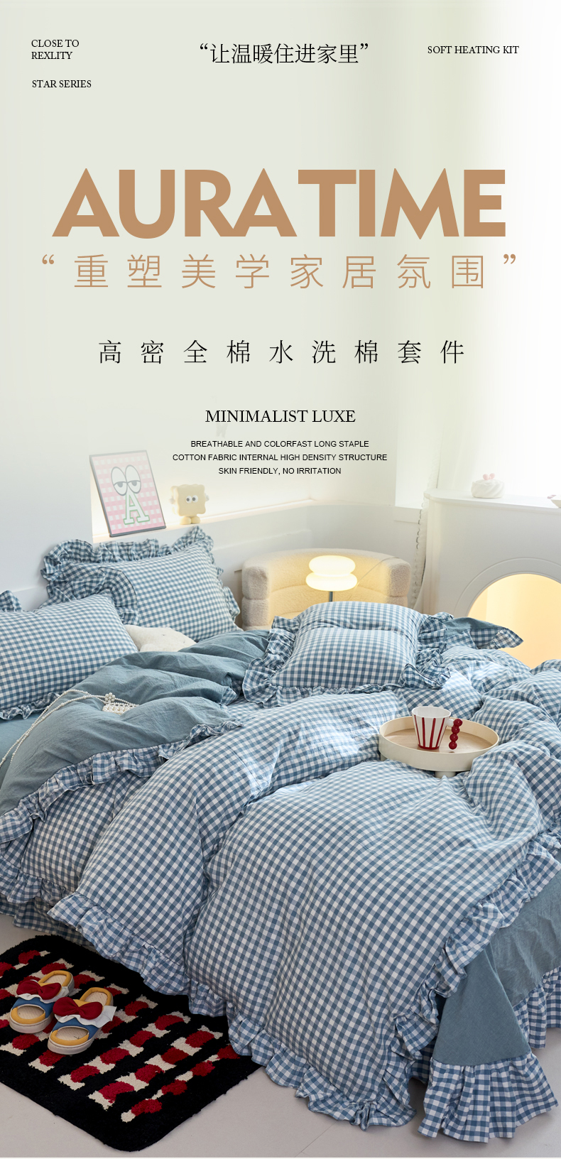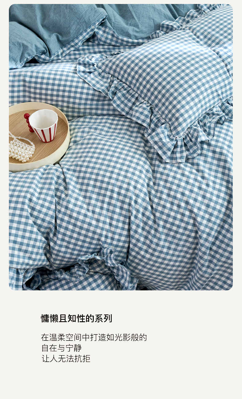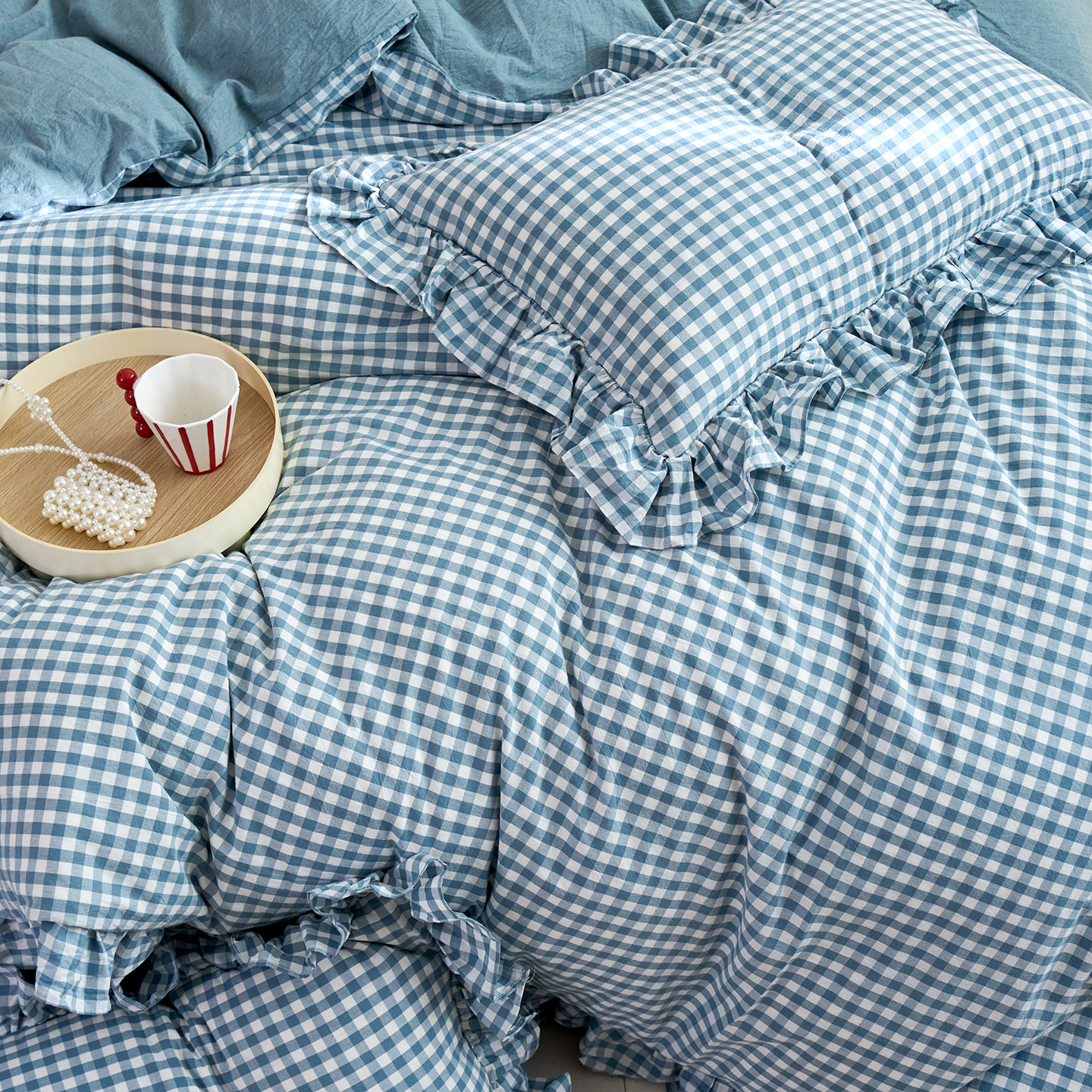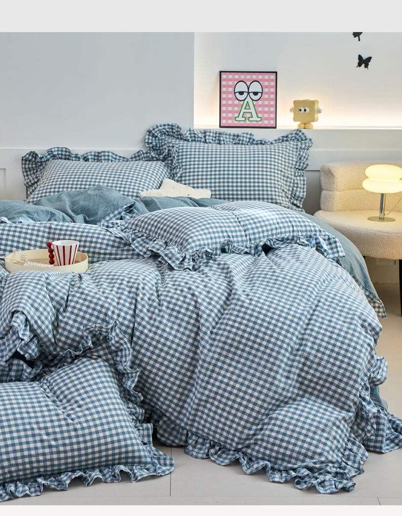 珂博家纺 2025新款韩版花边四件套纯棉全棉水洗棉四件套 蓝小格