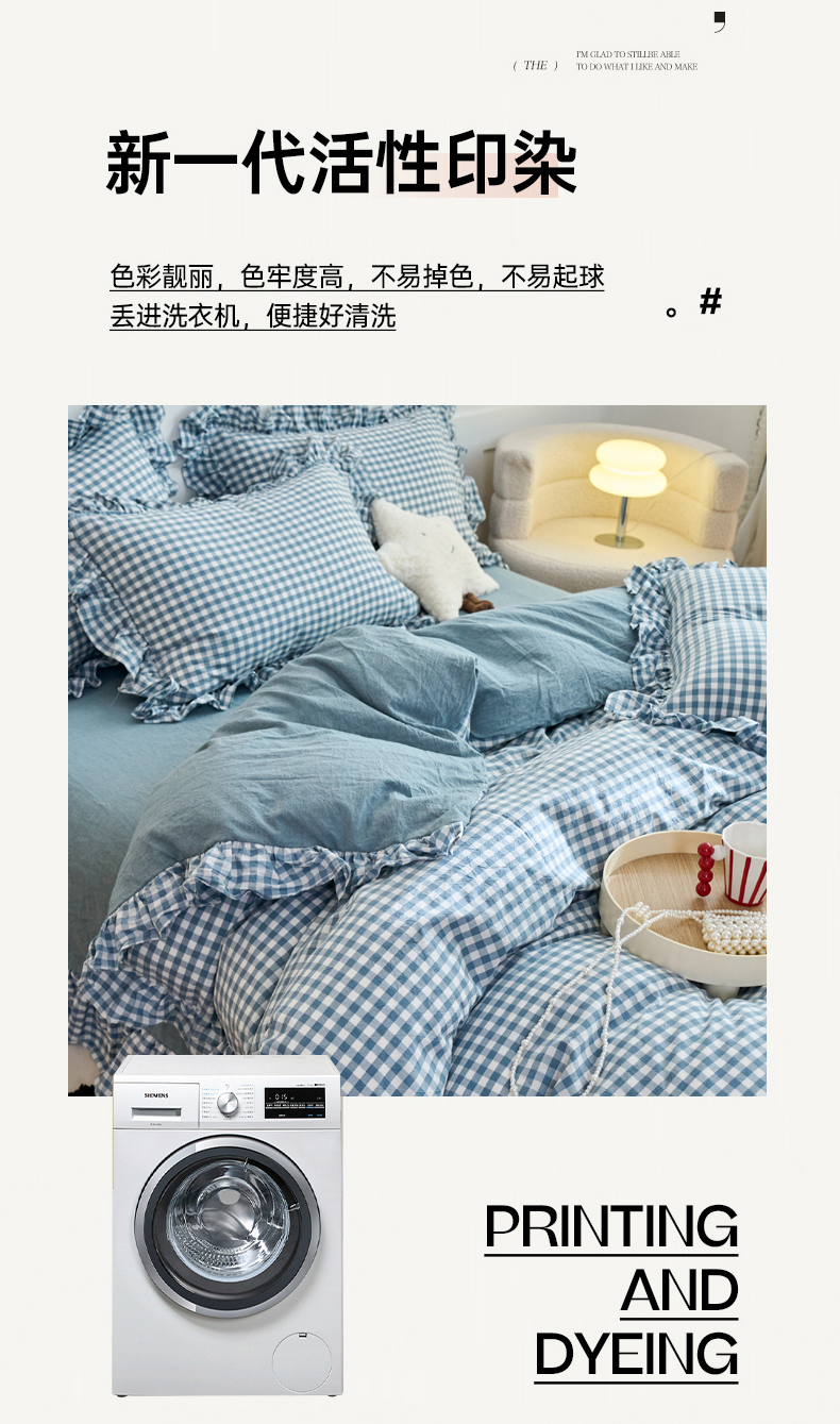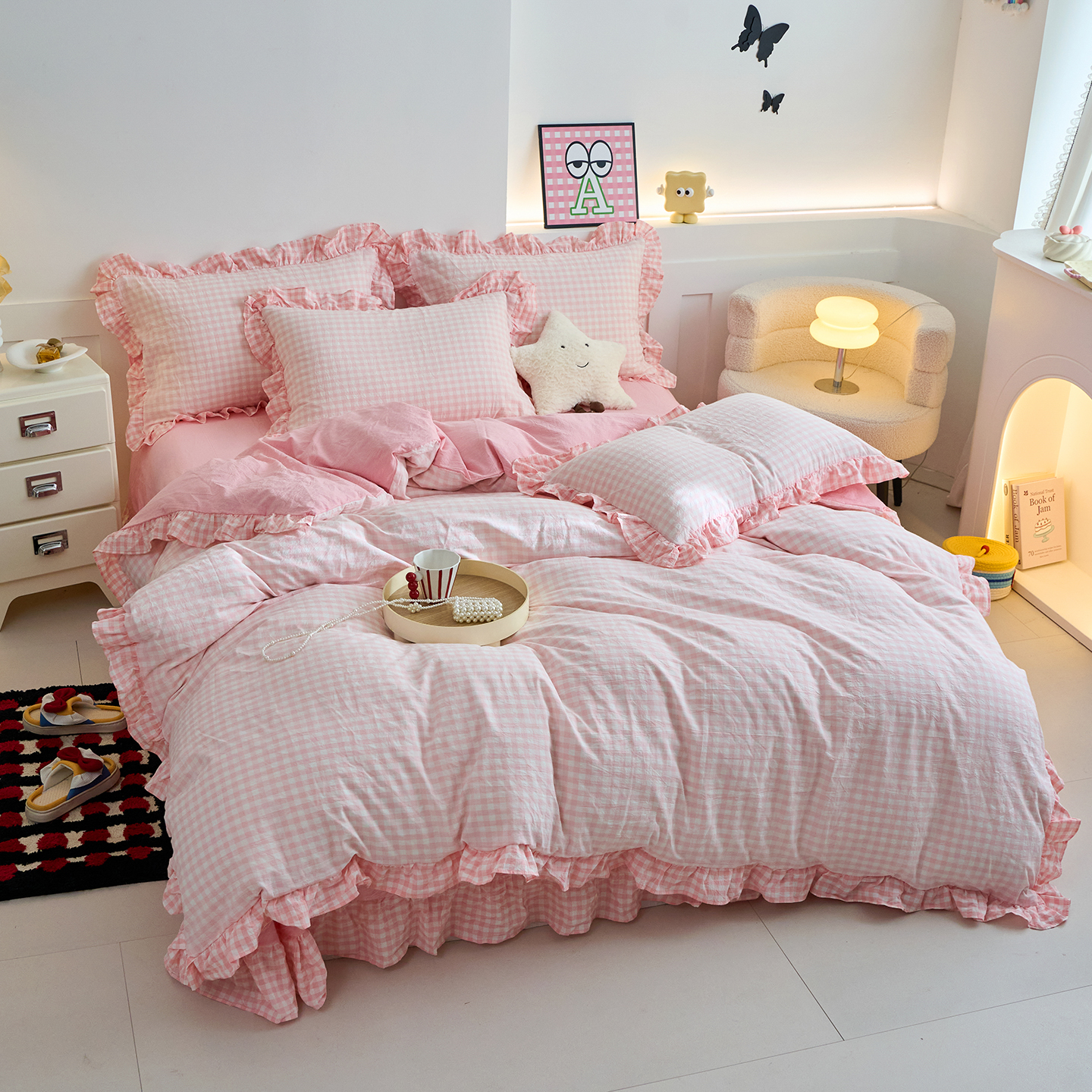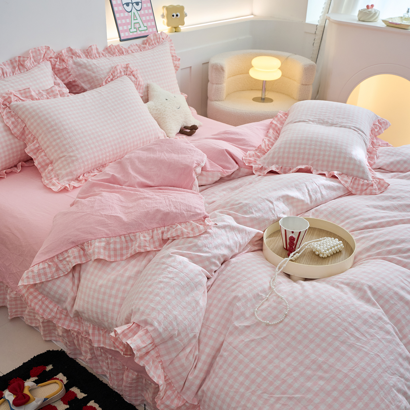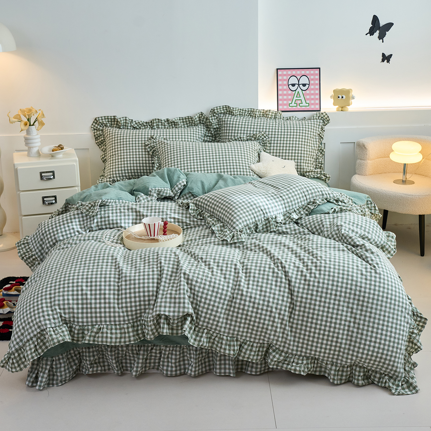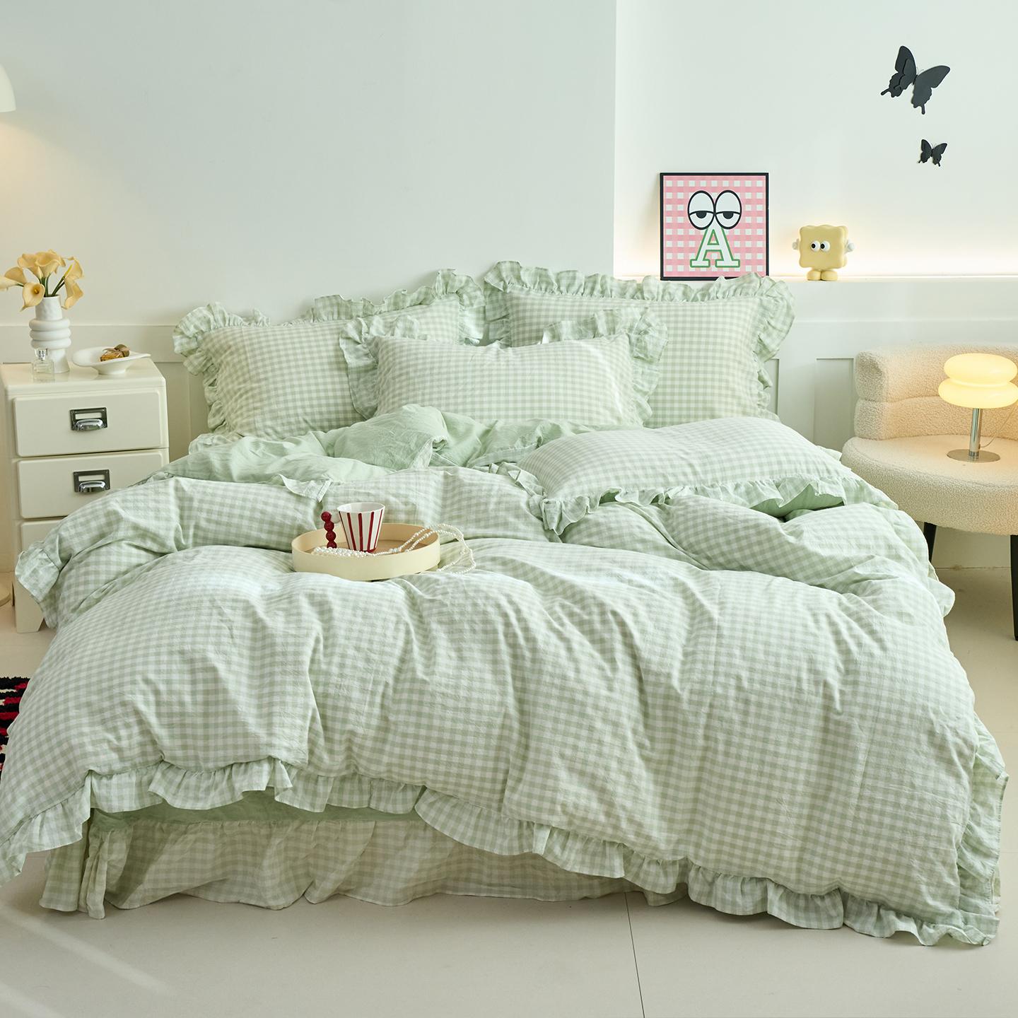 (总)珂博家纺 2025新款韩版花边四件套纯棉全棉水洗棉四件套,粉小格,蓝小格,浅绿小格,浅粉小格,绿小格,咖小格