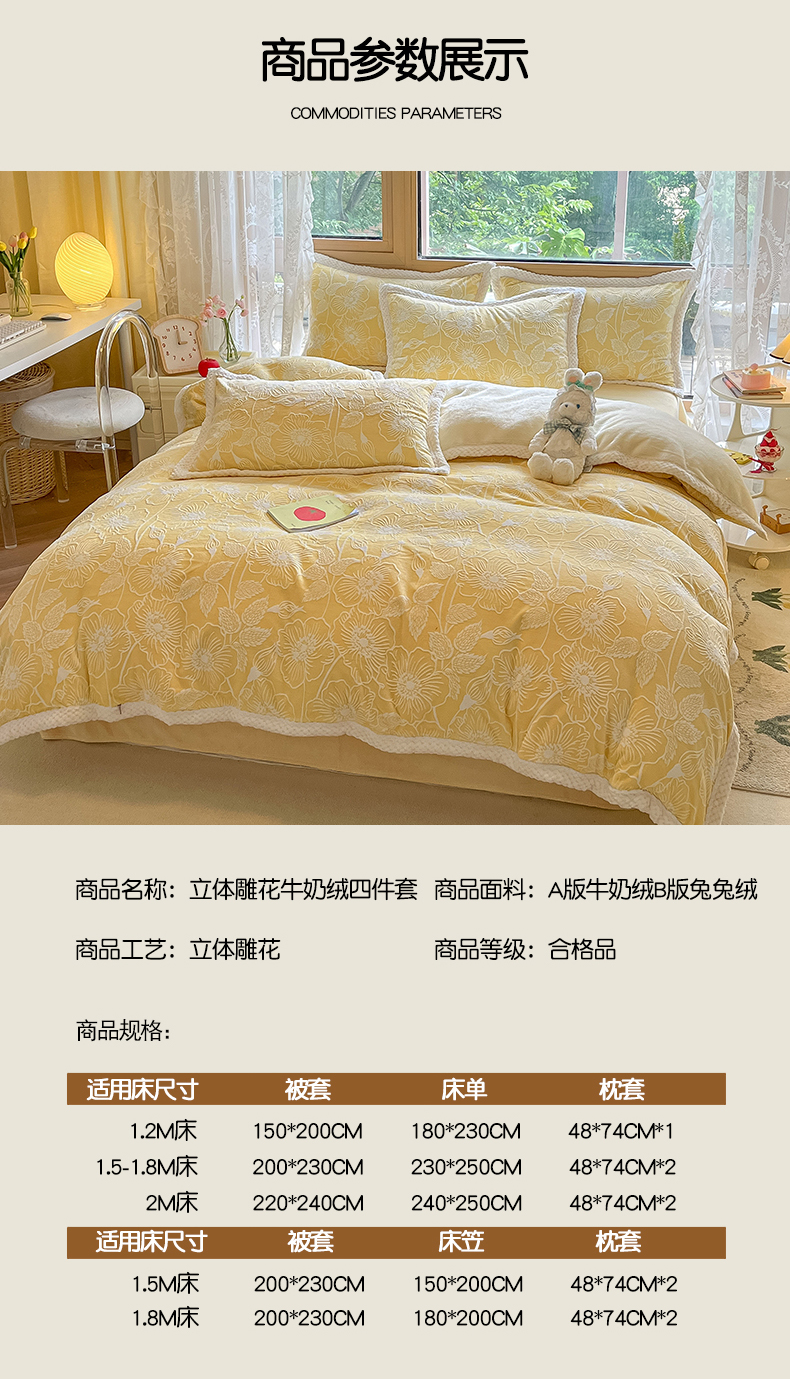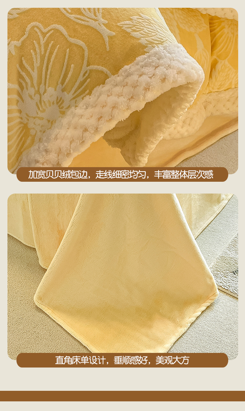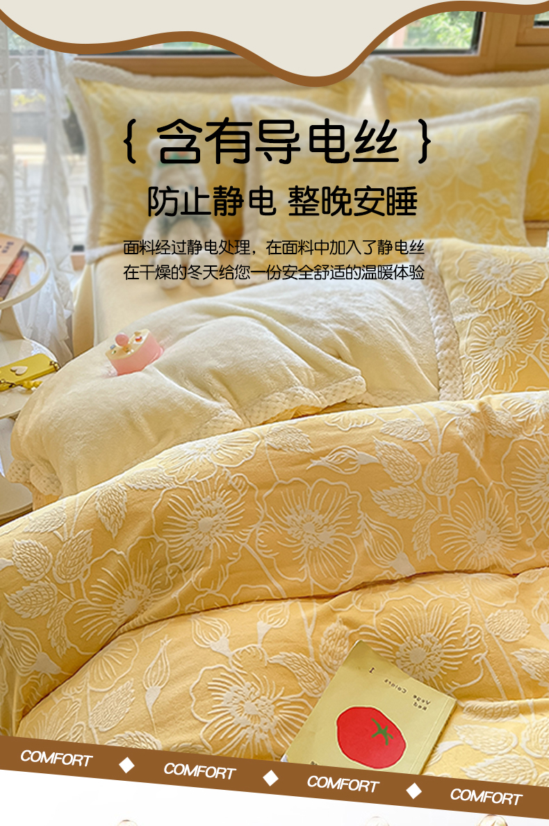 当前位置: 91家纺网 > 商品网购 > 床品套件 > 四件套 > 雕花绒四件套 > 琪格格纺织 2025新款全消光包边立体简约清新雕花绒四件套 雕花包边-安妮花苑 黄