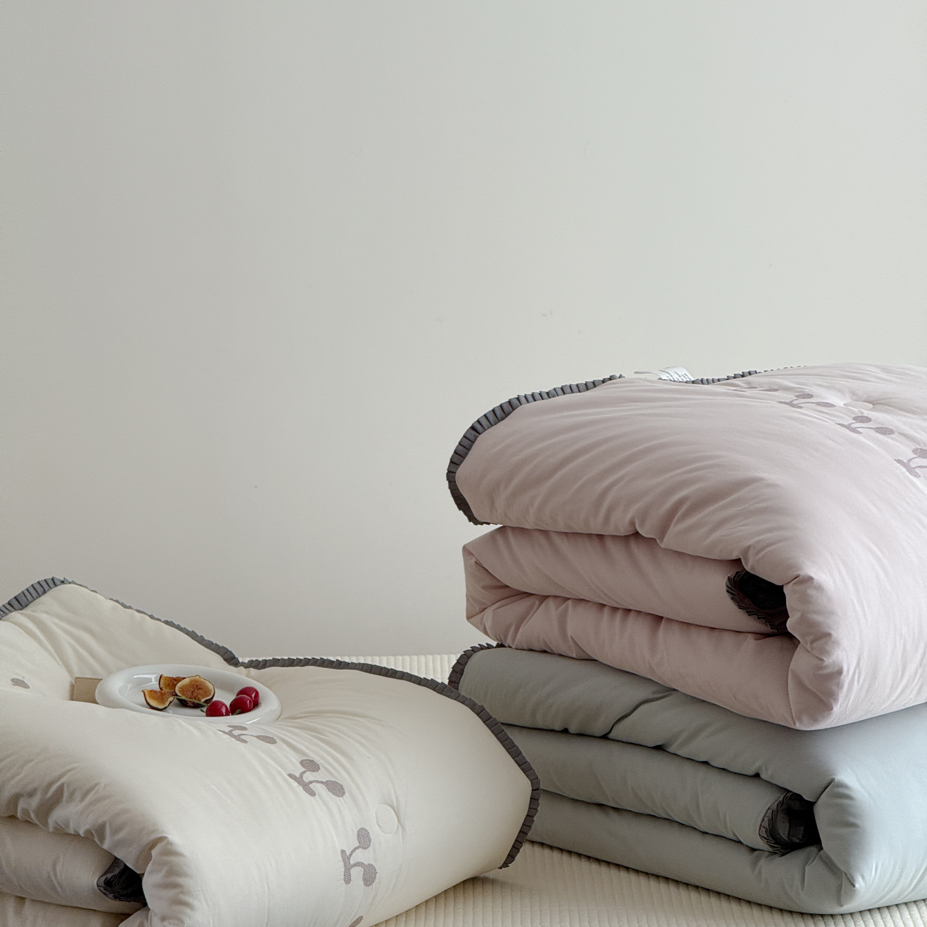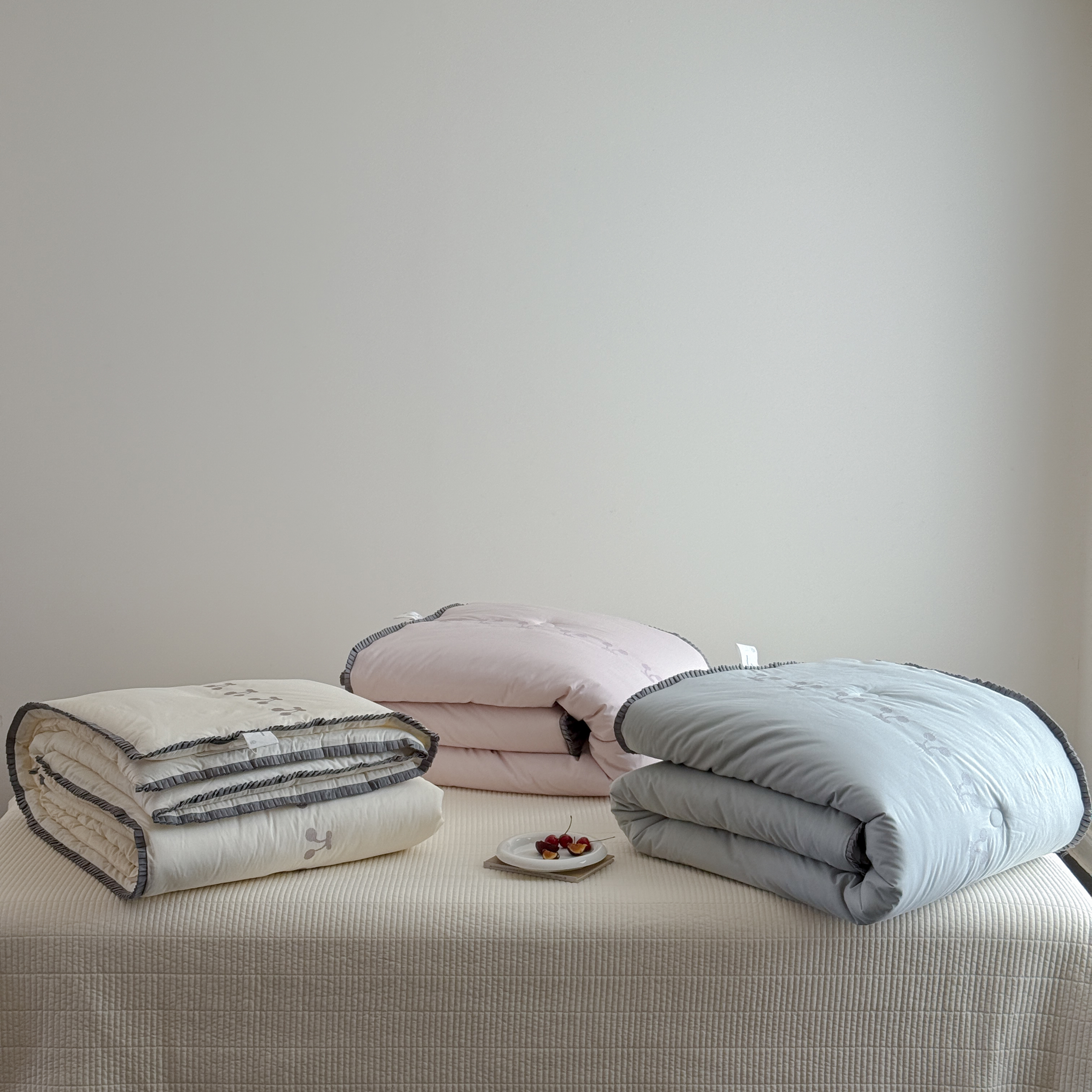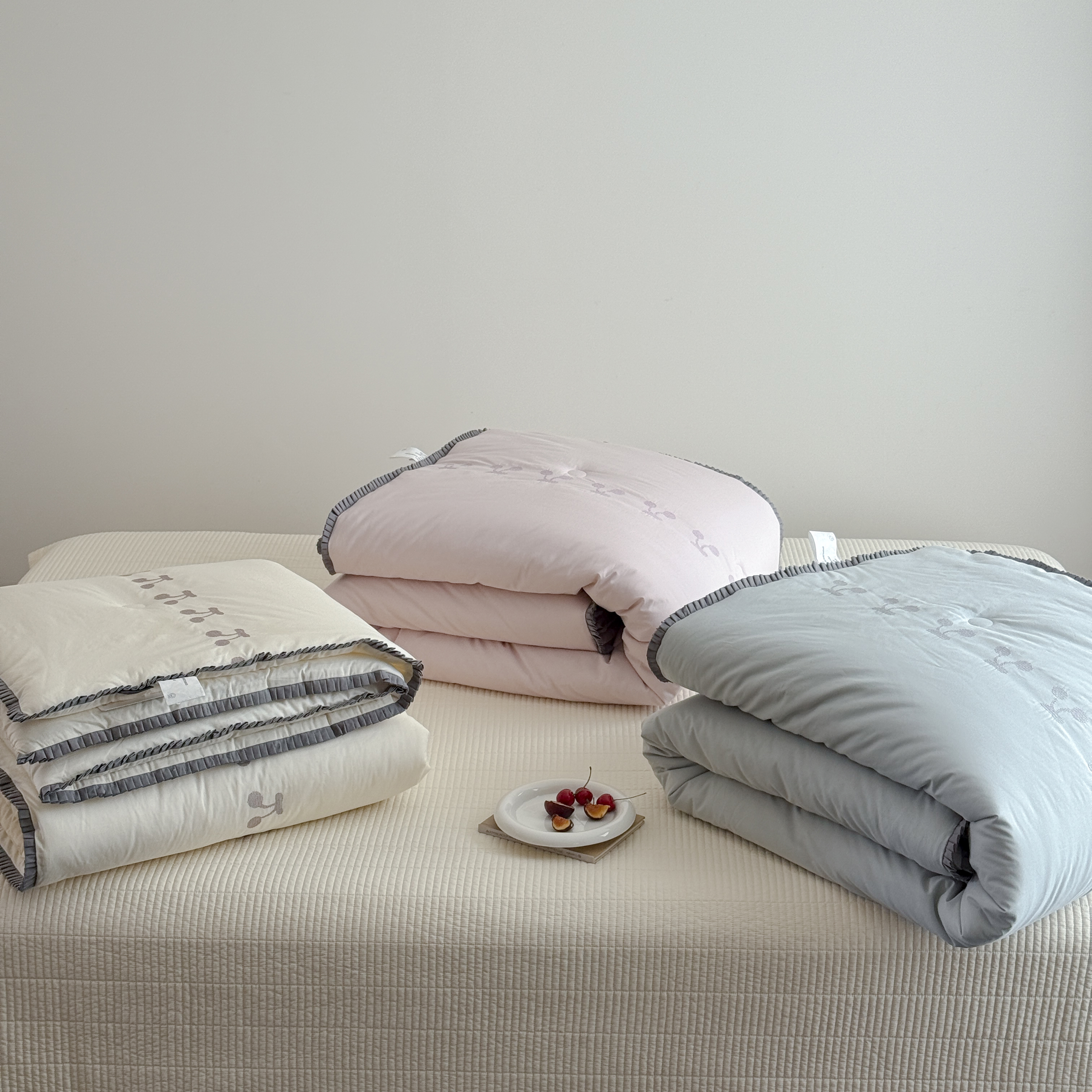 (总)汇庭 2025新款秋冬胖胖樱桃春秋被+樱桃菲菲床盖三件套,组合图下单仅供展示不可下单,粉色,绿色,米色