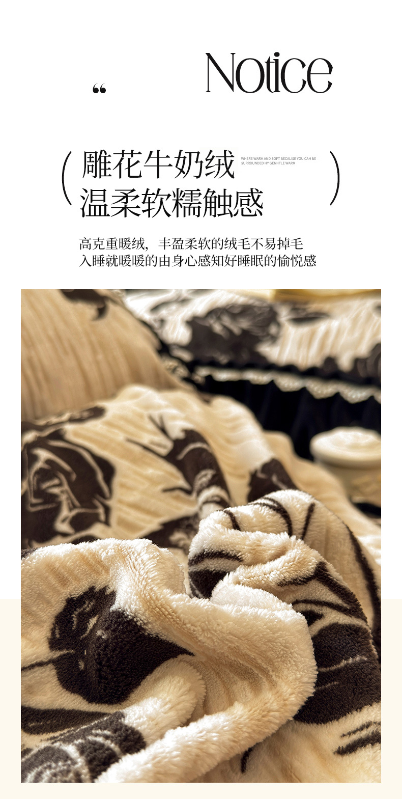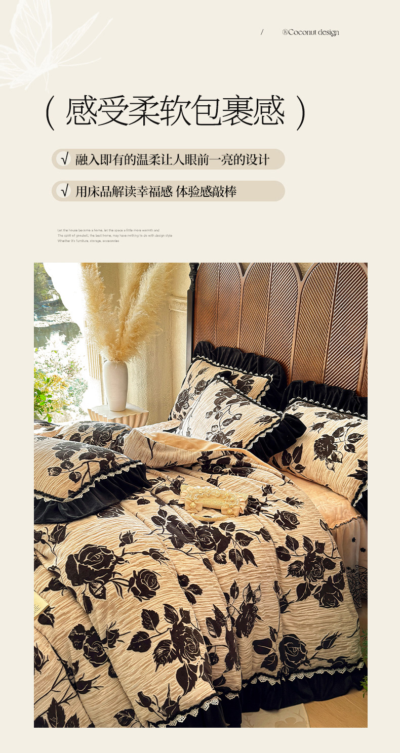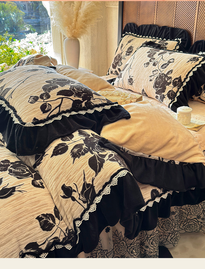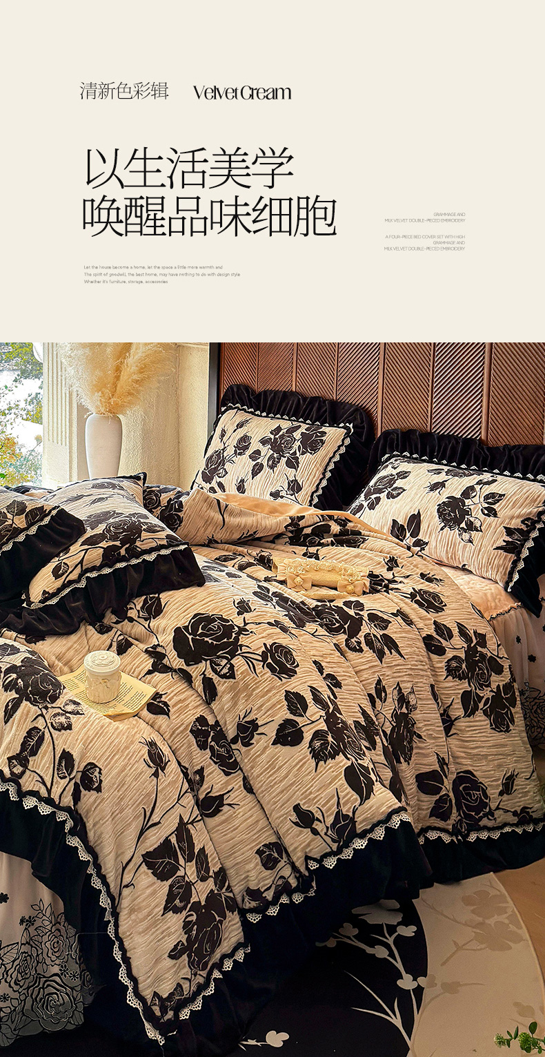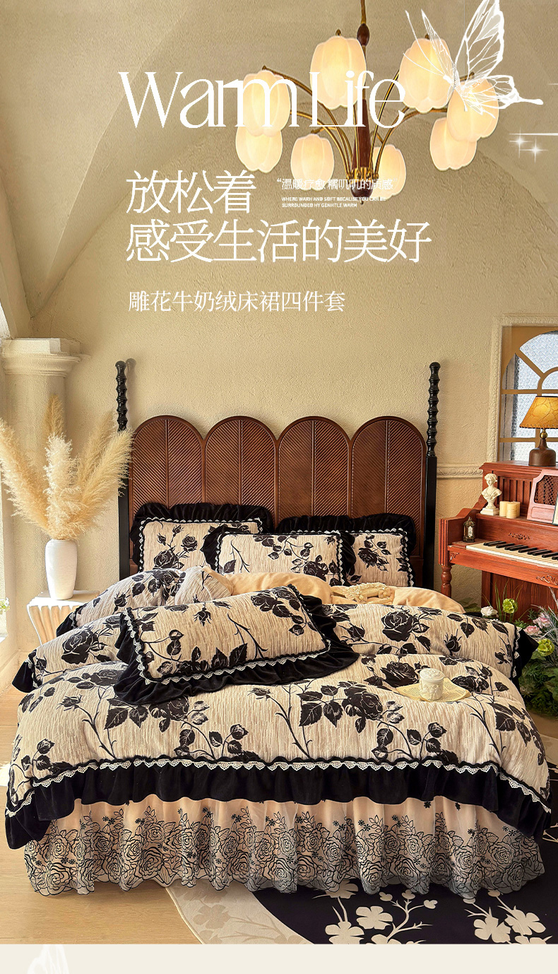 当前位置: 91家纺网 > 商品网购 > 床品套件 > 四件套 > 牛奶绒四件套 > 虹星家纺 2025新款雕花牛奶绒床裙四件套-花溪系列 花溪-米黄