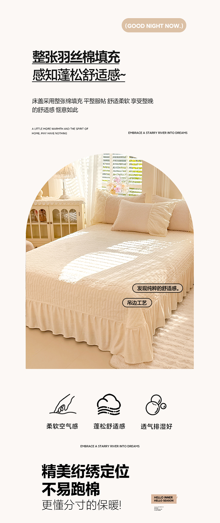 商品名称:苏米娜2025秋冬新款11斤230g全消光牛奶绒夹棉床盖款四件套纯色蕾丝花边刺绣床裙款床盖--安娜花园系列 安娜花园—奶昔白