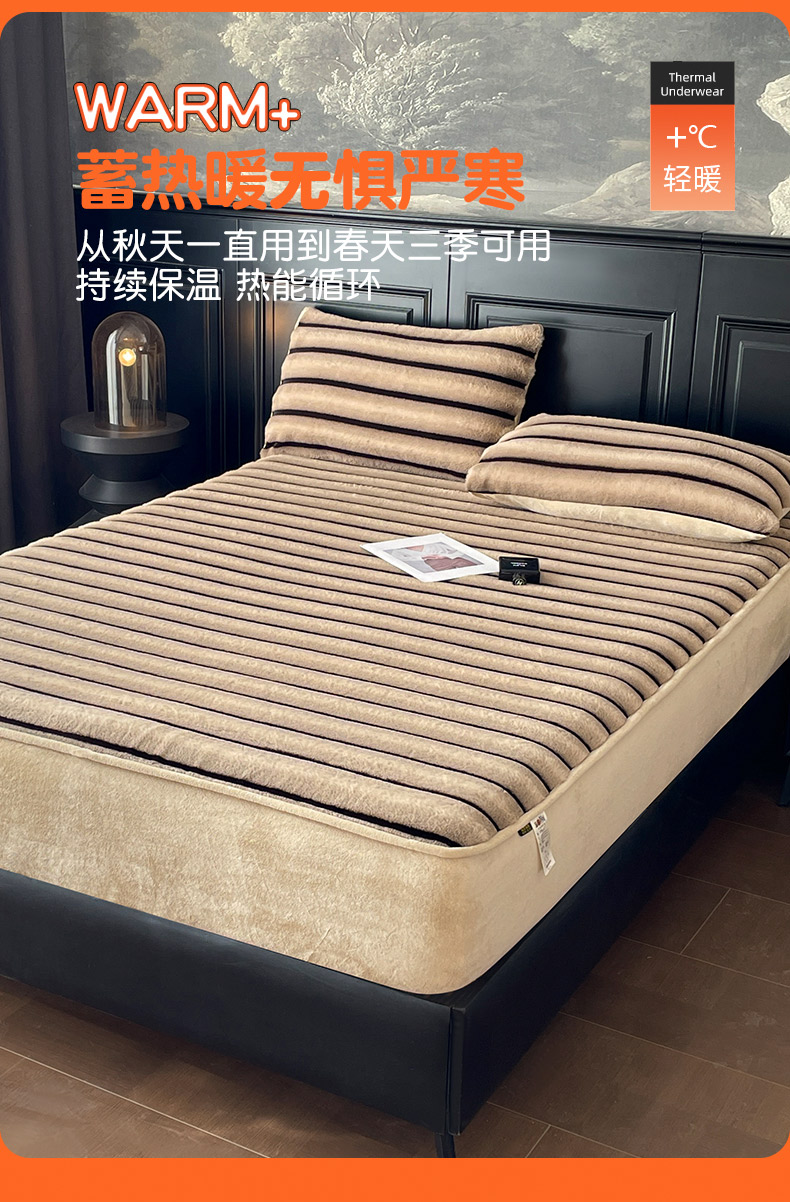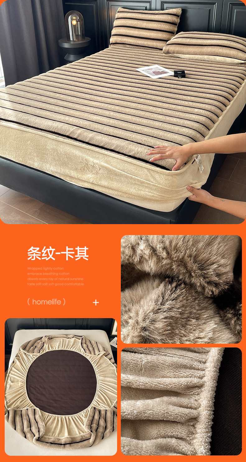 商品名称:库里梦家纺 2025新款美拉德托卡斯獭兔毛绒床笠三件套 条纹-浅灰