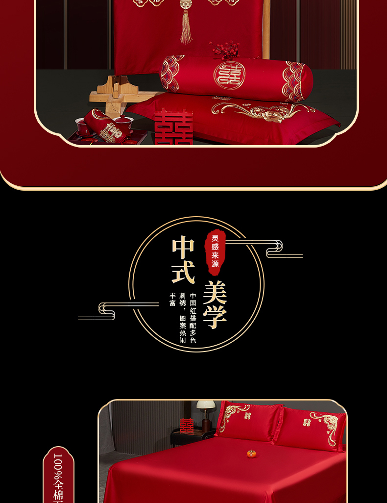 商品名称:浩情国际婚庆供货中心 2026新款100%全棉纯棉新中式刺绣大红结婚婚庆四件套多件套 HQ-囍结良缘
