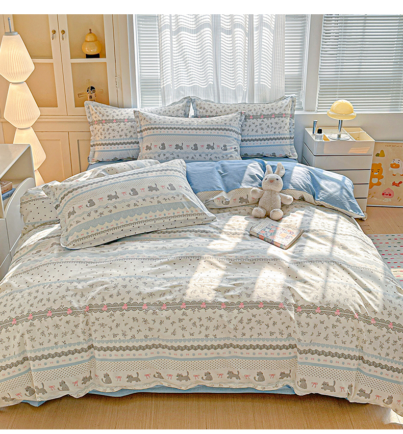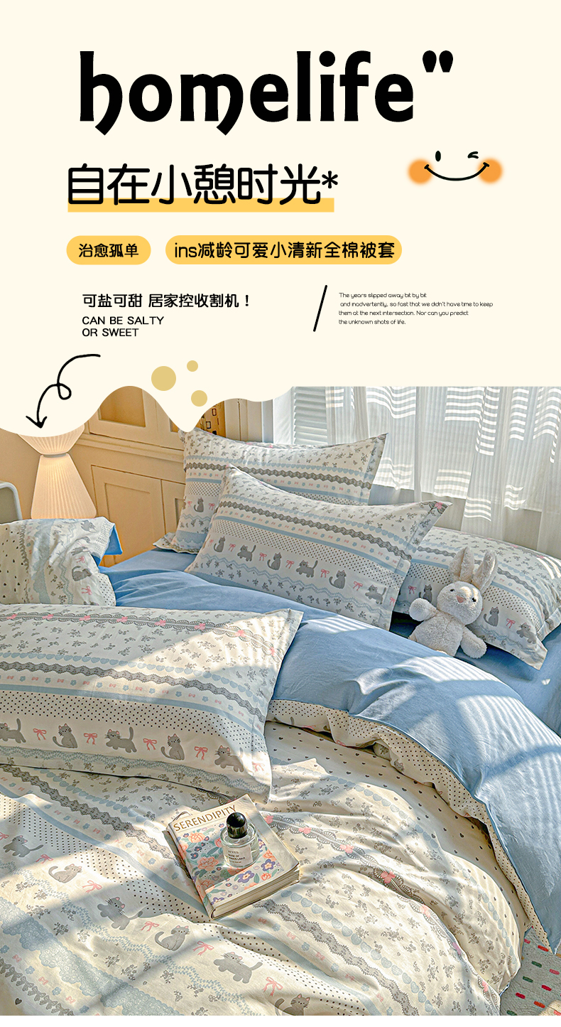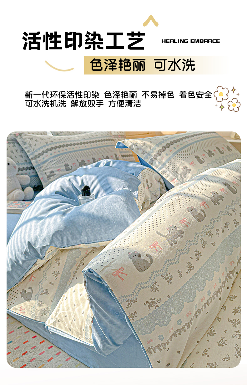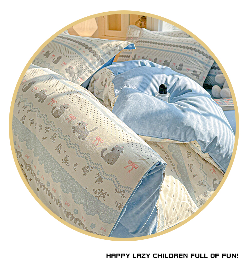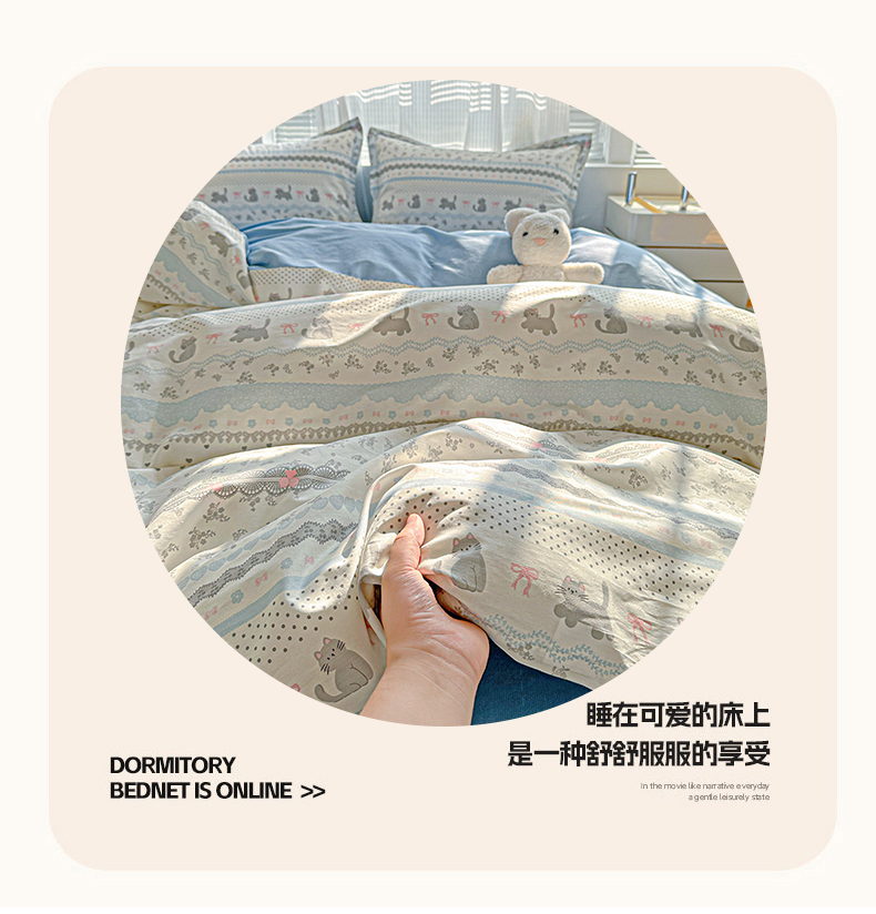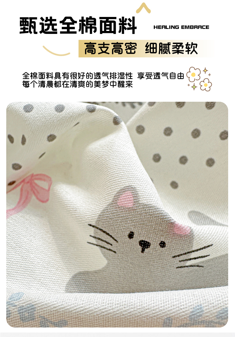 • 91家纺网 家纺一手货源 找家纺 春雨家居 2026新款全棉印花ins减龄可爱小清新单被套 小猫时光-兰
