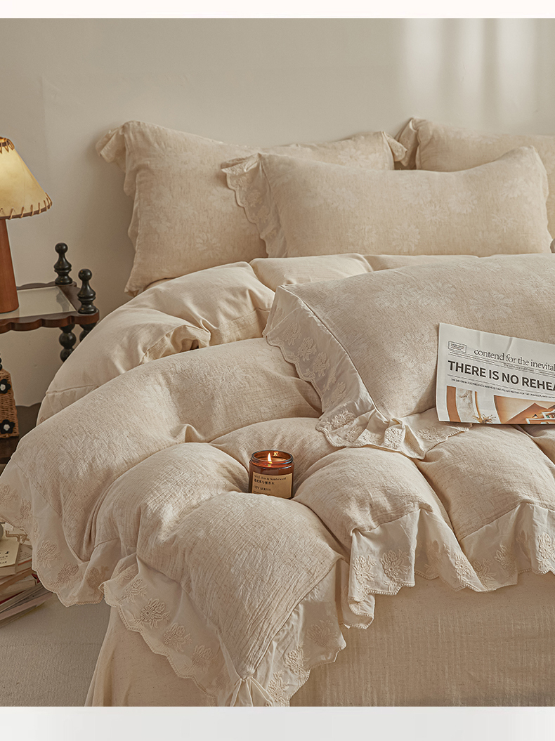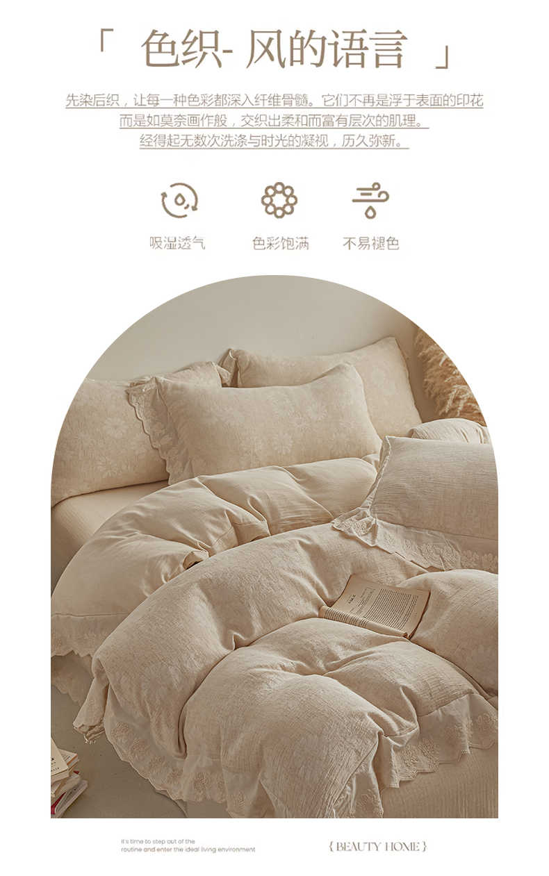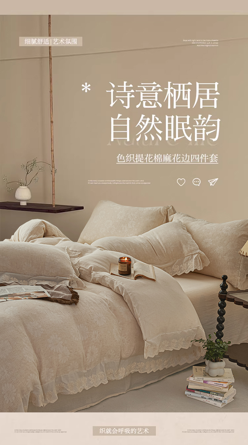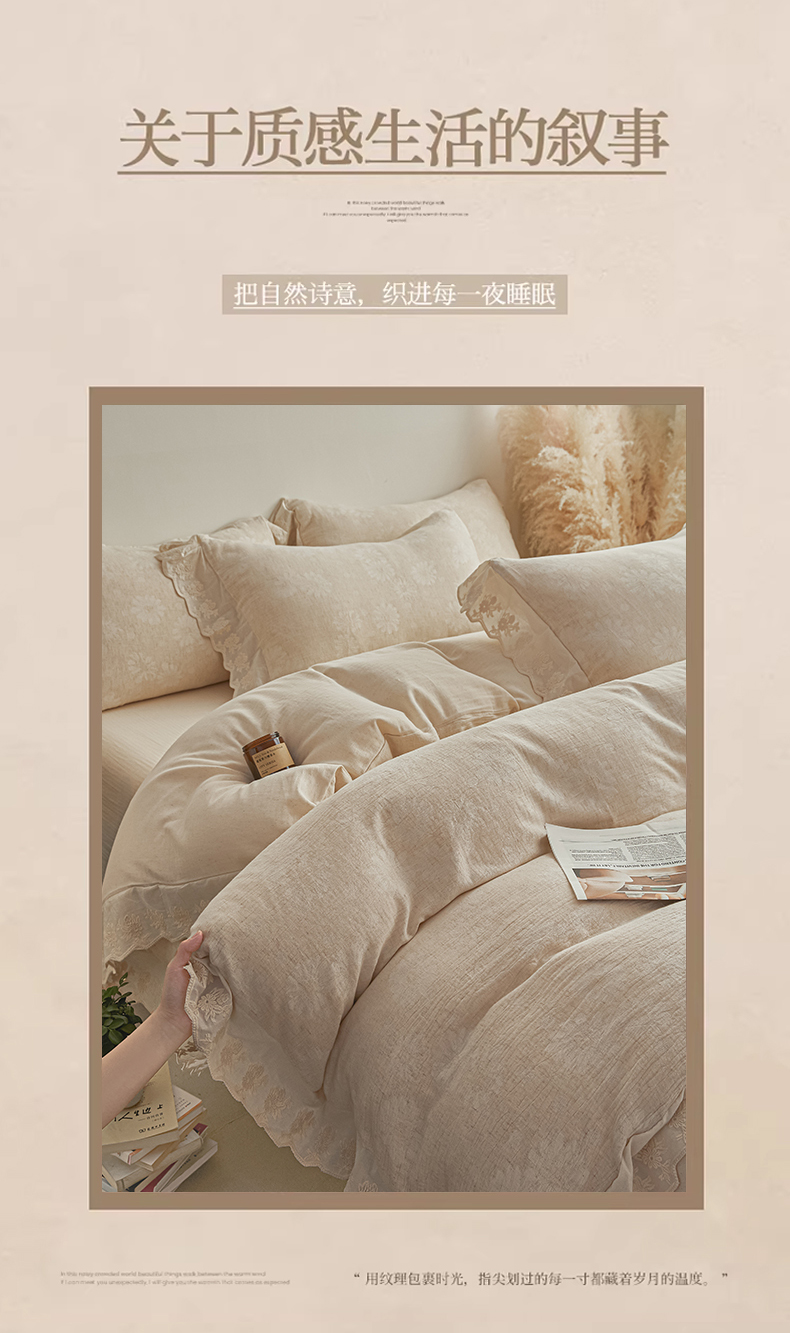 当前位置: 91家纺网 > 商品网购 > 床品套件 > 四件套 > 提花四件套 > KA家纺 2026春夏新款色织提花棉麻四件套花边款 花影素帛