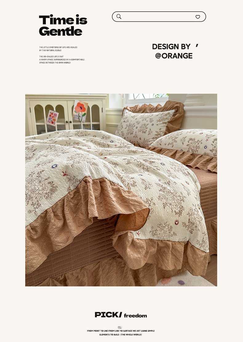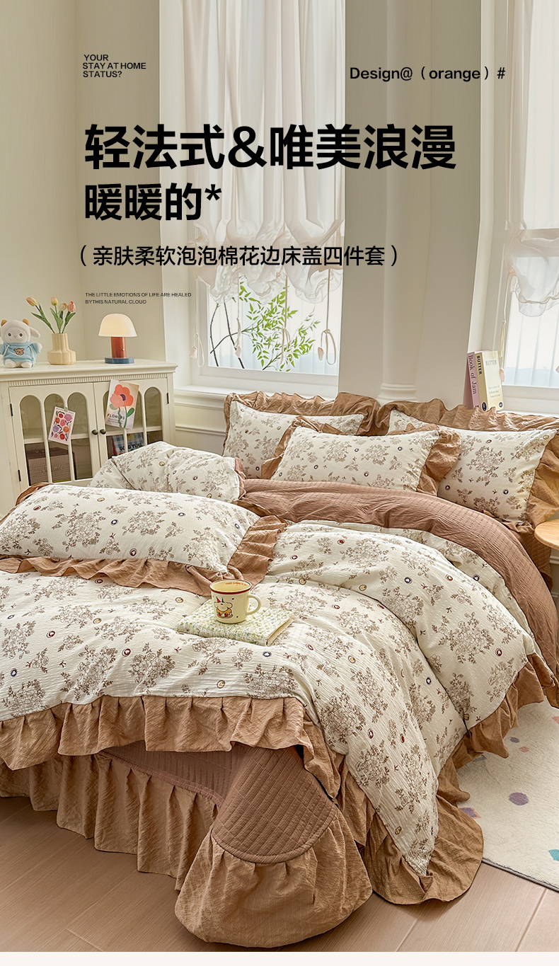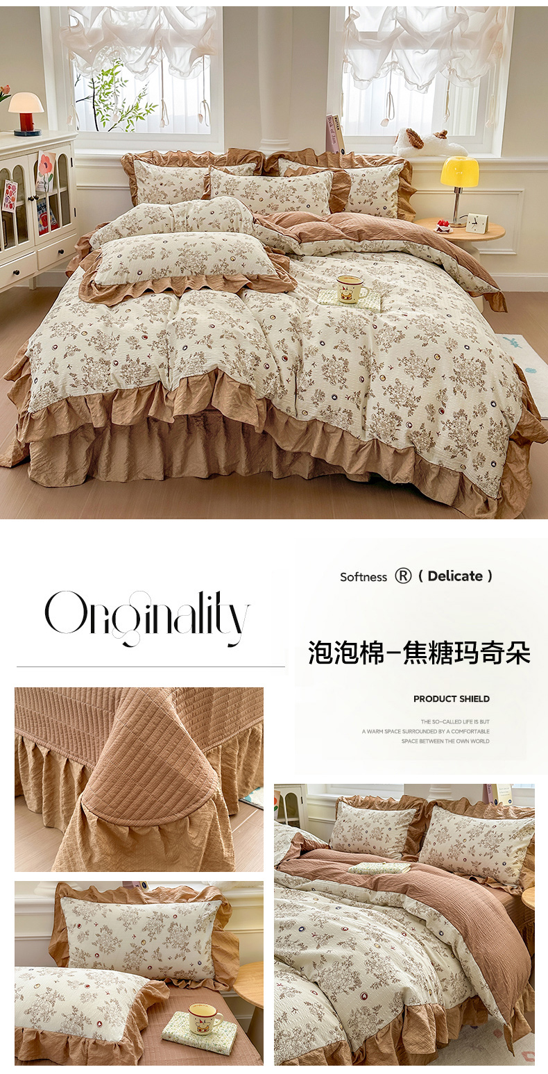 安哆啦家纺 2026新款糯叽叽泡泡棉韩式花边床盖四件套 泡泡棉-焦糖玛奇朵