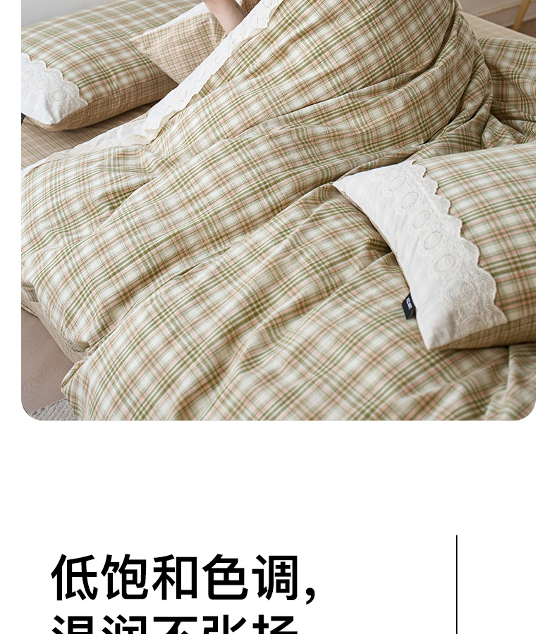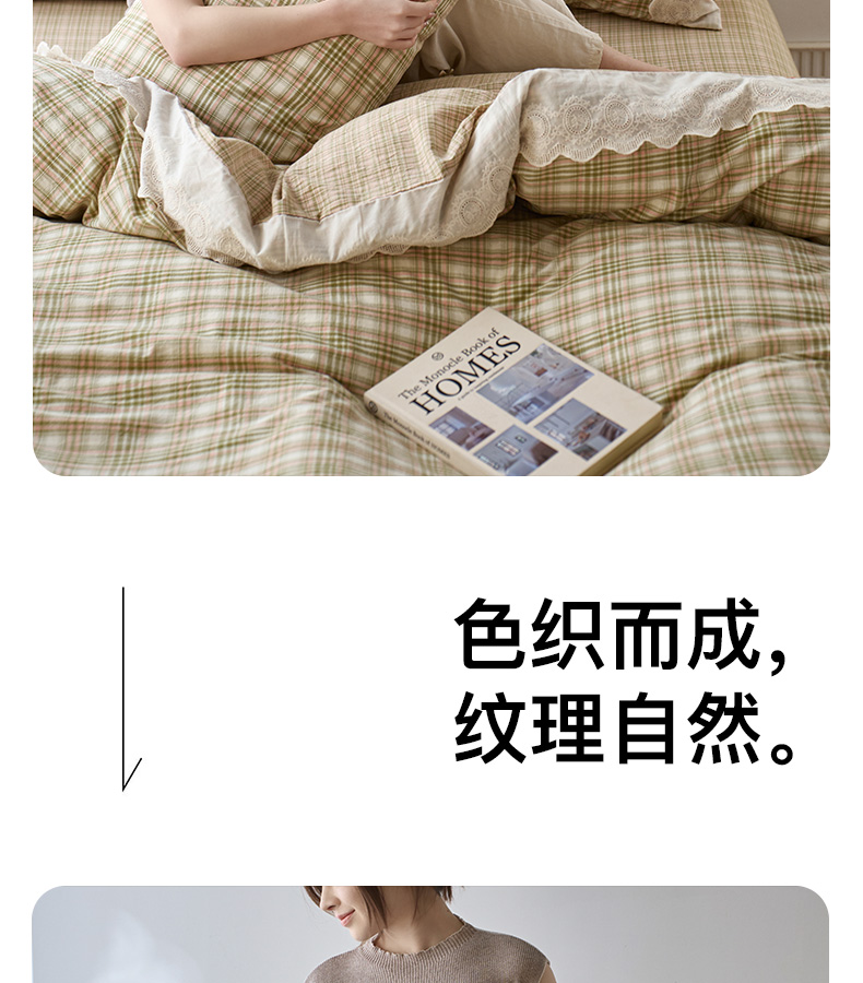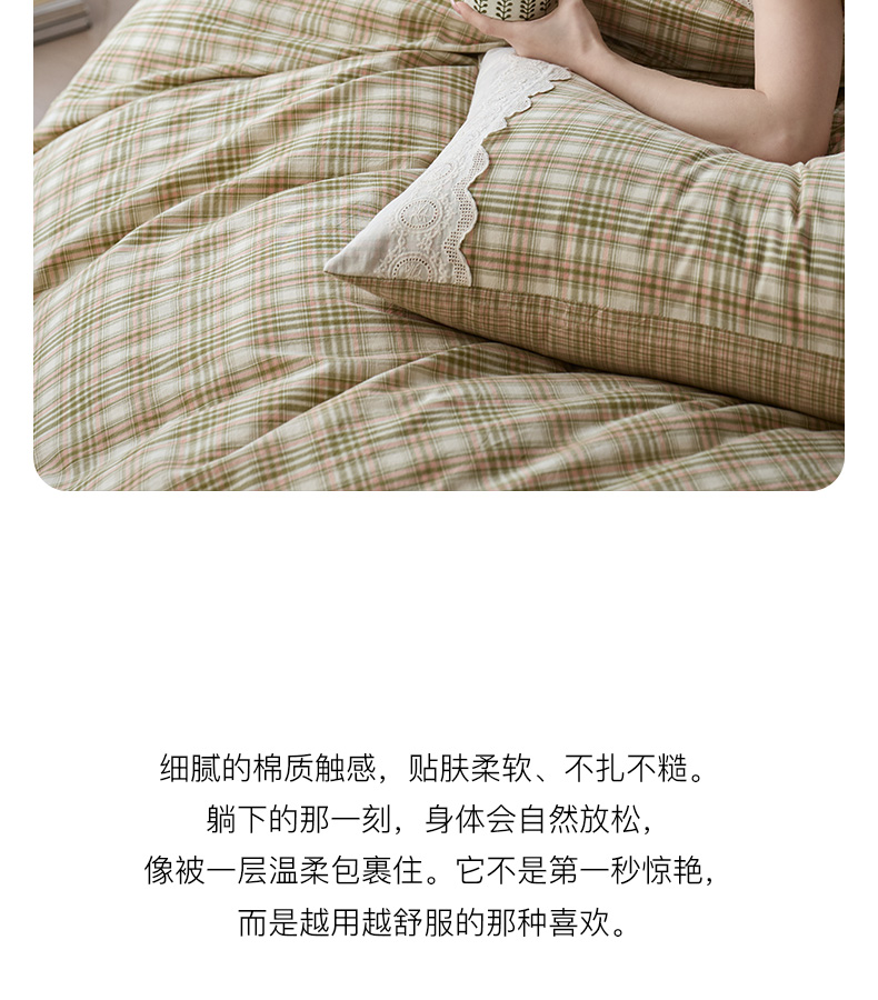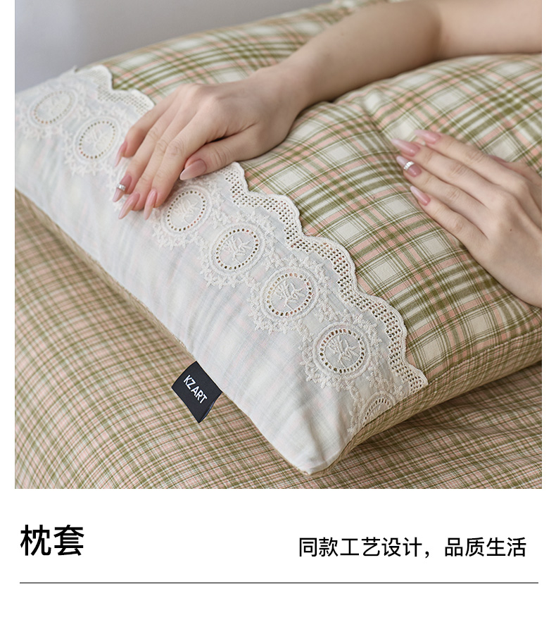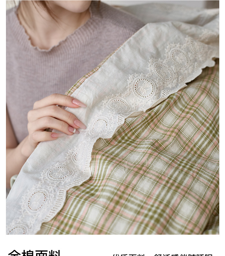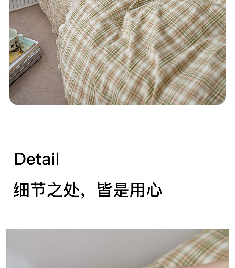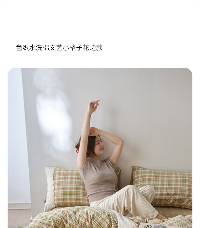 商品名称:卡姿家纺 2026春夏色织水洗棉文艺小格子花边款 利奥-沁绿