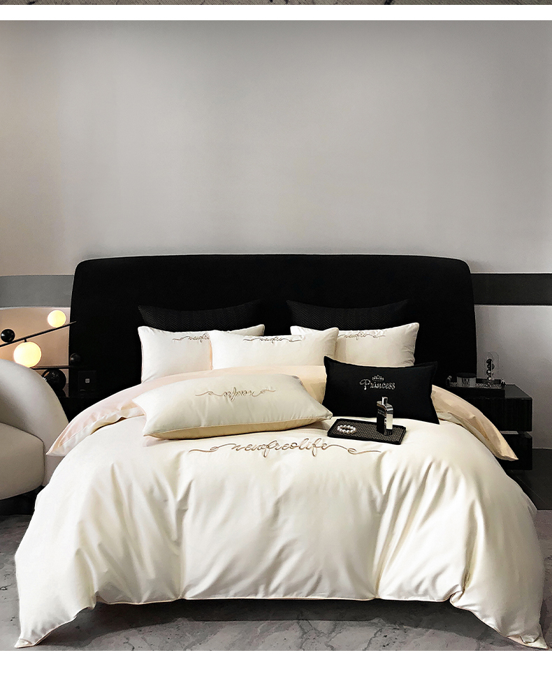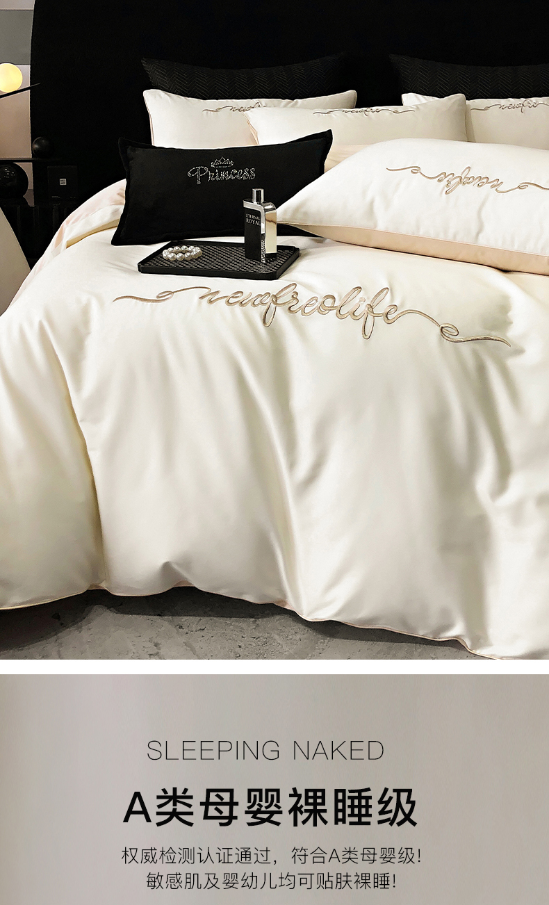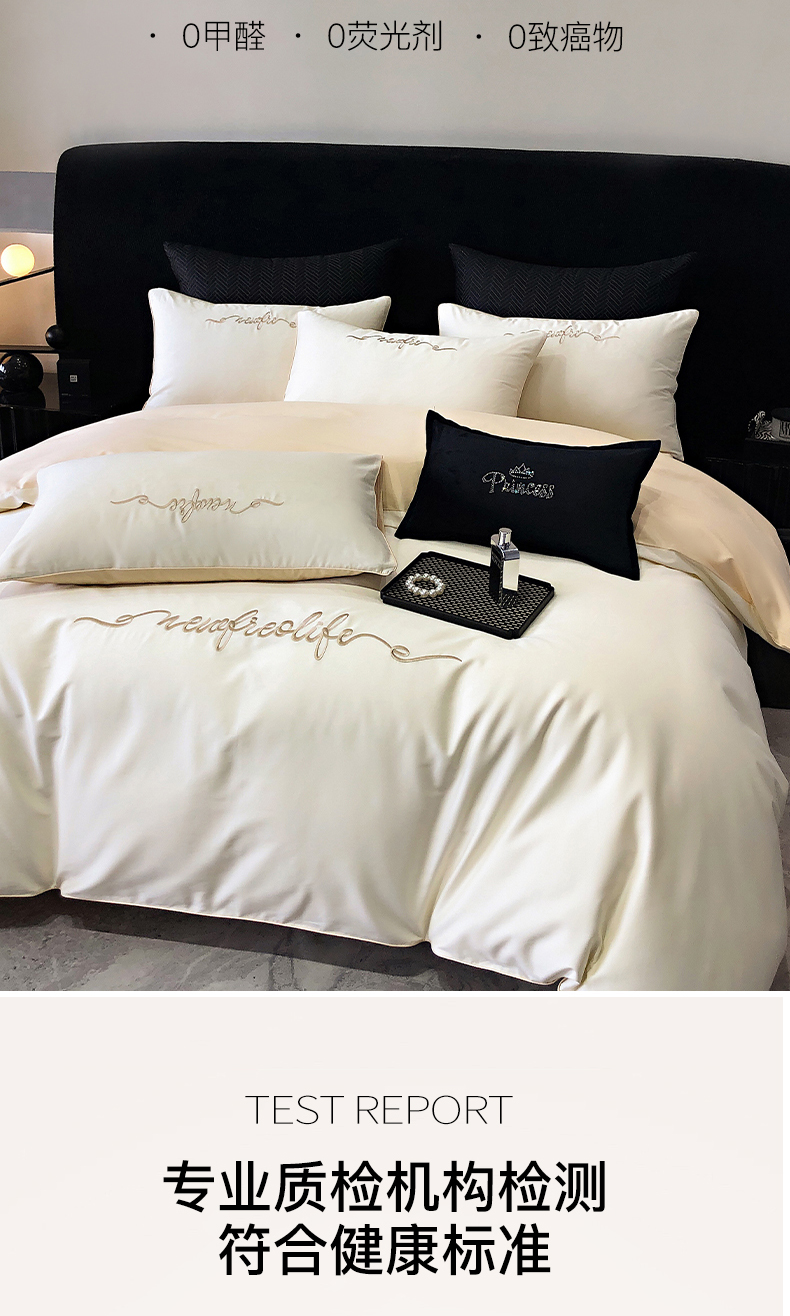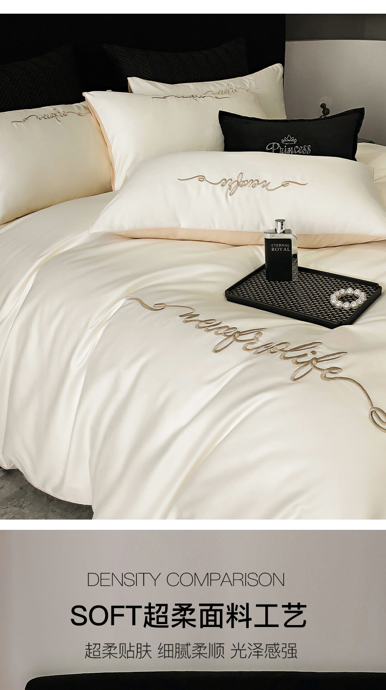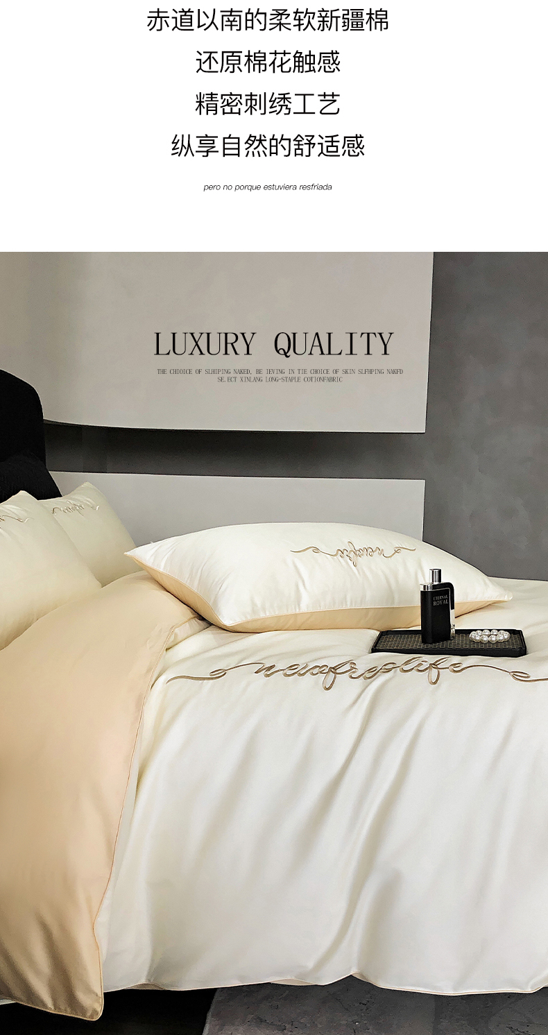禧澜庭 2026新款高支纯棉全棉斜纹四件套刺绣绣花款轻奢三件套--卡罗系列 皓月白+卡其