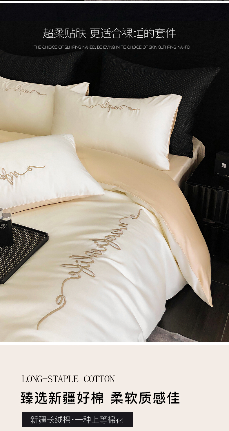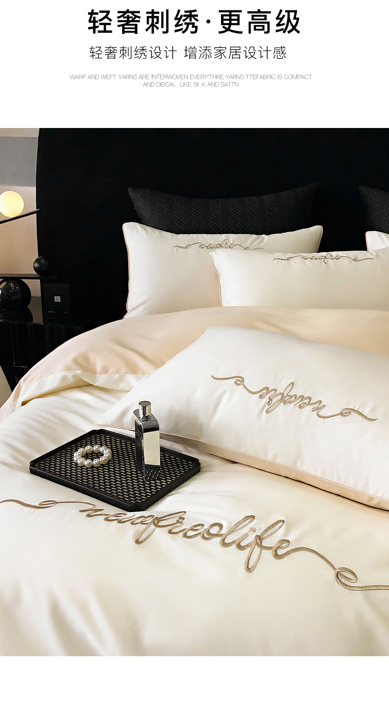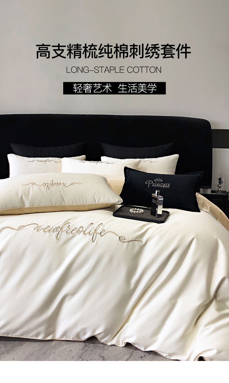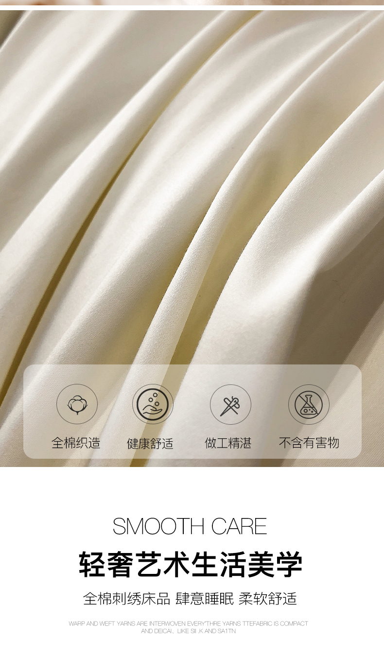 商品名称:禧澜庭 2026新款高支纯棉全棉斜纹四件套刺绣绣花款轻奢三件套--卡罗系列 皓月白+卡其