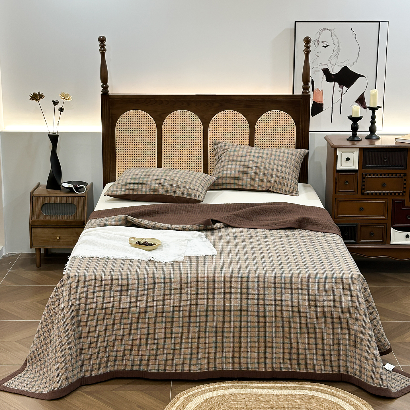 商品名称:床盖工厂店 2026新款双面水洗全棉填充棉花床盖三件套-重楼格系列 重楼咖
