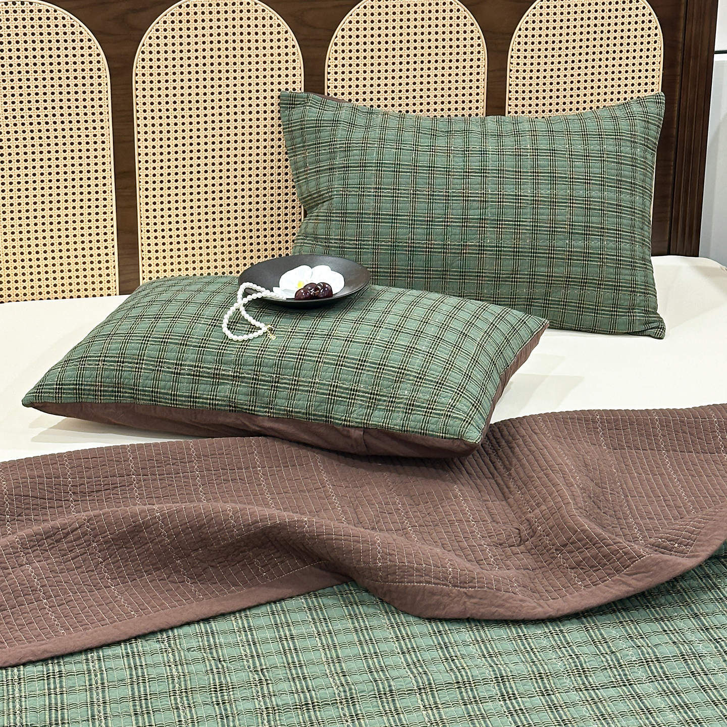 (总)床盖工厂店 2026新款双面水洗全棉填充棉花床盖三件套-重楼格系列,组合图,重楼黑,重楼咖,重楼兰,重楼绿