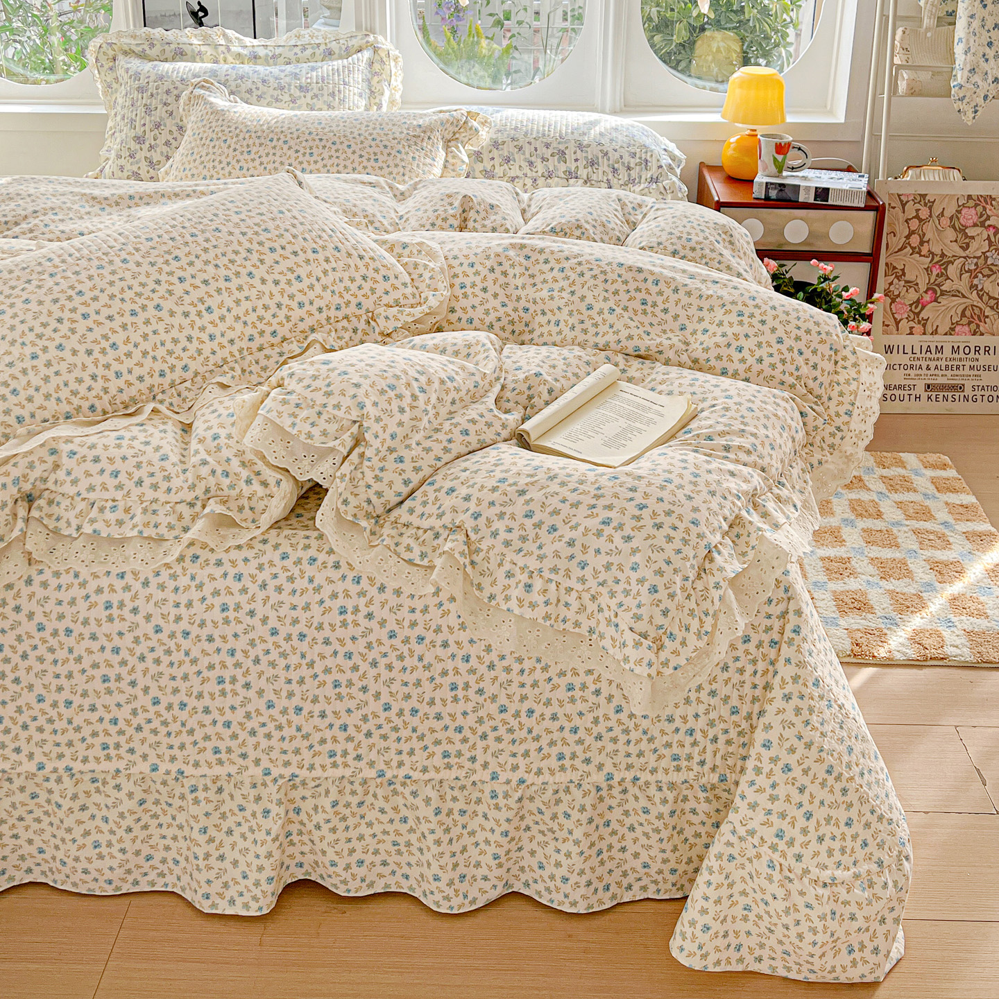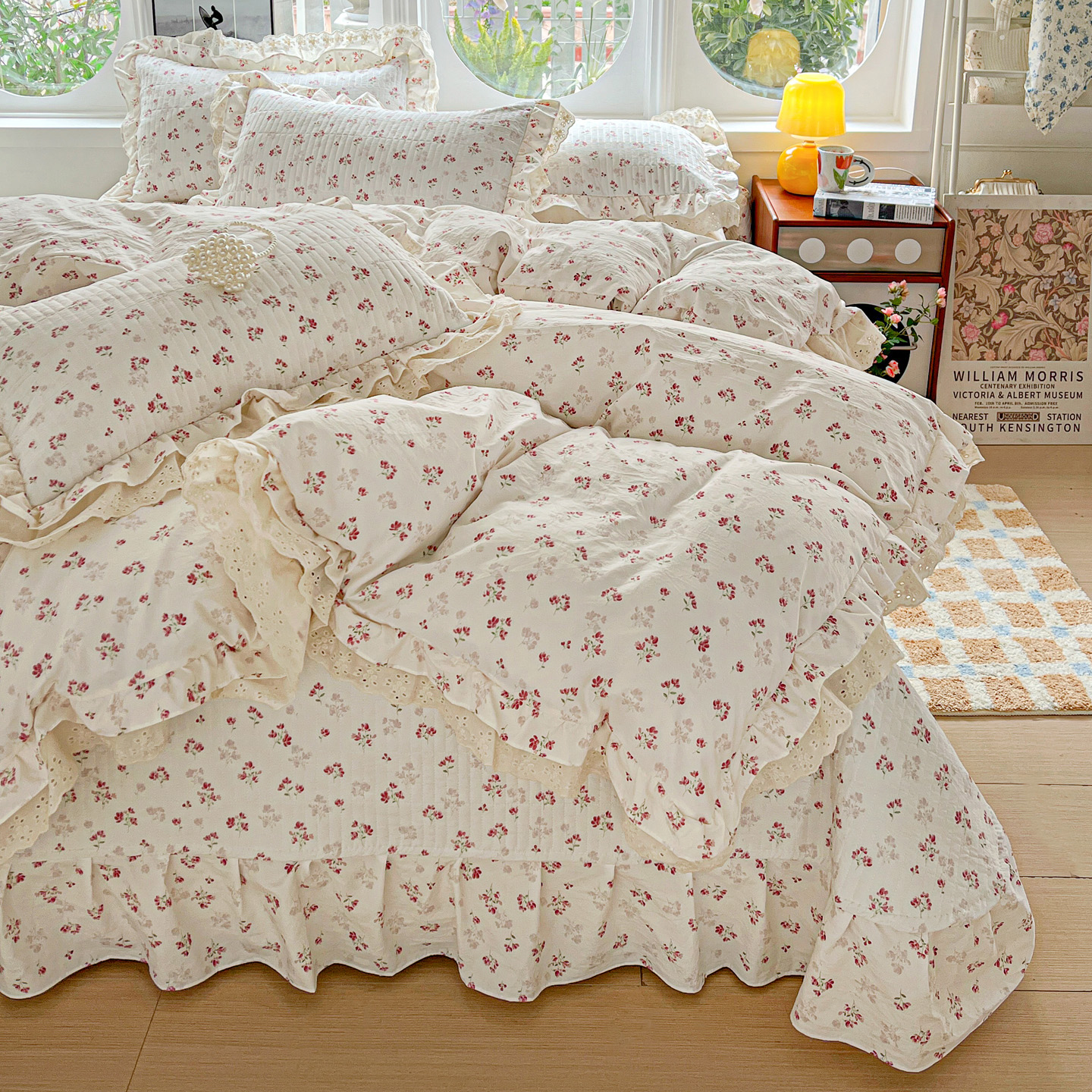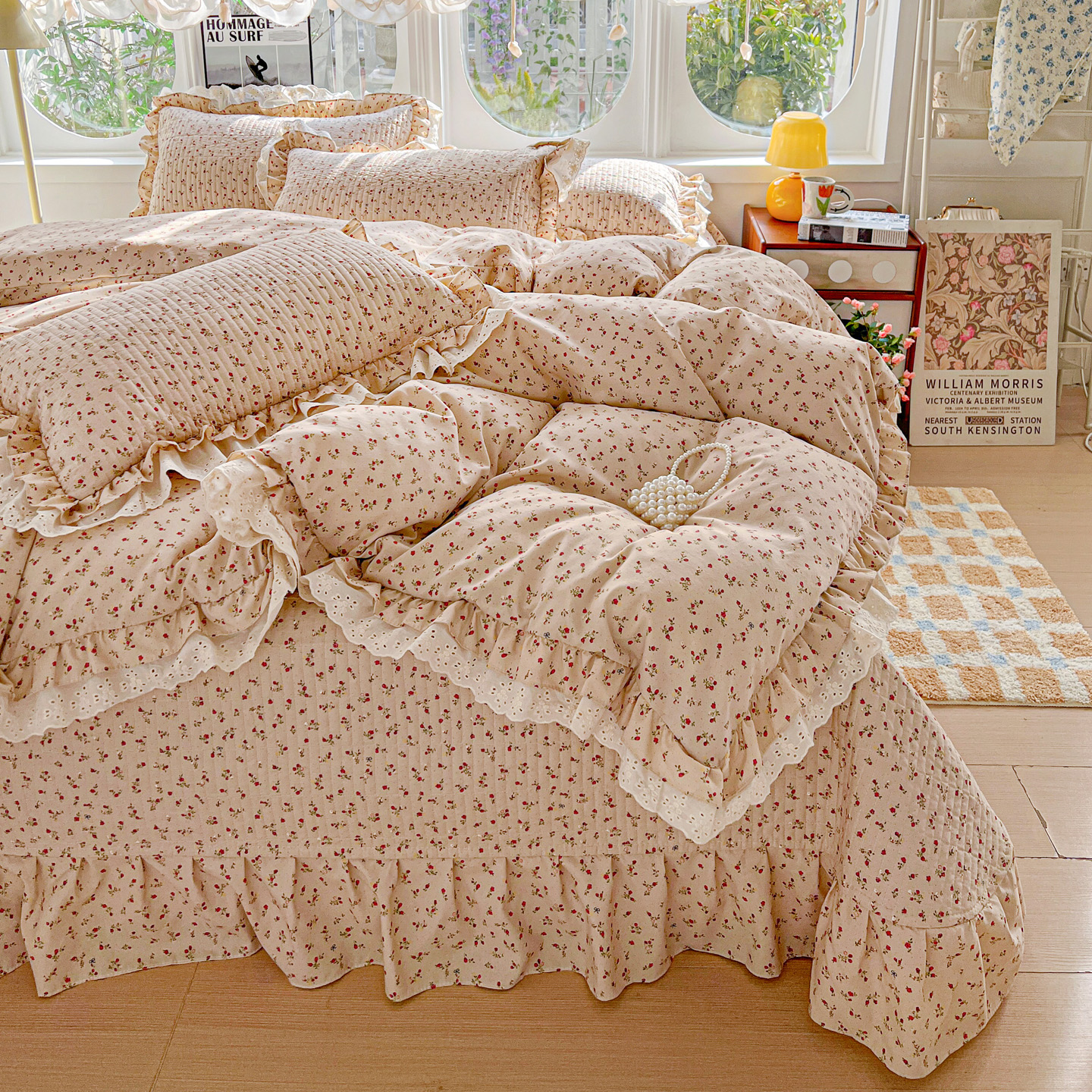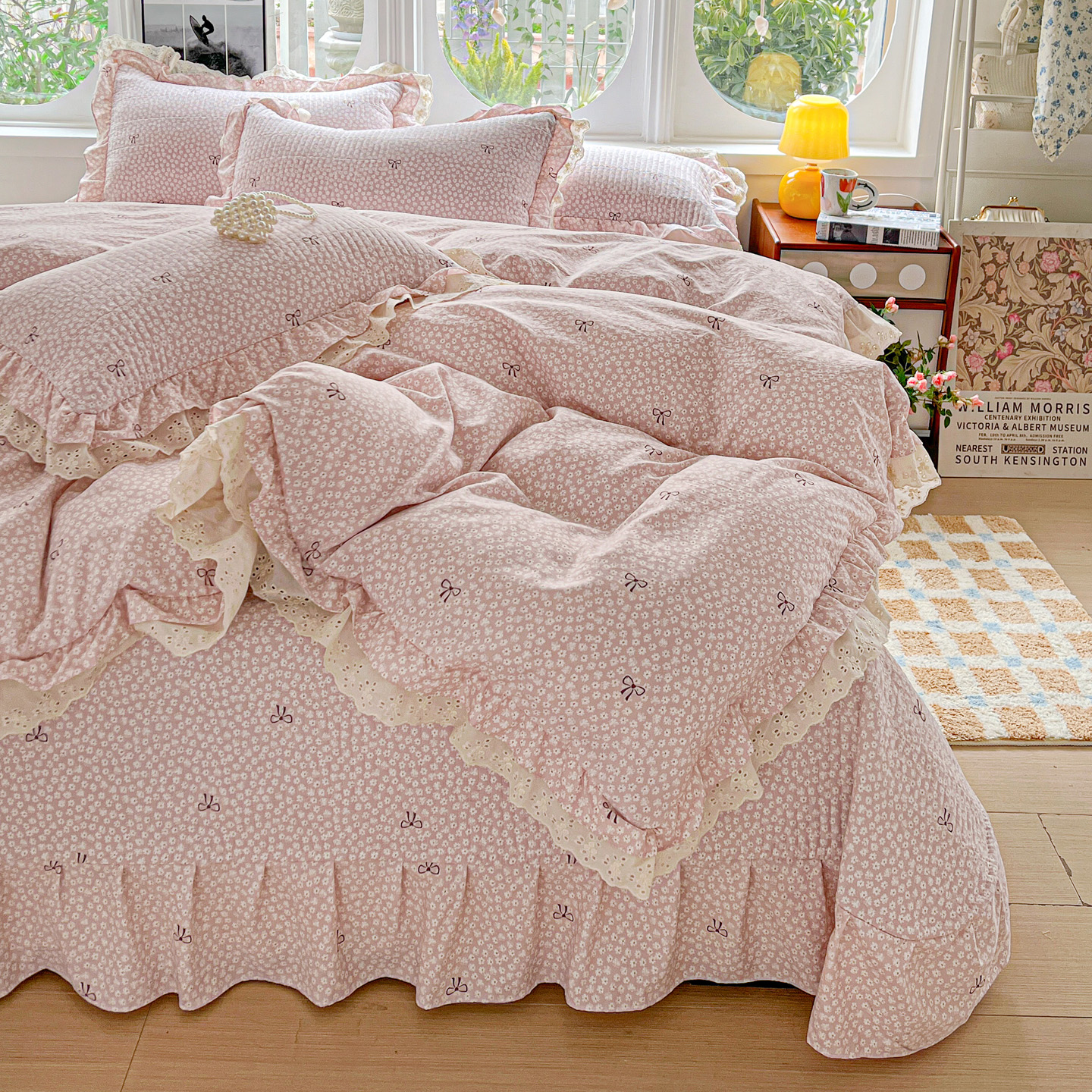梦莱斯 2026新款小清新可爱风纯棉花边床盖四件套 焦糖小玫瑰