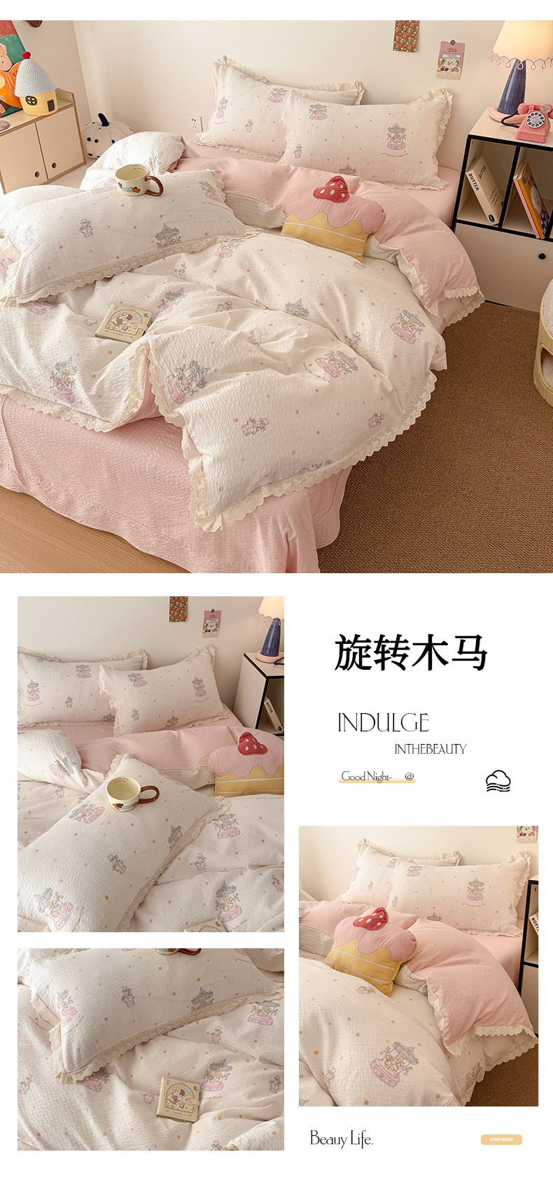 商品名称:吾欢心 2026春夏新款韩版纯棉花边泡芙双层纱四件套 粉粉甜心