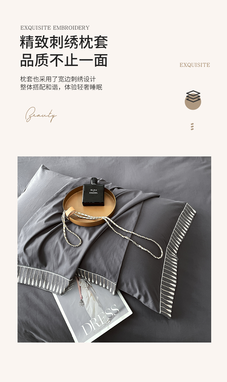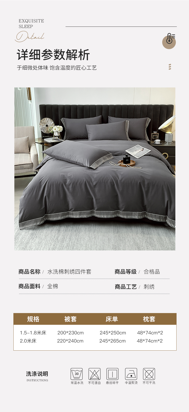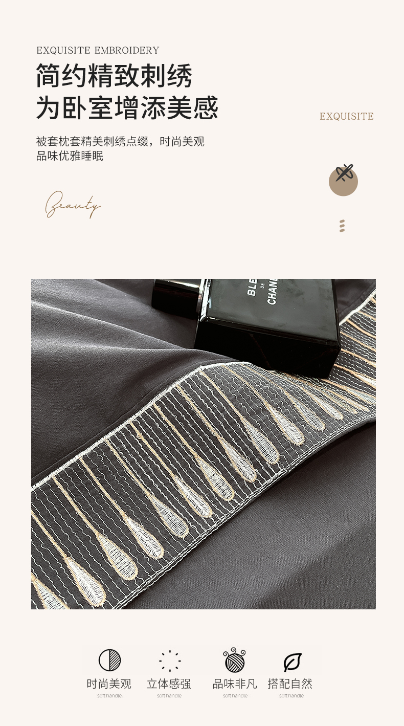 商品名称:拼社家纺 2026新款A类色织全棉水洗棉四件套纯棉四件套刺绣床上用品-黛妮卡系列 黛妮卡-水墨灰