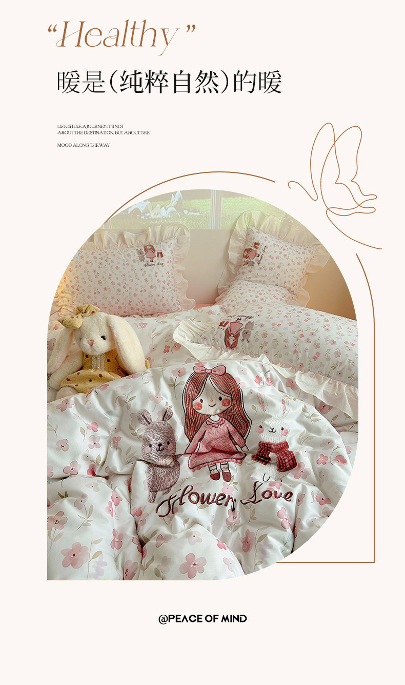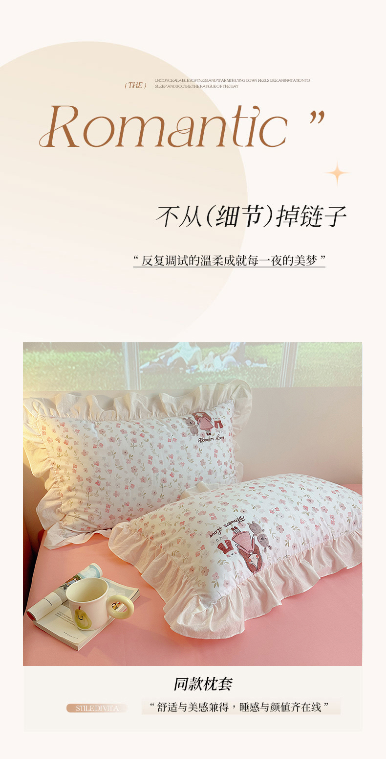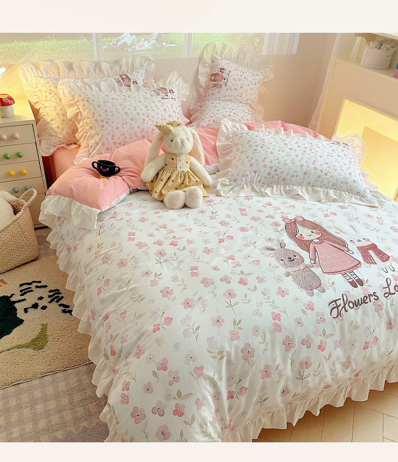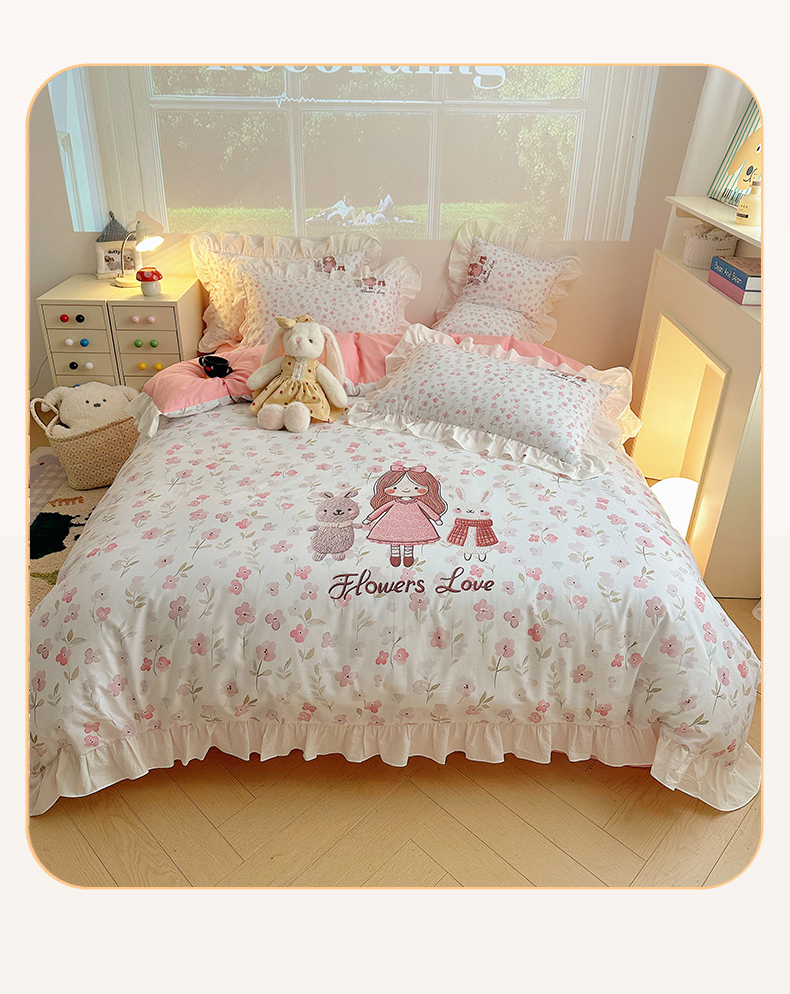 当前位置: 91家纺网 > 商品网购 > 床品套件 > 四件套 > 全棉普通四件套 > 孩子王家纺 2026新款韩式INS减龄小红书仿绣花花边款全棉纯棉卡通四件套 花漾少女与萌友