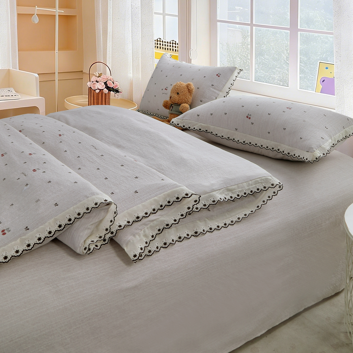 当前位置: 91家纺网 > 商品网购 > 床品套件 > 四件套 > 全棉普通四件套 > 恋之语 2026新款全棉花边色织水洗棉花边四件套 草莓气泡