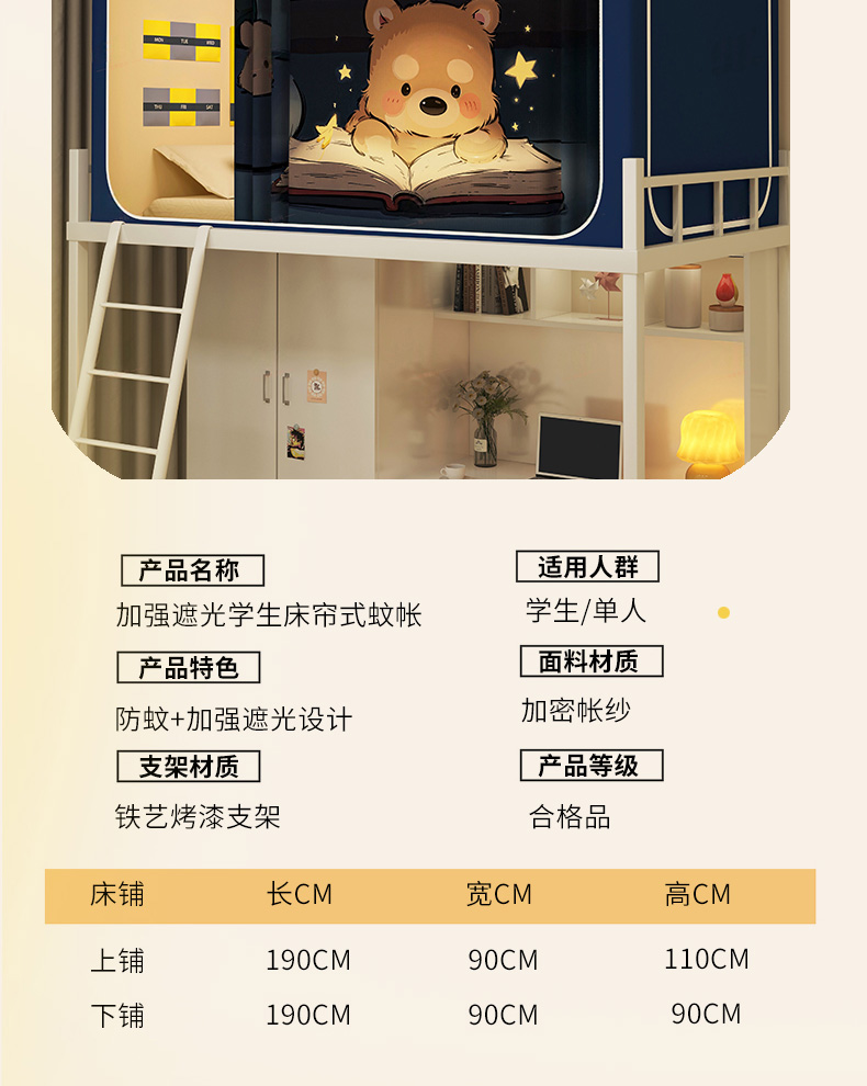 80,90上下铺通用(带靠墙帘):80-100宽x190长x90-120高(宽高伸缩支架) | ¥108.00 |