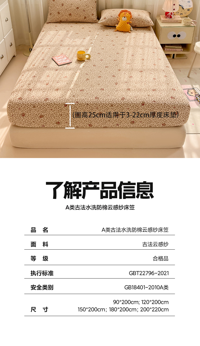 商品名称:(总)仟网汇 2026新款A类古法水洗棉云感纱单床笠床笠单件