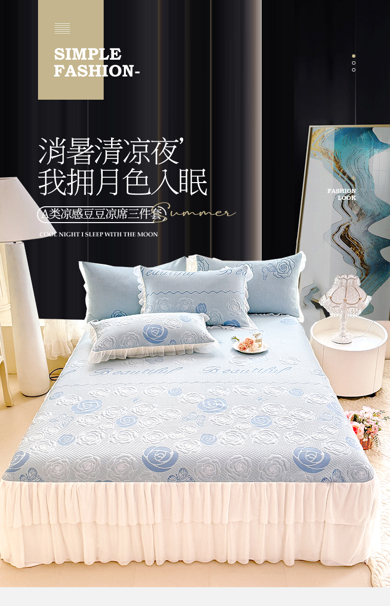 绒棉世家 2026新款A类凉感豆豆席三件套床裙款软席子 花韵-山灰