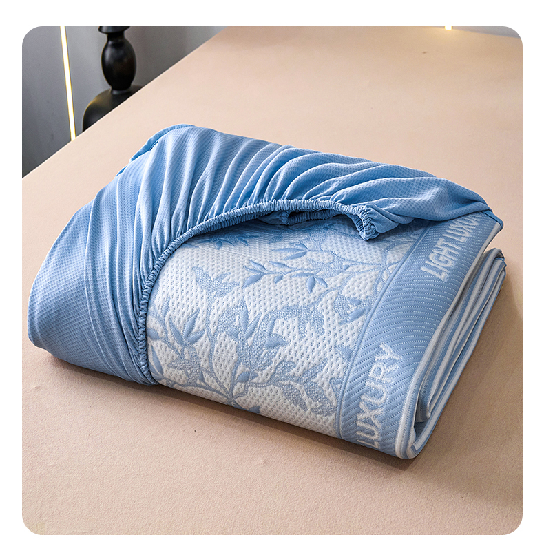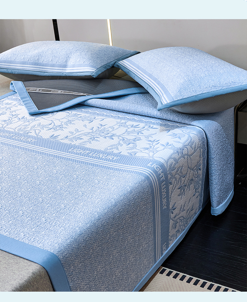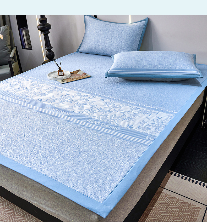 宜派家纺 2026新款提花PE凉感冰丝席凉席席子三件套 风景-床笠蓝