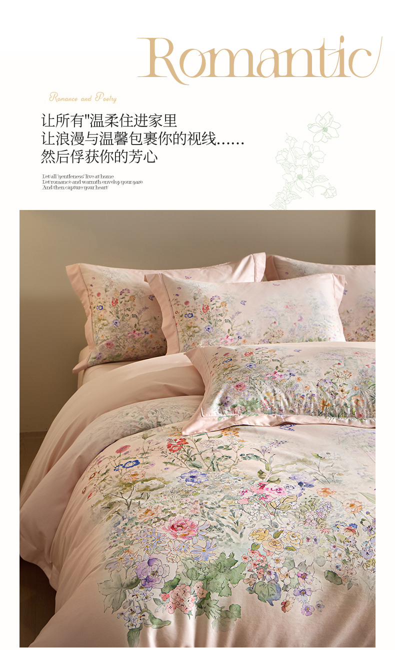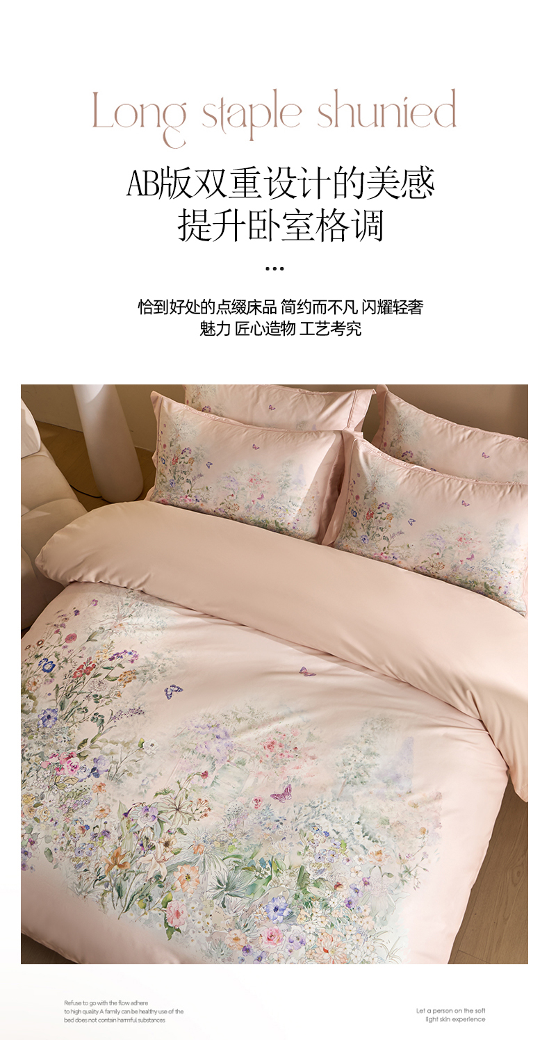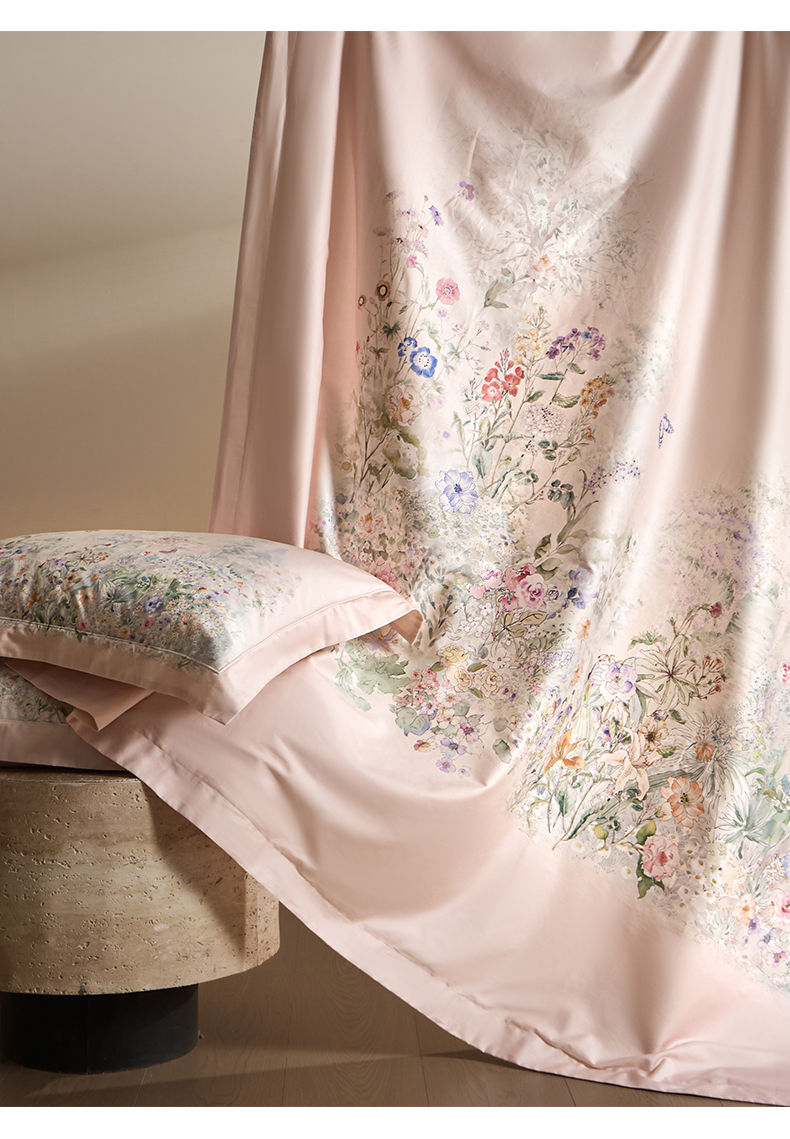 U品汇 2026新品纯棉全棉平网大版数码印花四件套高端60支长绒棉贡缎埋绳宽边系列 雾花蝶影(粉)