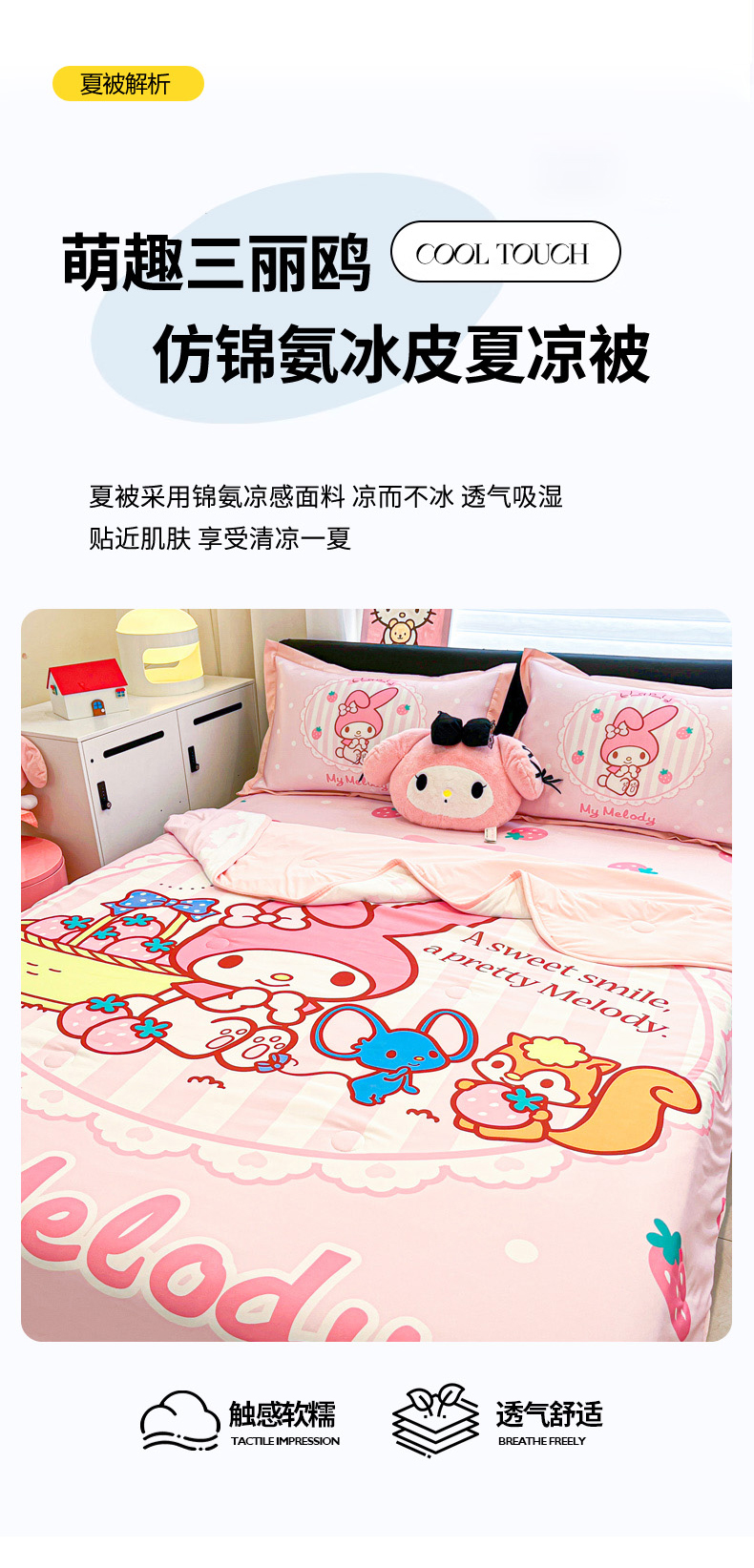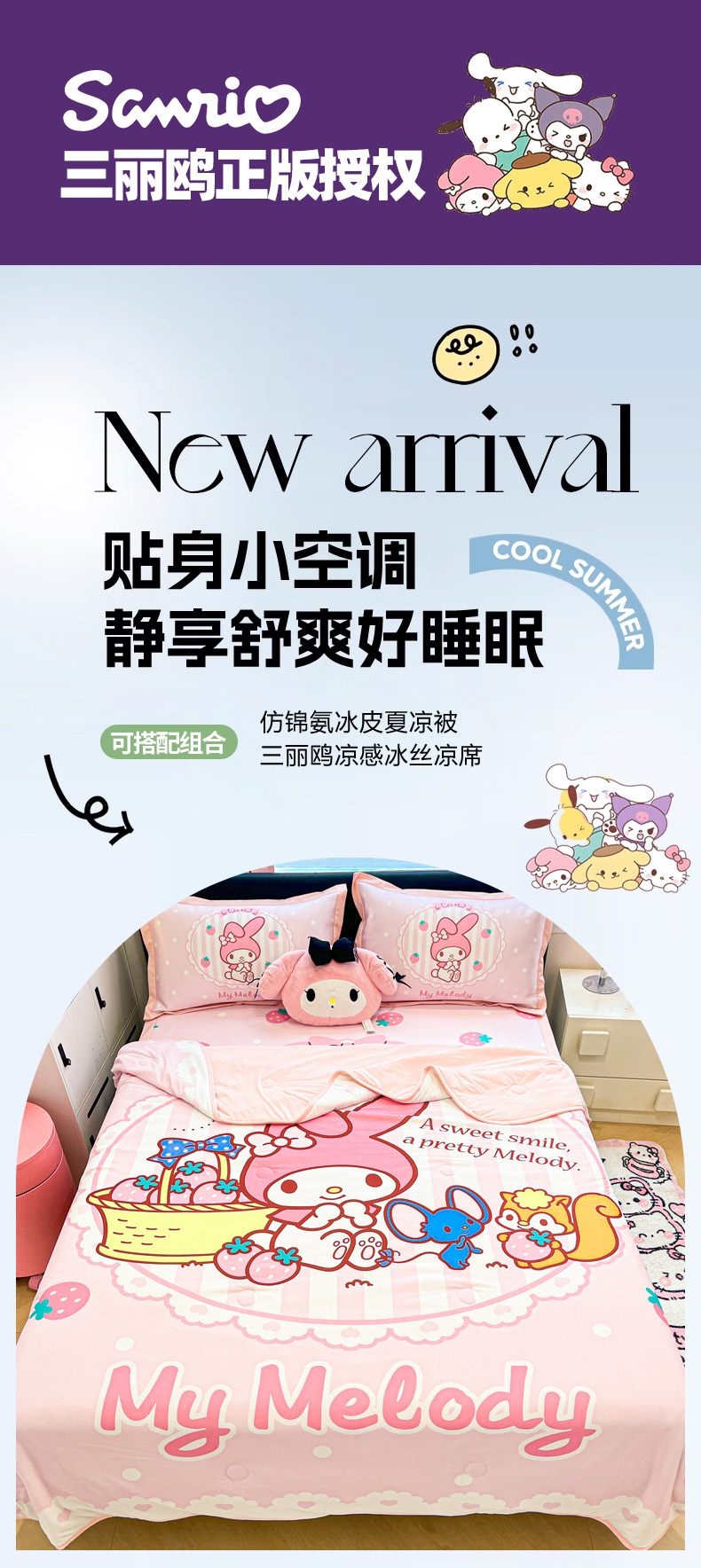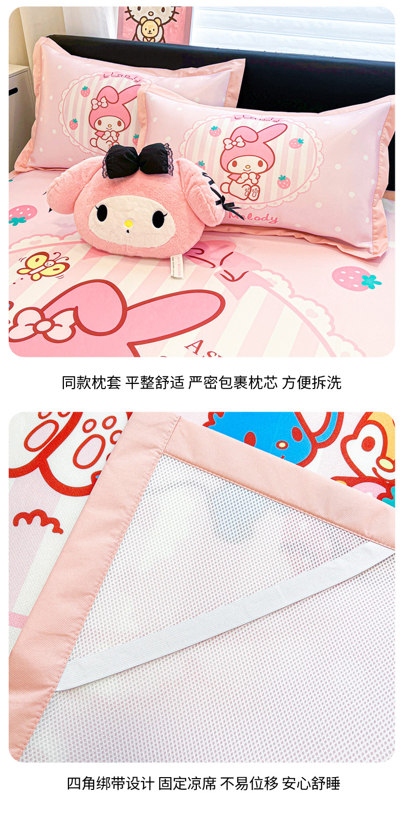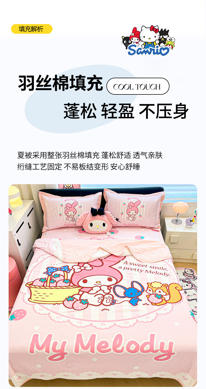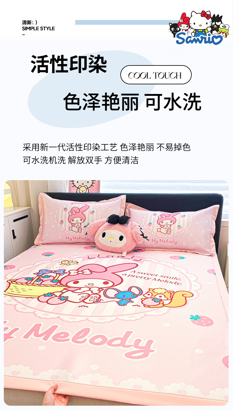 当前位置: 91家纺网 > 商品网购 > 床上用品 > 凉席 > 冰丝席 > 暮思家居 2026新款正版授权A类大版数码印花三丽鸥1200D冰丝凉席可组合仿锦氨夏被 平铺款-草莓美乐蒂