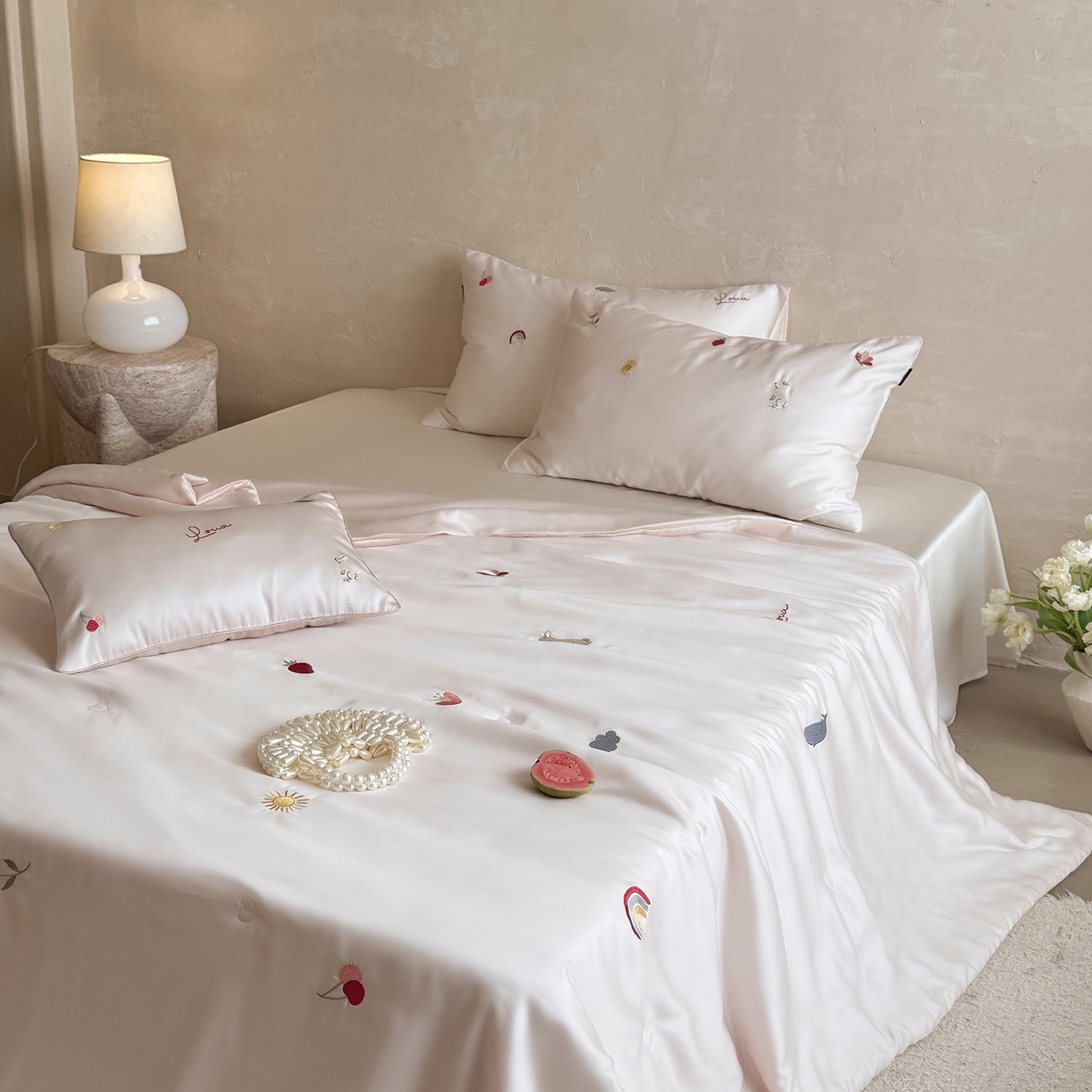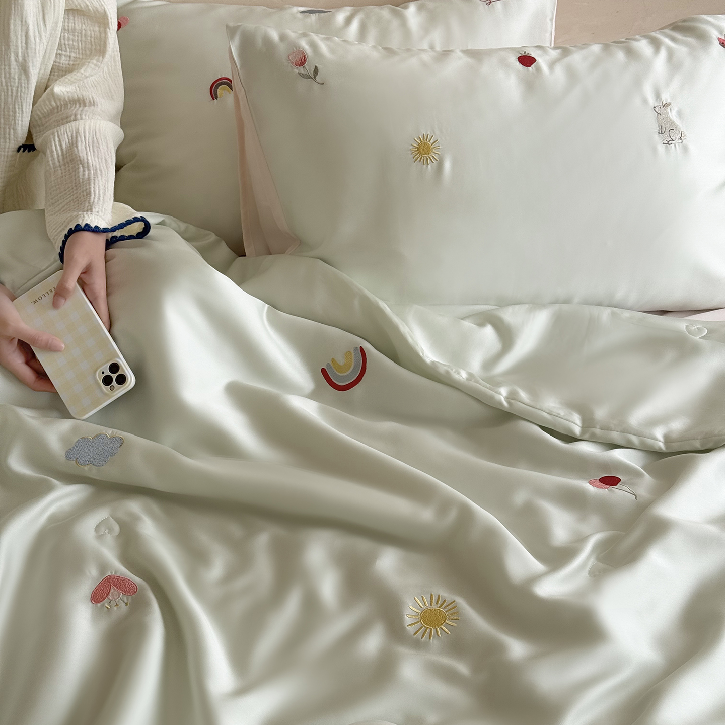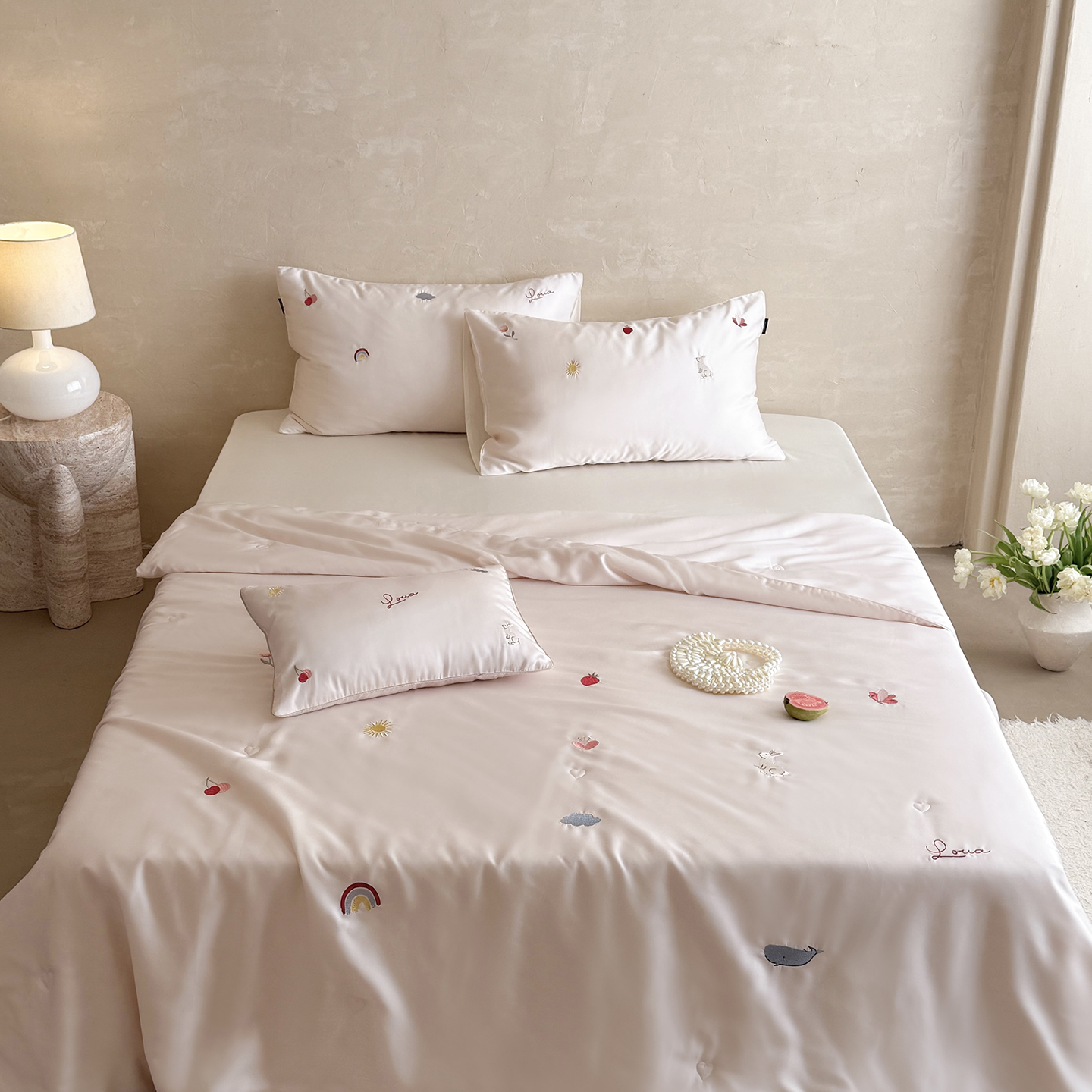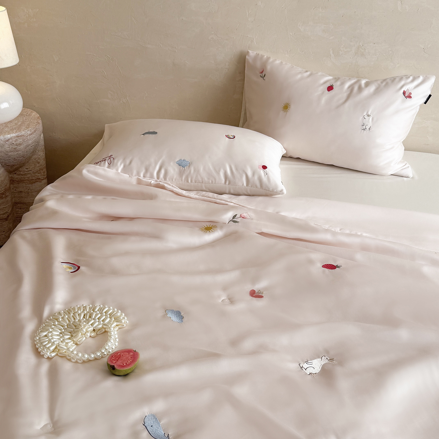 当前位置: 91家纺网 > 商品网购 > 被子 > 莱赛尔夏被 > 鹿班家居 2026夏季新品60S兰精天丝刺绣夏被系列-彩虹小兔 粉&白