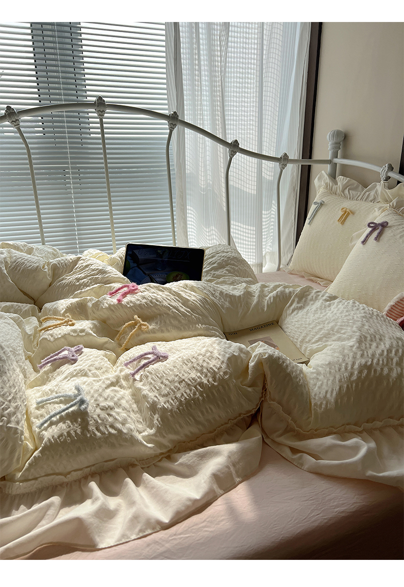 当前位置: 91家纺网 > 商品网购 > 床品套件 > 四件套 > 其它四件套 > 顾里家纺 2026新款韩系仙女泡泡纱丝带四件套 蜜桃丝带