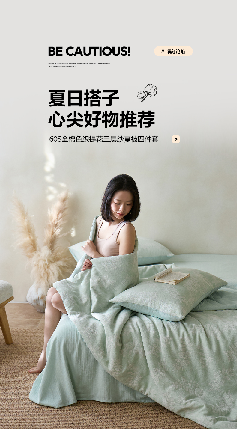 • 91家纺网 家纺一手货源 找家纺 如一 2026新款60S全棉色织提花三层纱夏被四件套-诗韵系列 诗韵绿