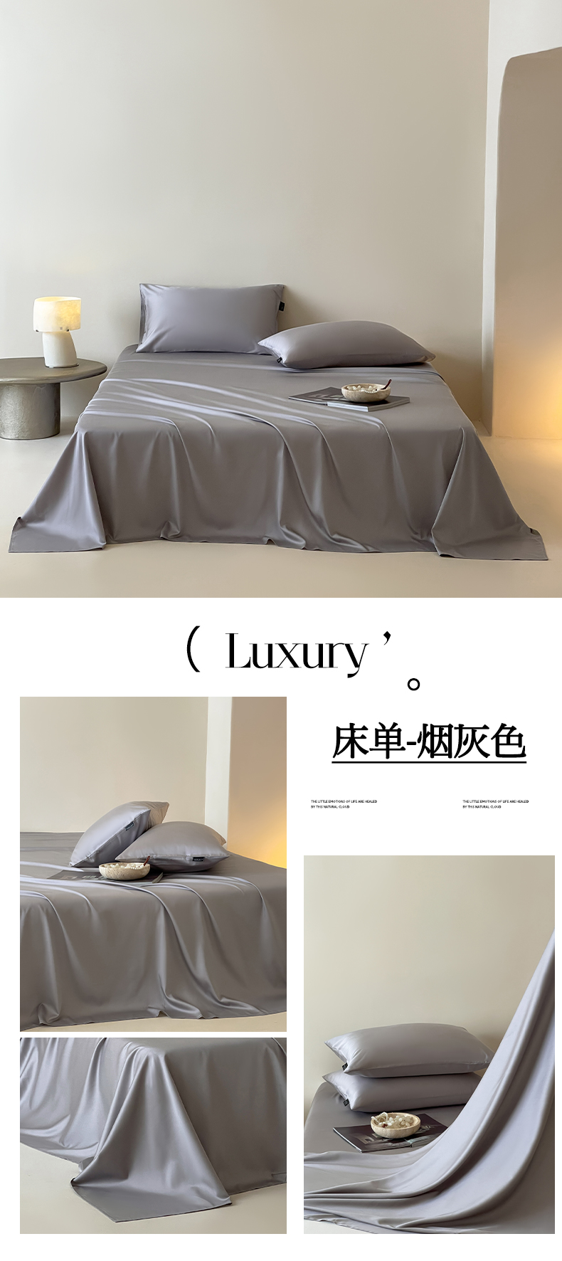 (总)三味舒屋 2026新款凉风小奢绸60S兰精天丝纯色单品系列-单床单床单单件,极光蓝,斯卡其粉,象牙白,雅灰,烟灰色,珍珠白,紫铜色,组合图仅供展示-不可下单