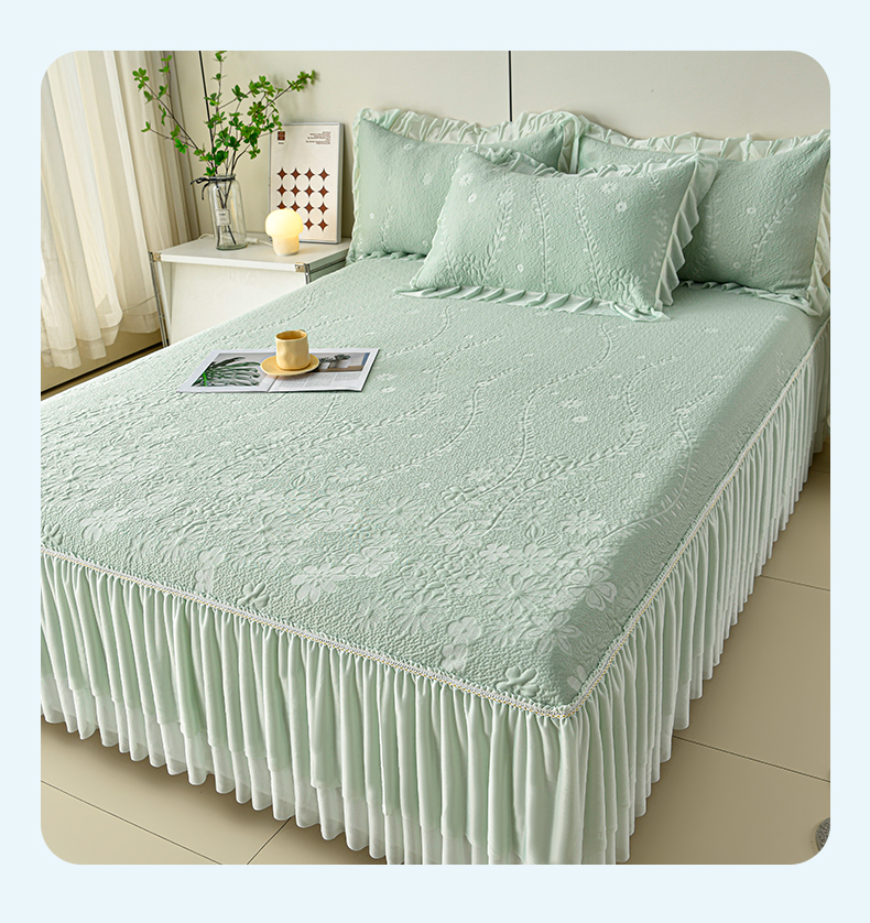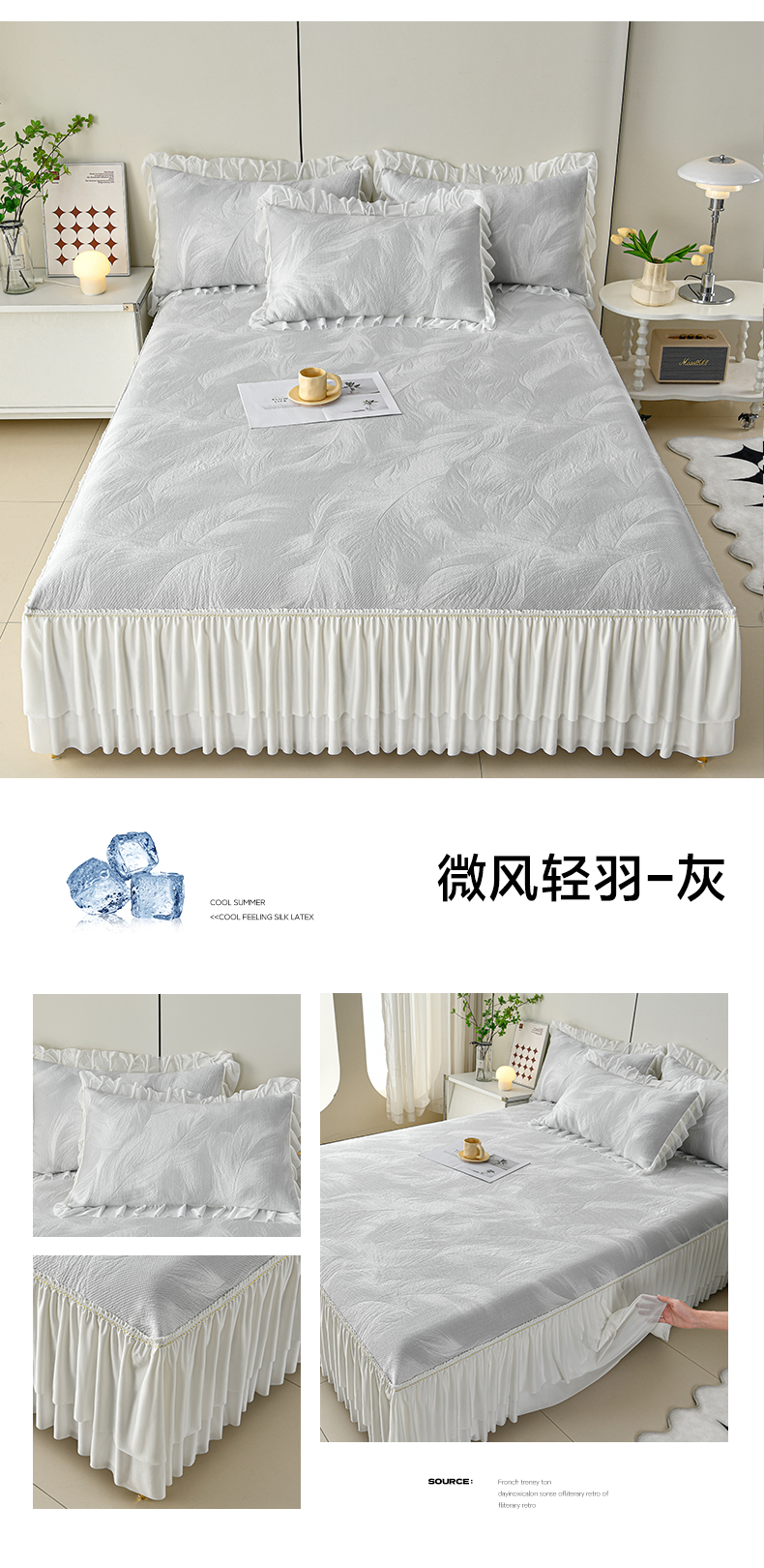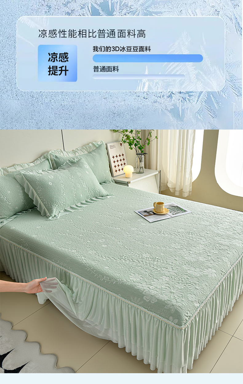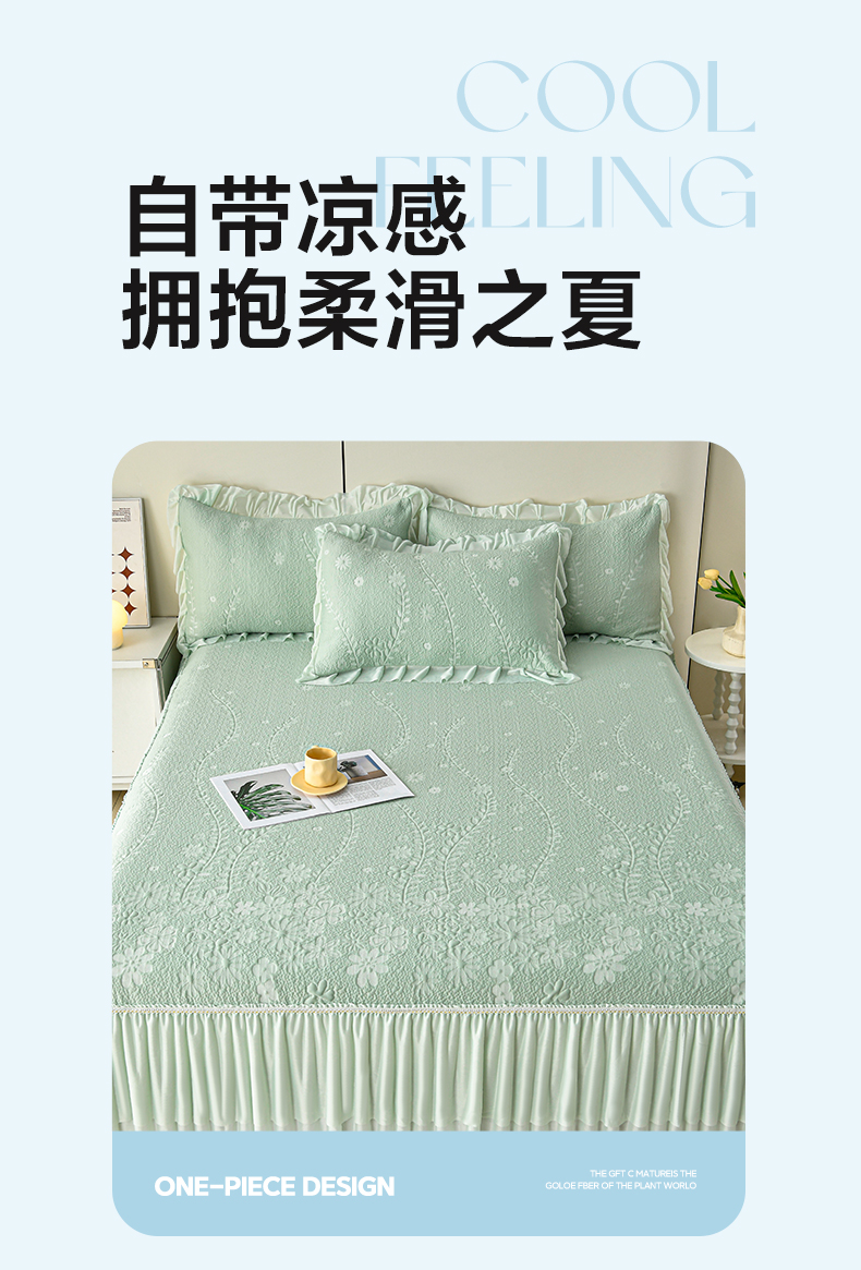(总)畅畅家纺 2026新款锦氨夏被PE凉感豆豆凉席绣花三明治复合床裙三件套四件套,格韵-粉-床裙款,格韵-灰-床裙款,格韵-蓝-床裙款,格韵-绿-床裙款