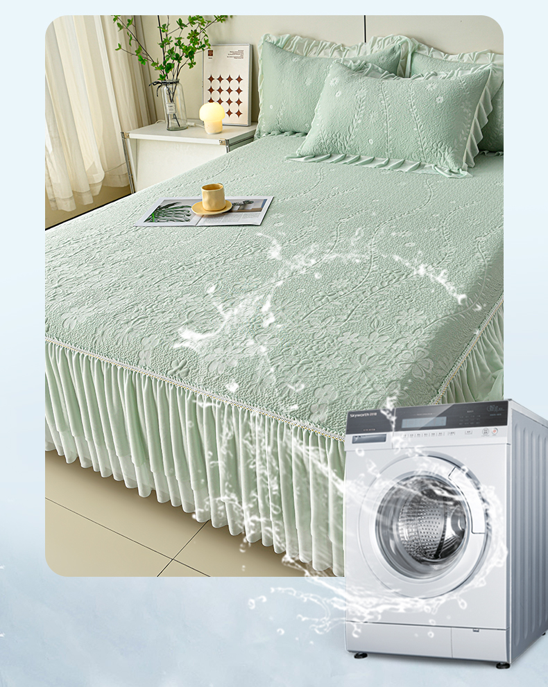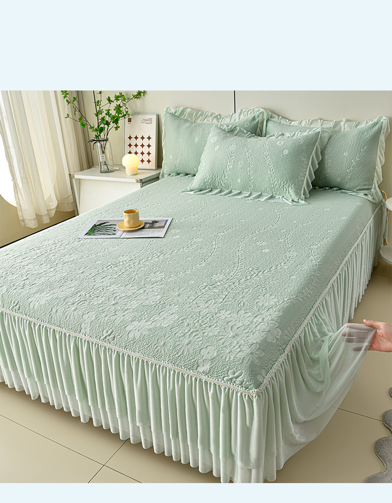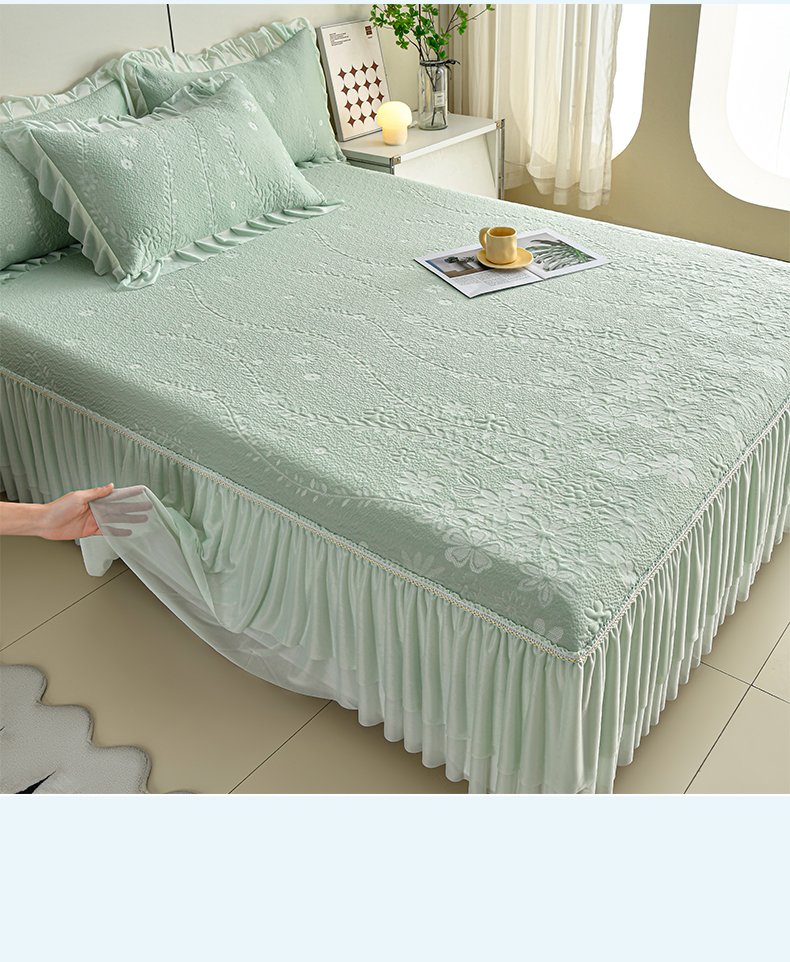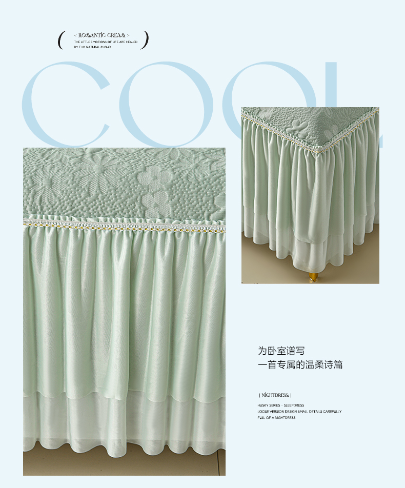 (总)畅畅家纺 2026新款锦氨夏被PE凉感豆豆凉席绣花三明治复合床裙三件套四件套,格韵-粉-床裙款,格韵-灰-床裙款,格韵-蓝-床裙款,格韵-绿-床裙款