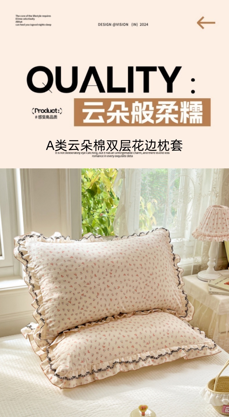 (总)圣比熊 2026新款A类云朵棉蕾丝双层花边枕套宿舍单人单只一只装枕芯48x74cm内胆套,浮影,花时令,花田洛,蓝岛风铃,黎梦,绿涧,苏颜粉,幸运熊,旋转木马,樱桃花语